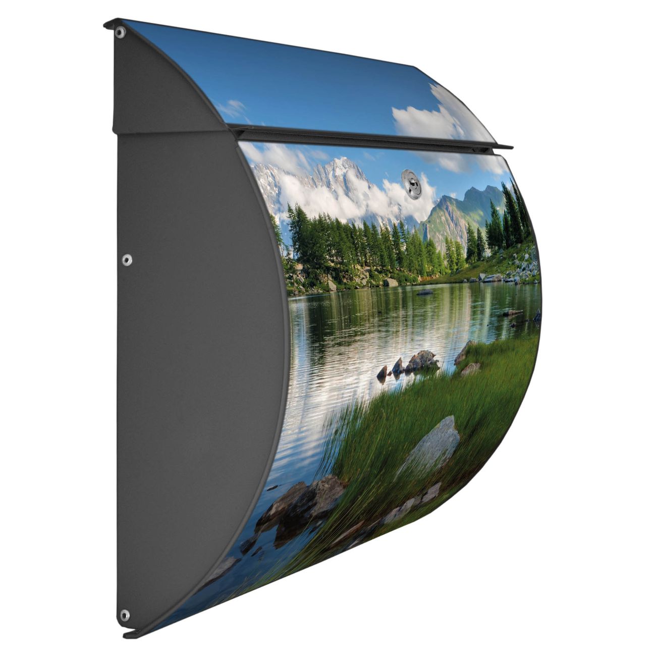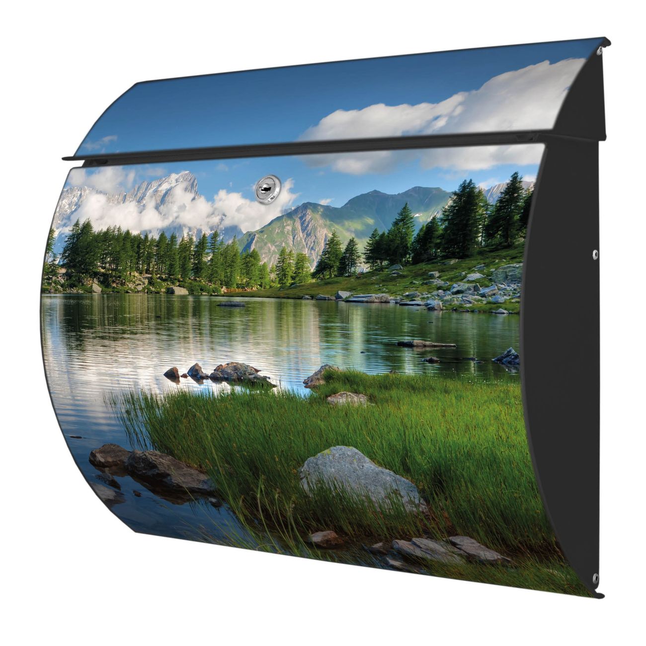 Der geschwungene Burg Wächter Briefkasten Toscana mit Motiv Gebirgssee bietet Ihnen mit seinem großen Fassungsvermögen genügend Platz auch für große A4 Sendungen. Auf Wunsch können Sie bei uns den passenden Standfuß bestellen und so aus dem Wandbriefkasten einen Standbriefkasten machen. Der integrierte Öffnungsstopp ermöglicht eine einfache Handhabung beim Entnehmen der Post.