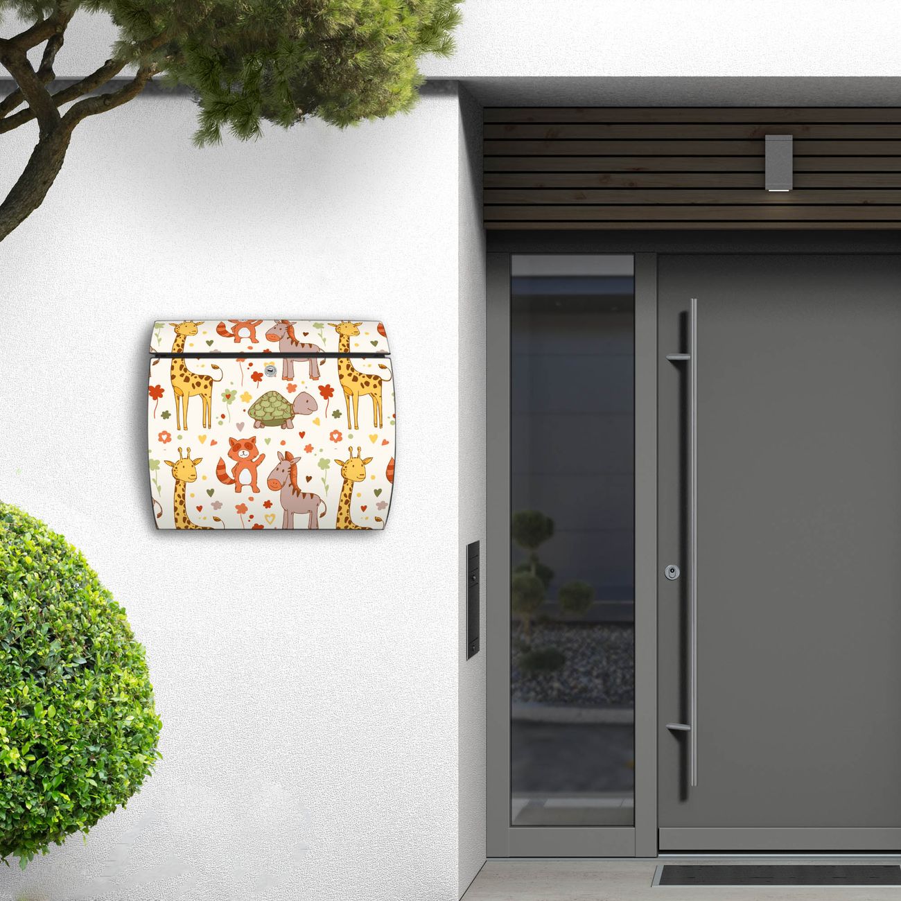 Der geschwungene Burg Wächter Briefkasten Toscana mit Motiv Giraffe & Co bietet Ihnen mit seinem großen Fassungsvermögen genügend Platz auch für große A4 Sendungen. Auf Wunsch können Sie bei uns den passenden Standfuß bestellen und so aus dem Wandbriefkasten einen Standbriefkasten machen. Der integrierte Öffnungsstopp ermöglicht eine einfache Handhabung beim Entnehmen der Post.