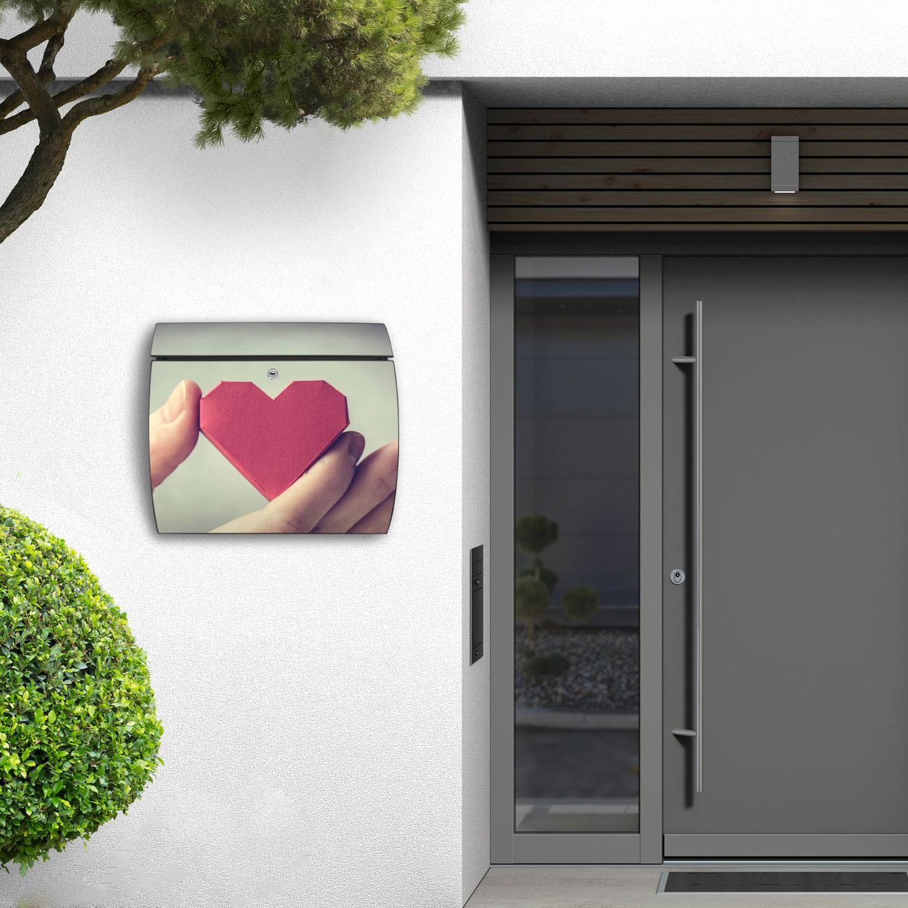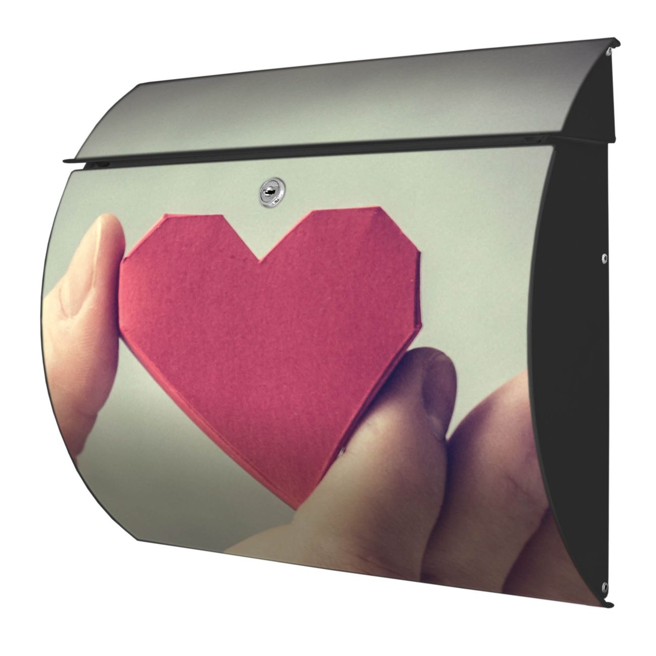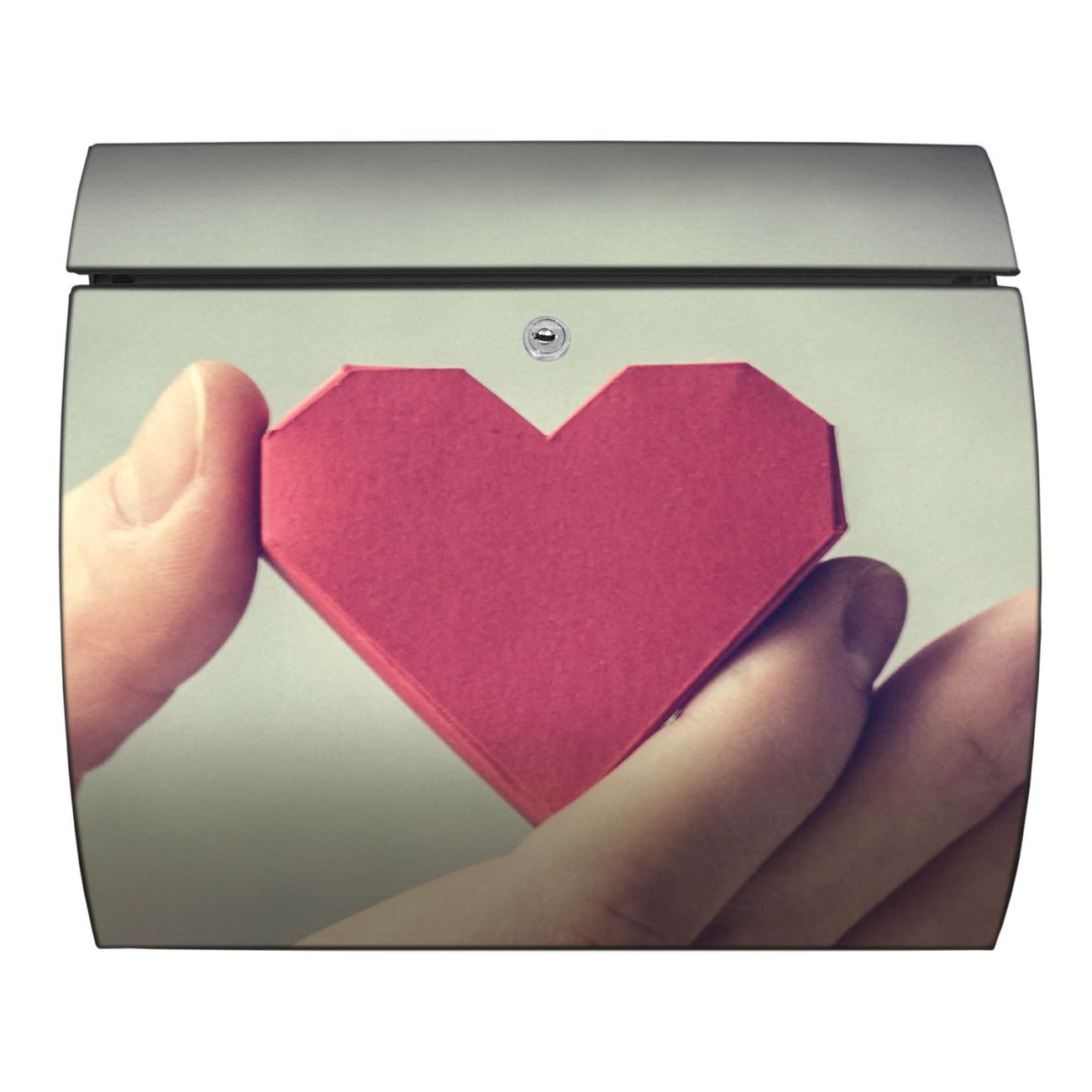 FUNKTION: DESIGN: Das Burg Wächter Modell Toscana mit Motiv Hand Aufs Herz hat ein sehr ansprechendes und zeitloses Design und ist besonderes wetterfest. Heben Sie Sich von der tristen grauen Masse ab, ohne auf Funktionalität zu verzichten. Wir bieten Ihnen ebenfalls Namensschilder, bereits beschriftet oder frei zu beschriften, und verschiedene selbst gestaltete Bitte-Keine-Werbung-Aufkleber. DETAILS: Der Postkasten besteht aus vollflächig verzinktem Stahl welcher in Anthrazit oder Weiß lackiert wurde oder aus Edelstahl (je nach gewählter Variante). Das Motiv besteht aus einer wetter- und UV-festen Folie, die mit einem Schutzlaminat überzogen ist, durch die Ihren Briefkasten zusätzlich vor Kratzern geschützt ist und auf den Briefkasten kaschiert wurde. Sie erhalten zu Ihrem neuen Design Briefkasten 2 Schlüssel sowie das passende Montagematerial. BANJADO: Ihr Briefkasten wird von Burg Wächter in Deutschland gefertigt und in unserer kleinen Manufaktur von Hand veredelt. Die Motivfolie ist lösungsmittelfrei und schutzlaminiert, dies sorgt für einen langen Halt. Wir legen großen Wert auf die Verbindung von Funktionalität und Design. Sie erhalten besondere Handarbeit aus Sachsen und Made in Germany.