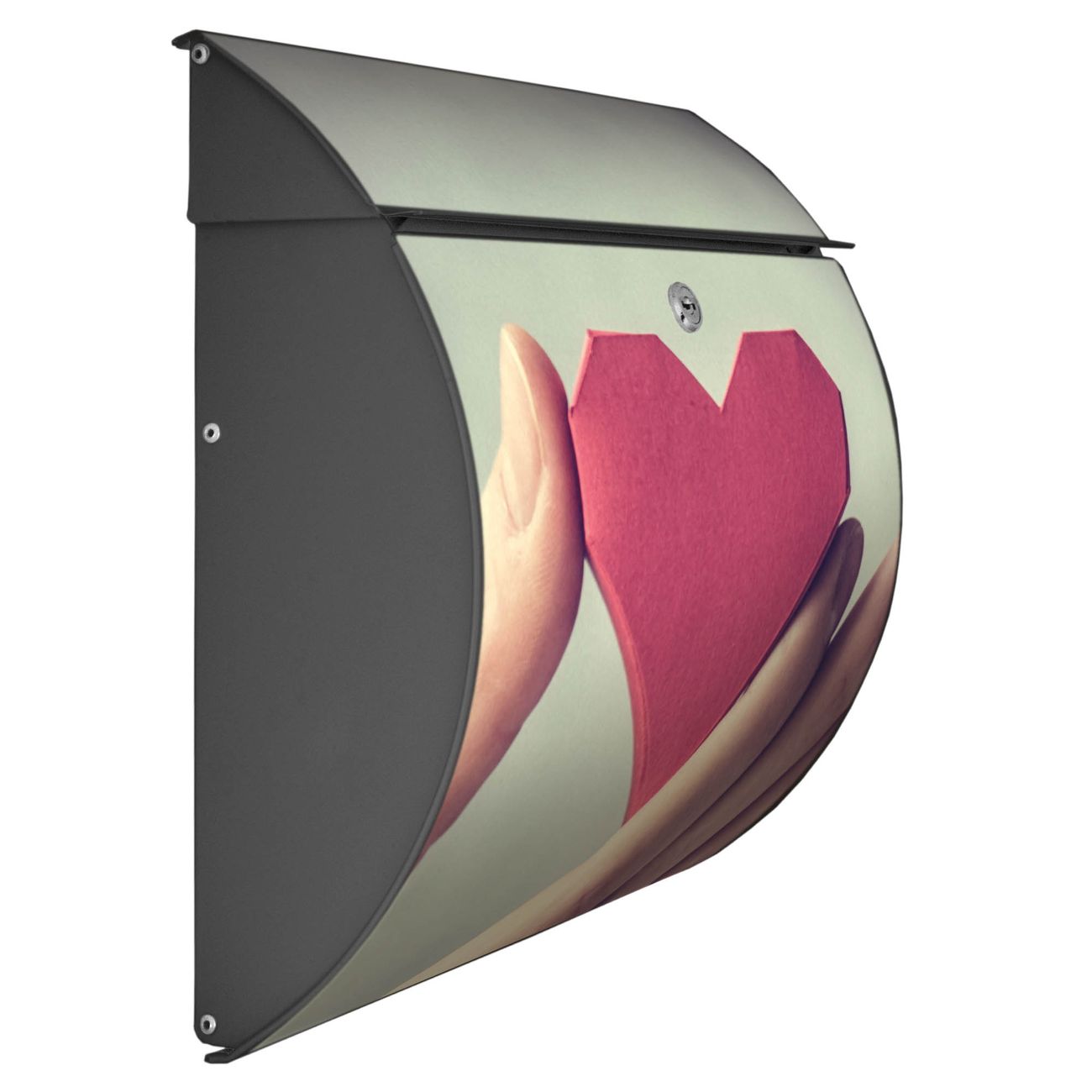 Der geschwungene Burg Wächter Briefkasten Toscana mit Motiv Hand Aufs Herz bietet Ihnen mit seinem großen Fassungsvermögen genügend Platz auch für große A4 Sendungen. Auf Wunsch können Sie bei uns den passenden Standfuß bestellen und so aus dem Wandbriefkasten einen Standbriefkasten machen. Der integrierte Öffnungsstopp ermöglicht eine einfache Handhabung beim Entnehmen der Post.