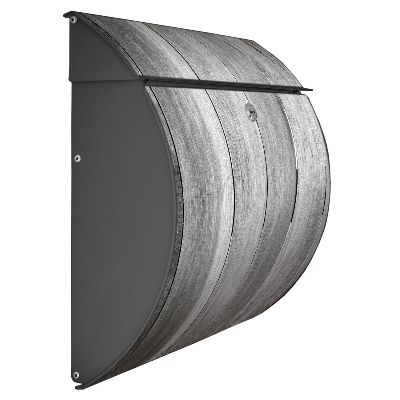 Der geschwungene Burg Wächter Briefkasten Toscana mit Motiv Holz Monochrom bietet Ihnen mit seinem großen Fassungsvermögen genügend Platz auch für große A4 Sendungen. Auf Wunsch können Sie bei uns den passenden Standfuß bestellen und so aus dem Wandbriefkasten einen Standbriefkasten machen. Der integrierte Öffnungsstopp ermöglicht eine einfache Handhabung beim Entnehmen der Post.