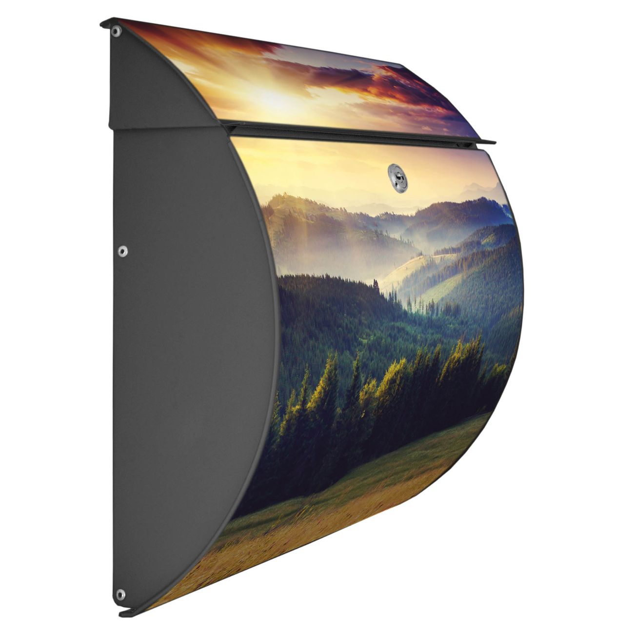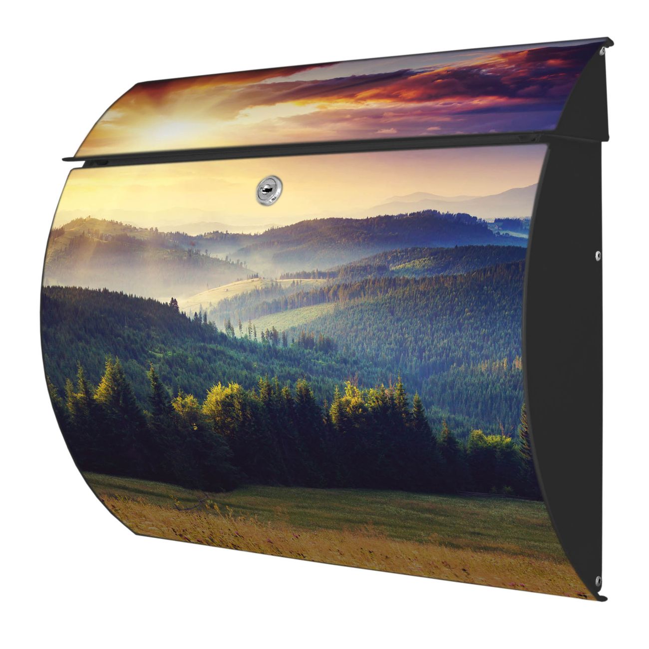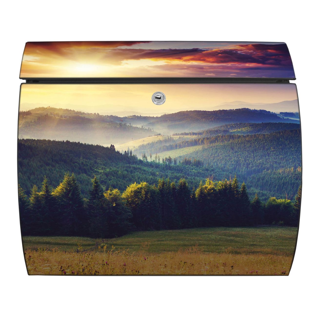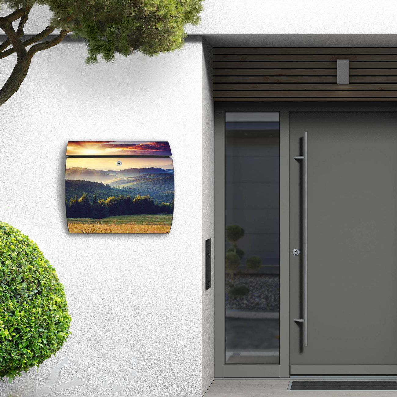 Der geschwungene Burg Wächter Briefkasten Toscana mit Motiv Karpaten Sonnenuntergang bietet Ihnen mit seinem großen Fassungsvermögen genügend Platz auch für große A4 Sendungen. Auf Wunsch können Sie bei uns den passenden Standfuß bestellen und so aus dem Wandbriefkasten einen Standbriefkasten machen. Der integrierte Öffnungsstopp ermöglicht eine einfache Handhabung beim Entnehmen der Post.