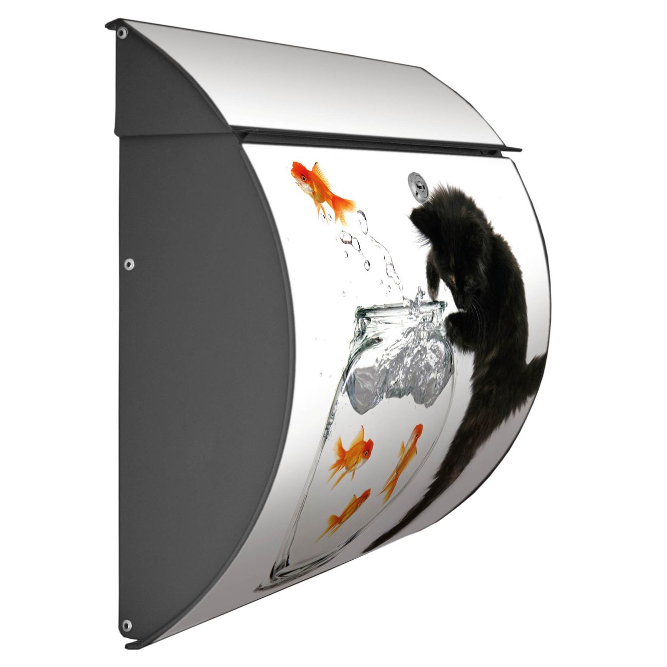Der geschwungene Burg Wächter Briefkasten Toscana mit Motiv Katze Und Fisch bietet Ihnen mit seinem großen Fassungsvermögen genügend Platz auch für große A4 Sendungen. Auf Wunsch können Sie bei uns den passenden Standfuß bestellen und so aus dem Wandbriefkasten einen Standbriefkasten machen. Der integrierte Öffnungsstopp ermöglicht eine einfache Handhabung beim Entnehmen der Post.