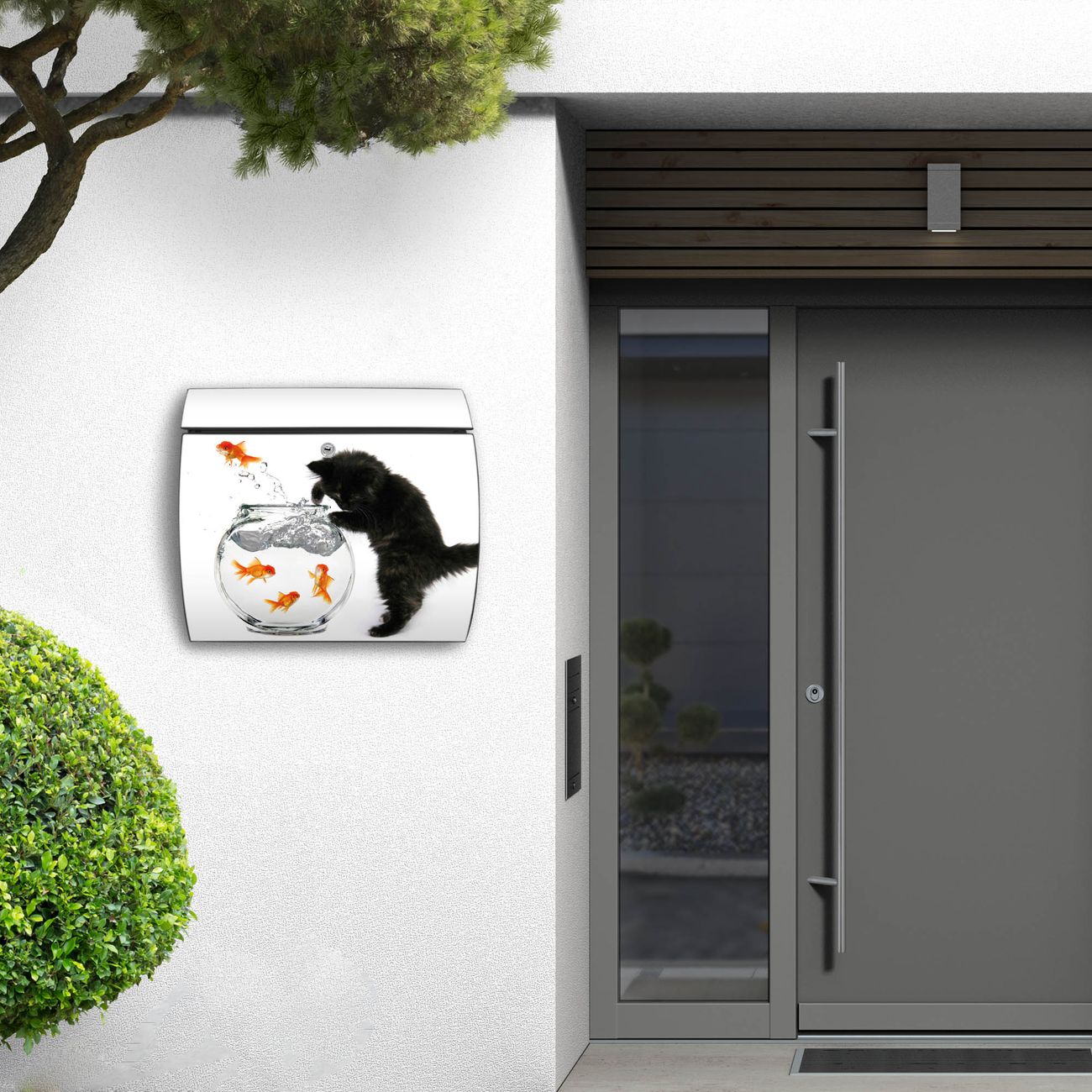 FUNKTION: DESIGN: Das Burg Wächter Modell Toscana mit Motiv Katze Und Fisch hat ein sehr ansprechendes und zeitloses Design und ist besonderes wetterfest. Heben Sie Sich von der tristen grauen Masse ab, ohne auf Funktionalität zu verzichten. Wir bieten Ihnen ebenfalls Namensschilder, bereits beschriftet oder frei zu beschriften, und verschiedene selbst gestaltete Bitte-Keine-Werbung-Aufkleber. DETAILS: Der Postkasten besteht aus vollflächig verzinktem Stahl welcher in Anthrazit oder Weiß lackiert wurde oder aus Edelstahl (je nach gewählter Variante). Das Motiv besteht aus einer wetter- und UV-festen Folie, die mit einem Schutzlaminat überzogen ist, durch die Ihren Briefkasten zusätzlich vor Kratzern geschützt ist und auf den Briefkasten kaschiert wurde. Sie erhalten zu Ihrem neuen Design Briefkasten 2 Schlüssel sowie das passende Montagematerial. BANJADO: Ihr Briefkasten wird von Burg Wächter in Deutschland gefertigt und in unserer kleinen Manufaktur von Hand veredelt. Die Motivfolie ist lösungsmittelfrei und schutzlaminiert, dies sorgt für einen langen Halt. Wir legen großen Wert auf die Verbindung von Funktionalität und Design. Sie erhalten besondere Handarbeit aus Sachsen und Made in Germany.