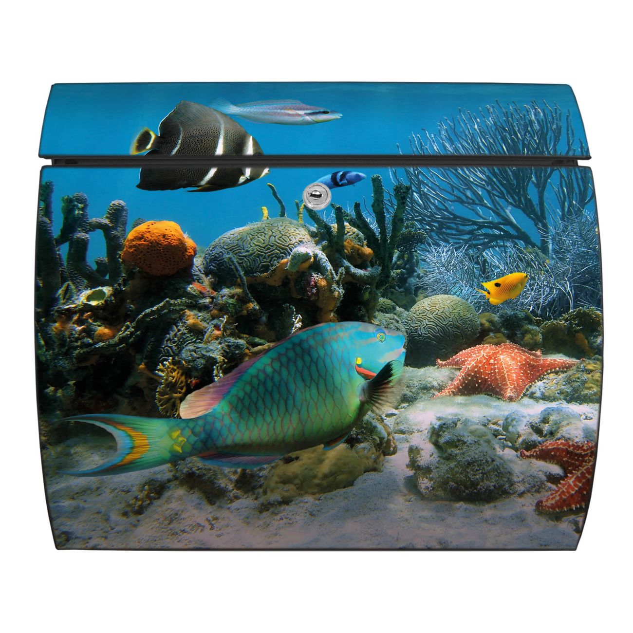 FUNKTION: DESIGN: Das Burg Wächter Modell Toscana mit Motiv Korallenriff 1 hat ein sehr ansprechendes und zeitloses Design und ist besonderes wetterfest. Heben Sie Sich von der tristen grauen Masse ab, ohne auf Funktionalität zu verzichten. Wir bieten Ihnen ebenfalls Namensschilder, bereits beschriftet oder frei zu beschriften, und verschiedene selbst gestaltete Bitte-Keine-Werbung-Aufkleber. DETAILS: Der Postkasten besteht aus vollflächig verzinktem Stahl welcher in Anthrazit oder Weiß lackiert wurde oder aus Edelstahl (je nach gewählter Variante). Das Motiv besteht aus einer wetter- und UV-festen Folie, die mit einem Schutzlaminat überzogen ist, durch die Ihren Briefkasten zusätzlich vor Kratzern geschützt ist und auf den Briefkasten kaschiert wurde. Sie erhalten zu Ihrem neuen Design Briefkasten 2 Schlüssel sowie das passende Montagematerial. BANJADO: Ihr Briefkasten wird von Burg Wächter in Deutschland gefertigt und in unserer kleinen Manufaktur von Hand veredelt. Die Motivfolie ist lösungsmittelfrei und schutzlaminiert, dies sorgt für einen langen Halt. Wir legen großen Wert auf die Verbindung von Funktionalität und Design. Sie erhalten besondere Handarbeit aus Sachsen und Made in Germany.