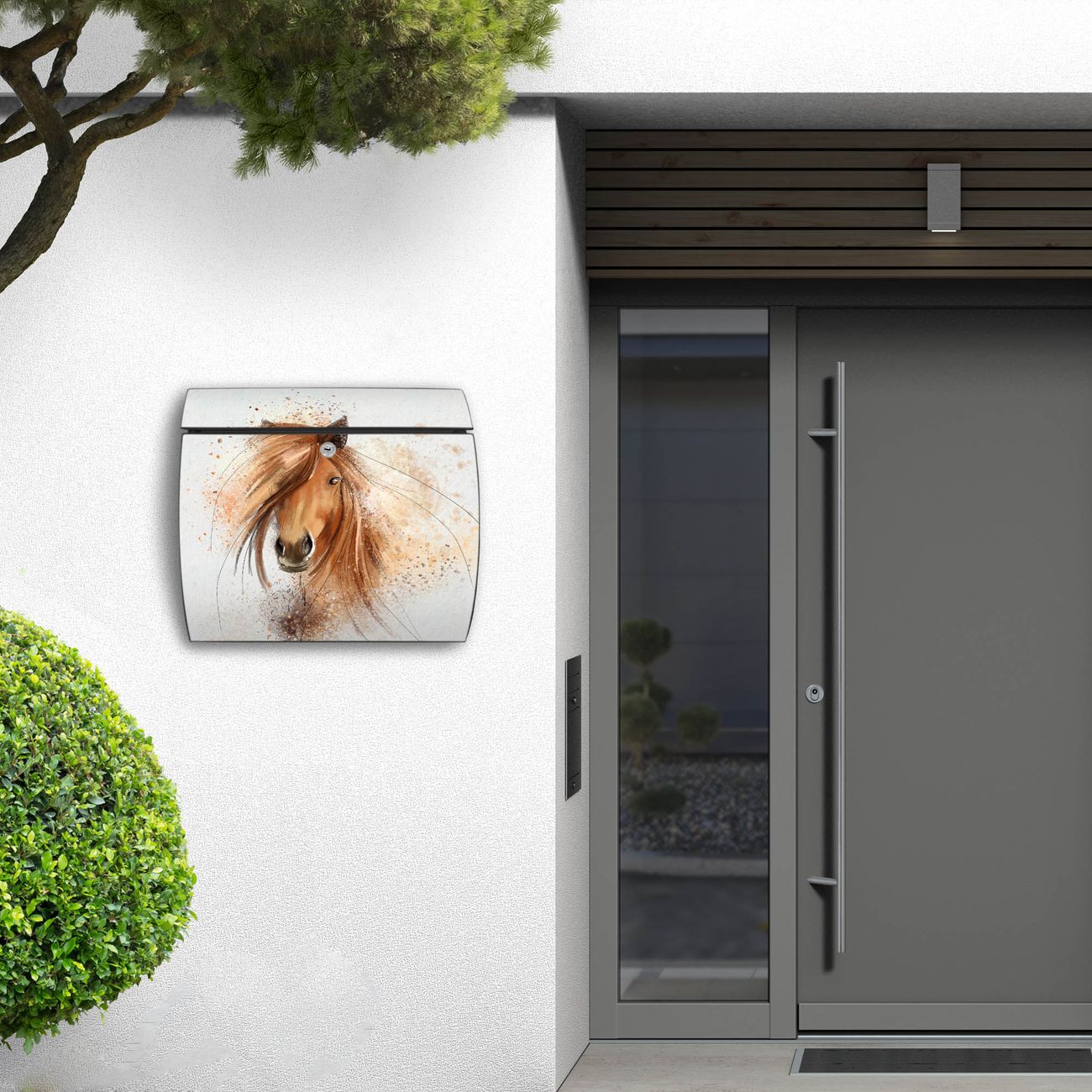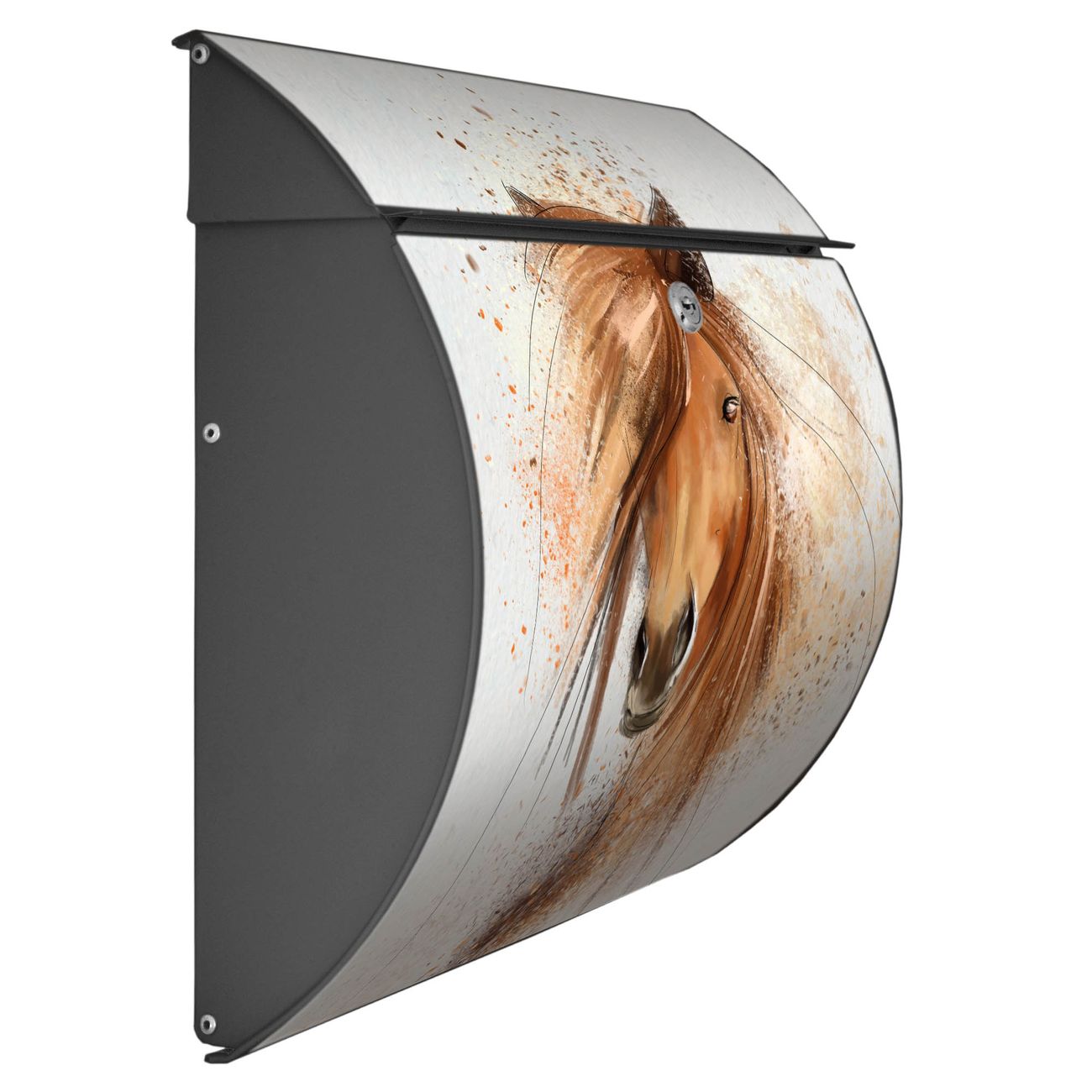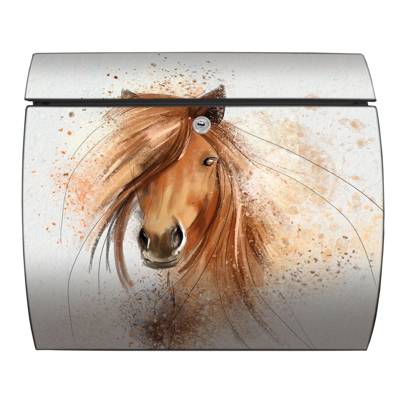 FUNKTION: DESIGN: Das Burg Wächter Modell Toscana mit Motiv Magic Horse hat ein sehr ansprechendes und zeitloses Design und ist besonderes wetterfest. Heben Sie Sich von der tristen grauen Masse ab, ohne auf Funktionalität zu verzichten. Wir bieten Ihnen ebenfalls Namensschilder, bereits beschriftet oder frei zu beschriften, und verschiedene selbst gestaltete Bitte-Keine-Werbung-Aufkleber. DETAILS: Der Postkasten besteht aus vollflächig verzinktem Stahl welcher in Anthrazit oder Weiß lackiert wurde oder aus Edelstahl (je nach gewählter Variante). Das Motiv besteht aus einer wetter- und UV-festen Folie, die mit einem Schutzlaminat überzogen ist, durch die Ihren Briefkasten zusätzlich vor Kratzern geschützt ist und auf den Briefkasten kaschiert wurde. Sie erhalten zu Ihrem neuen Design Briefkasten 2 Schlüssel sowie das passende Montagematerial. BANJADO: Ihr Briefkasten wird von Burg Wächter in Deutschland gefertigt und in unserer kleinen Manufaktur von Hand veredelt. Die Motivfolie ist lösungsmittelfrei und schutzlaminiert, dies sorgt für einen langen Halt. Wir legen großen Wert auf die Verbindung von Funktionalität und Design. Sie erhalten besondere Handarbeit aus Sachsen und Made in Germany.