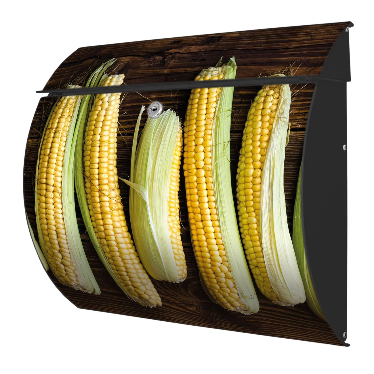 Der geschwungene Burg Wächter Briefkasten Toscana mit Motiv Maiskolben bietet Ihnen mit seinem großen Fassungsvermögen genügend Platz auch für große A4 Sendungen. Auf Wunsch können Sie bei uns den passenden Standfuß bestellen und so aus dem Wandbriefkasten einen Standbriefkasten machen. Der integrierte Öffnungsstopp ermöglicht eine einfache Handhabung beim Entnehmen der Post.