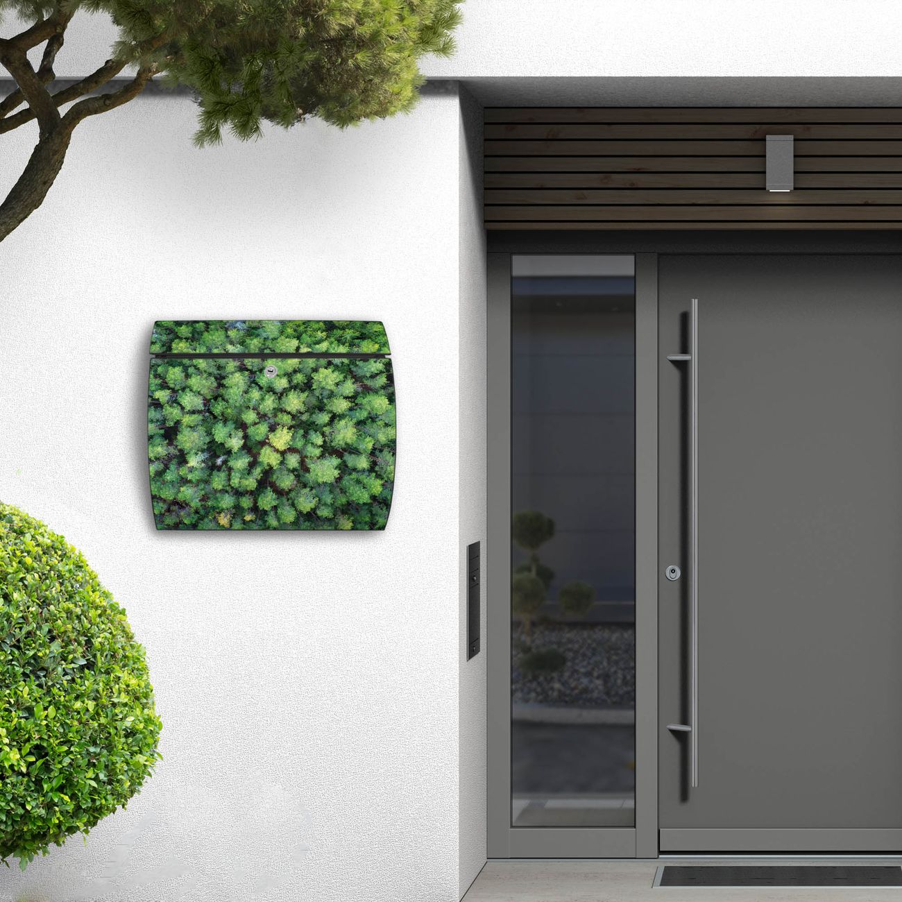 FUNKTION: DESIGN: Das Burg Wächter Modell Toscana mit Motiv Nadelwald hat ein sehr ansprechendes und zeitloses Design und ist besonderes wetterfest. Heben Sie Sich von der tristen grauen Masse ab, ohne auf Funktionalität zu verzichten. Wir bieten Ihnen ebenfalls Namensschilder, bereits beschriftet oder frei zu beschriften, und verschiedene selbst gestaltete Bitte-Keine-Werbung-Aufkleber. DETAILS: Der Postkasten besteht aus vollflächig verzinktem Stahl welcher in Anthrazit oder Weiß lackiert wurde oder aus Edelstahl (je nach gewählter Variante). Das Motiv besteht aus einer wetter- und UV-festen Folie, die mit einem Schutzlaminat überzogen ist, durch die Ihren Briefkasten zusätzlich vor Kratzern geschützt ist und auf den Briefkasten kaschiert wurde. Sie erhalten zu Ihrem neuen Design Briefkasten 2 Schlüssel sowie das passende Montagematerial. BANJADO: Ihr Briefkasten wird von Burg Wächter in Deutschland gefertigt und in unserer kleinen Manufaktur von Hand veredelt. Die Motivfolie ist lösungsmittelfrei und schutzlaminiert, dies sorgt für einen langen Halt. Wir legen großen Wert auf die Verbindung von Funktionalität und Design. Sie erhalten besondere Handarbeit aus Sachsen und Made in Germany.