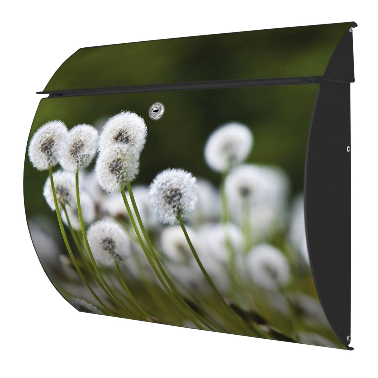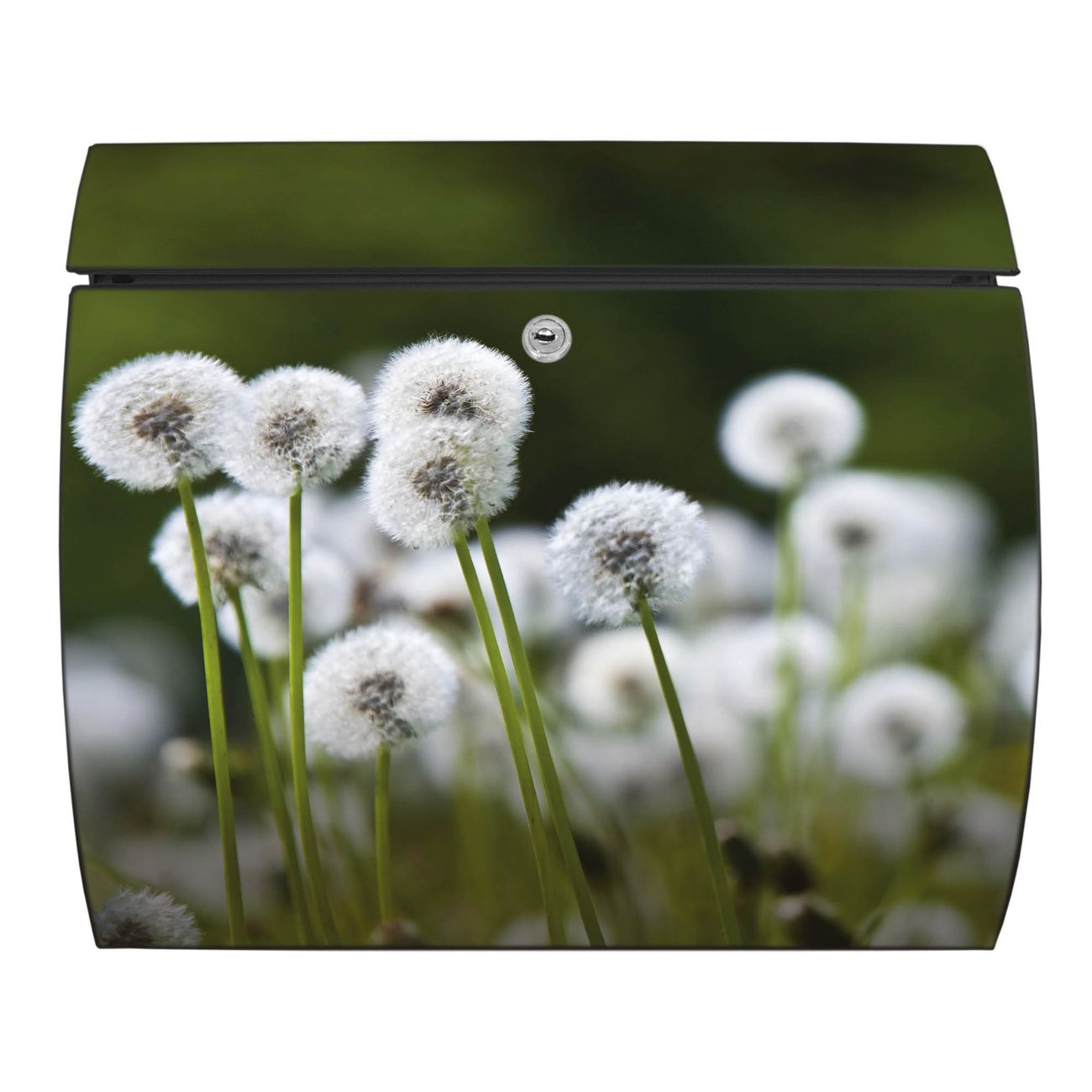 Der geschwungene Burg Wächter Briefkasten Toscana mit Motiv Pusteblumenwiese bietet Ihnen mit seinem großen Fassungsvermögen genügend Platz auch für große A4 Sendungen. Auf Wunsch können Sie bei uns den passenden Standfuß bestellen und so aus dem Wandbriefkasten einen Standbriefkasten machen. Der integrierte Öffnungsstopp ermöglicht eine einfache Handhabung beim Entnehmen der Post.