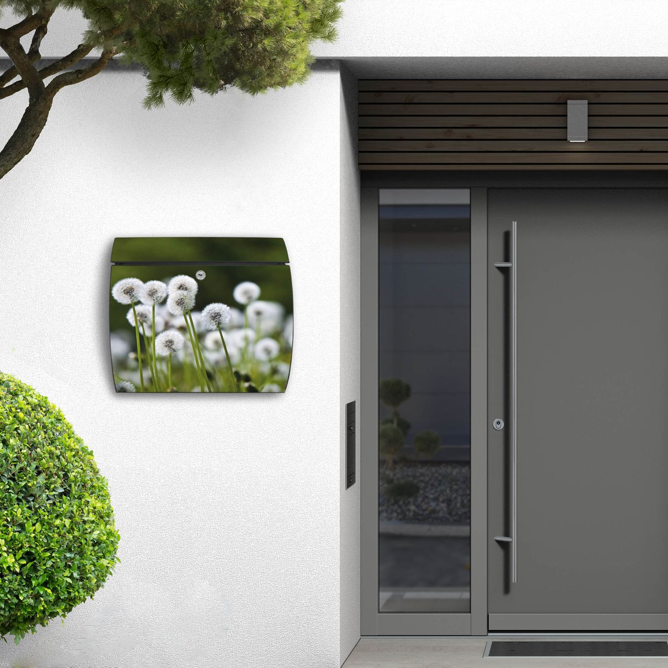 FUNKTION: DESIGN: Das Burg Wächter Modell Toscana mit Motiv Pusteblumenwiese hat ein sehr ansprechendes und zeitloses Design und ist besonderes wetterfest. Heben Sie Sich von der tristen grauen Masse ab, ohne auf Funktionalität zu verzichten. Wir bieten Ihnen ebenfalls Namensschilder, bereits beschriftet oder frei zu beschriften, und verschiedene selbst gestaltete Bitte-Keine-Werbung-Aufkleber. DETAILS: Der Postkasten besteht aus vollflächig verzinktem Stahl welcher in Anthrazit oder Weiß lackiert wurde oder aus Edelstahl (je nach gewählter Variante). Das Motiv besteht aus einer wetter- und UV-festen Folie, die mit einem Schutzlaminat überzogen ist, durch die Ihren Briefkasten zusätzlich vor Kratzern geschützt ist und auf den Briefkasten kaschiert wurde. Sie erhalten zu Ihrem neuen Design Briefkasten 2 Schlüssel sowie das passende Montagematerial. BANJADO: Ihr Briefkasten wird von Burg Wächter in Deutschland gefertigt und in unserer kleinen Manufaktur von Hand veredelt. Die Motivfolie ist lösungsmittelfrei und schutzlaminiert, dies sorgt für einen langen Halt. Wir legen großen Wert auf die Verbindung von Funktionalität und Design. Sie erhalten besondere Handarbeit aus Sachsen und Made in Germany.