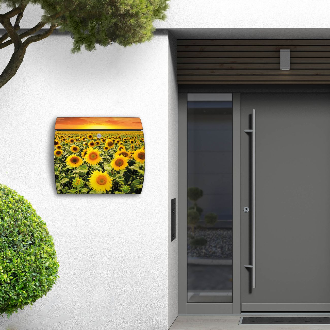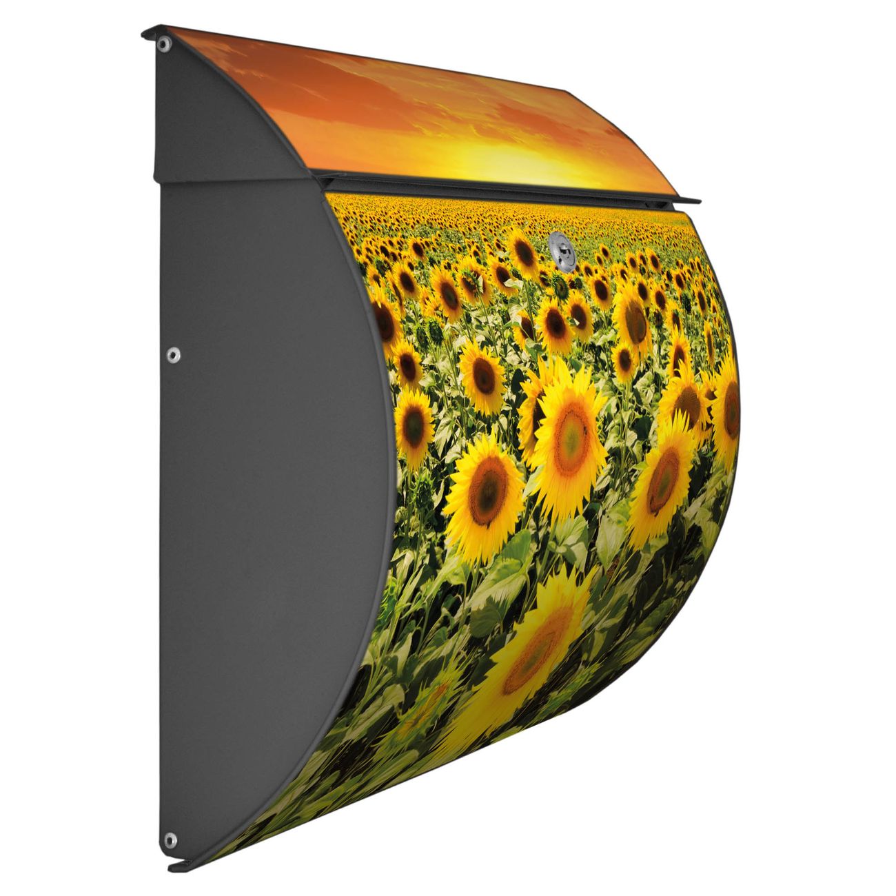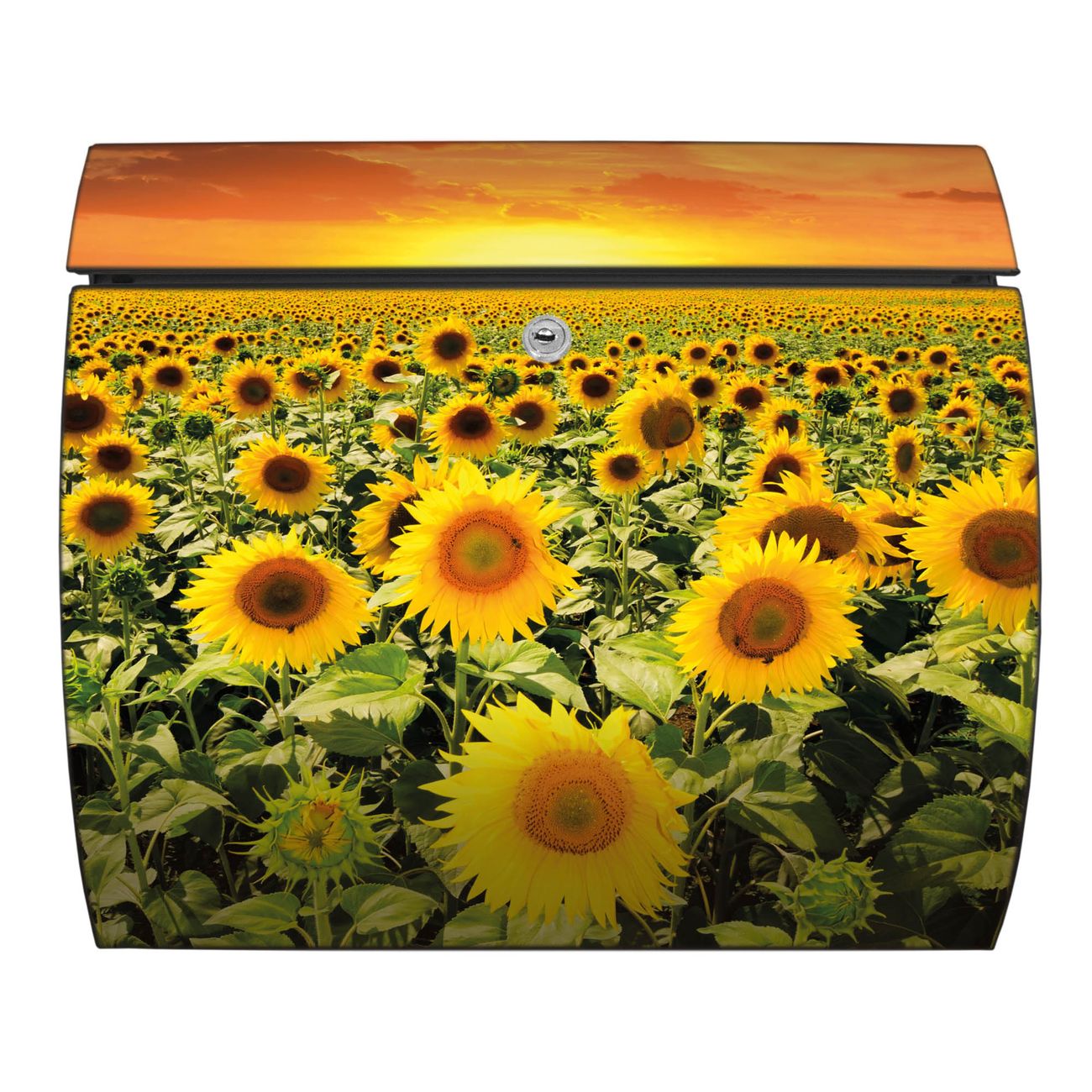 FUNKTION: DESIGN: Das Burg Wächter Modell Toscana mit Motiv Sonnenblumenmeer hat ein sehr ansprechendes und zeitloses Design und ist besonderes wetterfest. Heben Sie Sich von der tristen grauen Masse ab, ohne auf Funktionalität zu verzichten. Wir bieten Ihnen ebenfalls Namensschilder, bereits beschriftet oder frei zu beschriften, und verschiedene selbst gestaltete Bitte-Keine-Werbung-Aufkleber. DETAILS: Der Postkasten besteht aus vollflächig verzinktem Stahl welcher in Anthrazit oder Weiß lackiert wurde oder aus Edelstahl (je nach gewählter Variante). Das Motiv besteht aus einer wetter- und UV-festen Folie, die mit einem Schutzlaminat überzogen ist, durch die Ihren Briefkasten zusätzlich vor Kratzern geschützt ist und auf den Briefkasten kaschiert wurde. Sie erhalten zu Ihrem neuen Design Briefkasten 2 Schlüssel sowie das passende Montagematerial. BANJADO: Ihr Briefkasten wird von Burg Wächter in Deutschland gefertigt und in unserer kleinen Manufaktur von Hand veredelt. Die Motivfolie ist lösungsmittelfrei und schutzlaminiert, dies sorgt für einen langen Halt. Wir legen großen Wert auf die Verbindung von Funktionalität und Design. Sie erhalten besondere Handarbeit aus Sachsen und Made in Germany.