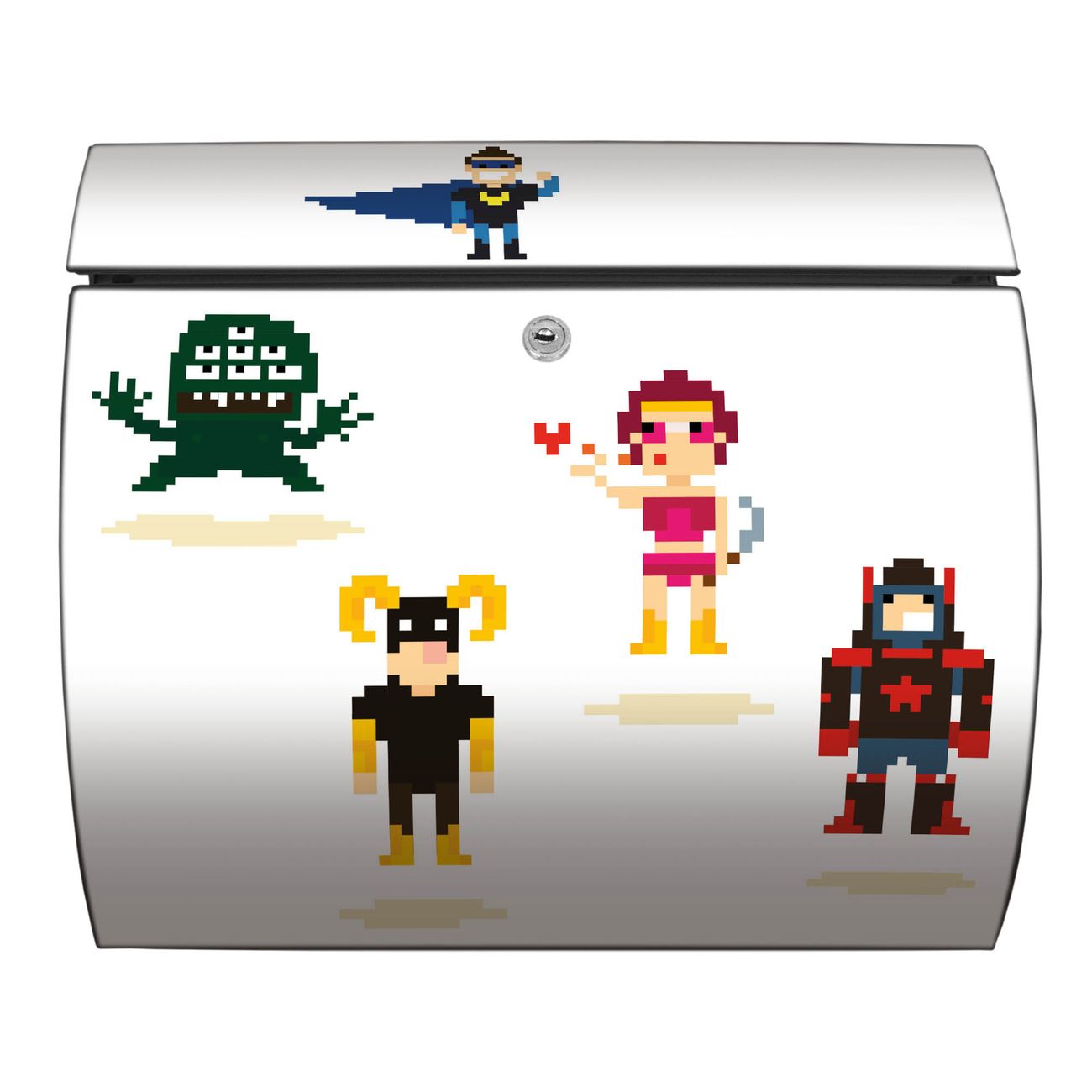 FUNKTION: DESIGN: Das Burg Wächter Modell Toscana mit Motiv Superhelden hat ein sehr ansprechendes und zeitloses Design und ist besonderes wetterfest. Heben Sie Sich von der tristen grauen Masse ab, ohne auf Funktionalität zu verzichten. Wir bieten Ihnen ebenfalls Namensschilder, bereits beschriftet oder frei zu beschriften, und verschiedene selbst gestaltete Bitte-Keine-Werbung-Aufkleber. DETAILS: Der Postkasten besteht aus vollflächig verzinktem Stahl welcher in Anthrazit oder Weiß lackiert wurde oder aus Edelstahl (je nach gewählter Variante). Das Motiv besteht aus einer wetter- und UV-festen Folie, die mit einem Schutzlaminat überzogen ist, durch die Ihren Briefkasten zusätzlich vor Kratzern geschützt ist und auf den Briefkasten kaschiert wurde. Sie erhalten zu Ihrem neuen Design Briefkasten 2 Schlüssel sowie das passende Montagematerial. BANJADO: Ihr Briefkasten wird von Burg Wächter in Deutschland gefertigt und in unserer kleinen Manufaktur von Hand veredelt. Die Motivfolie ist lösungsmittelfrei und schutzlaminiert, dies sorgt für einen langen Halt. Wir legen großen Wert auf die Verbindung von Funktionalität und Design. Sie erhalten besondere Handarbeit aus Sachsen und Made in Germany.