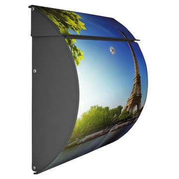 Der geschwungene Burg Wächter Briefkasten Toscana mit Motiv Tour Eiffel bietet Ihnen mit seinem großen Fassungsvermögen genügend Platz auch für große A4 Sendungen. Auf Wunsch können Sie bei uns den passenden Standfuß bestellen und so aus dem Wandbriefkasten einen Standbriefkasten machen. Der integrierte Öffnungsstopp ermöglicht eine einfache Handhabung beim Entnehmen der Post.
