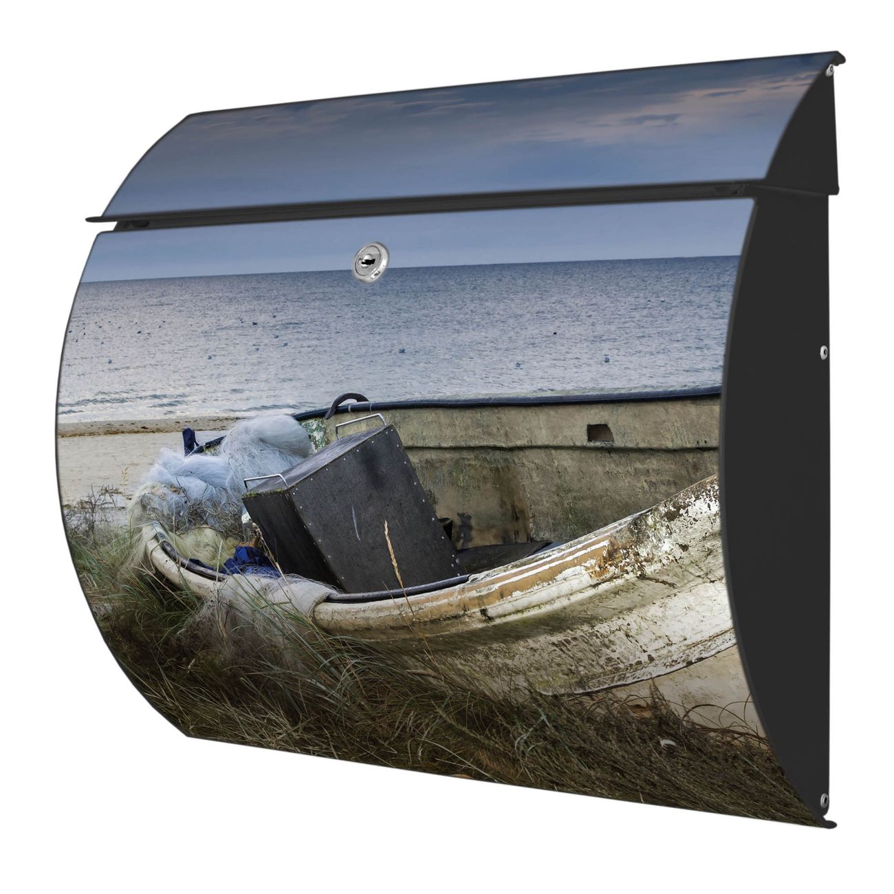 Der geschwungene Burg Wächter Briefkasten Toscana mit Motiv Vergessenes Fischerboot bietet Ihnen mit seinem großen Fassungsvermögen genügend Platz auch für große A4 Sendungen. Auf Wunsch können Sie bei uns den passenden Standfuß bestellen und so aus dem Wandbriefkasten einen Standbriefkasten machen. Der integrierte Öffnungsstopp ermöglicht eine einfache Handhabung beim Entnehmen der Post.