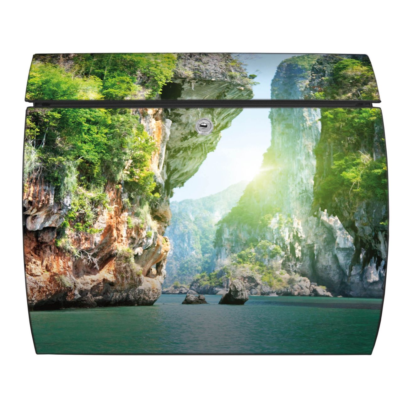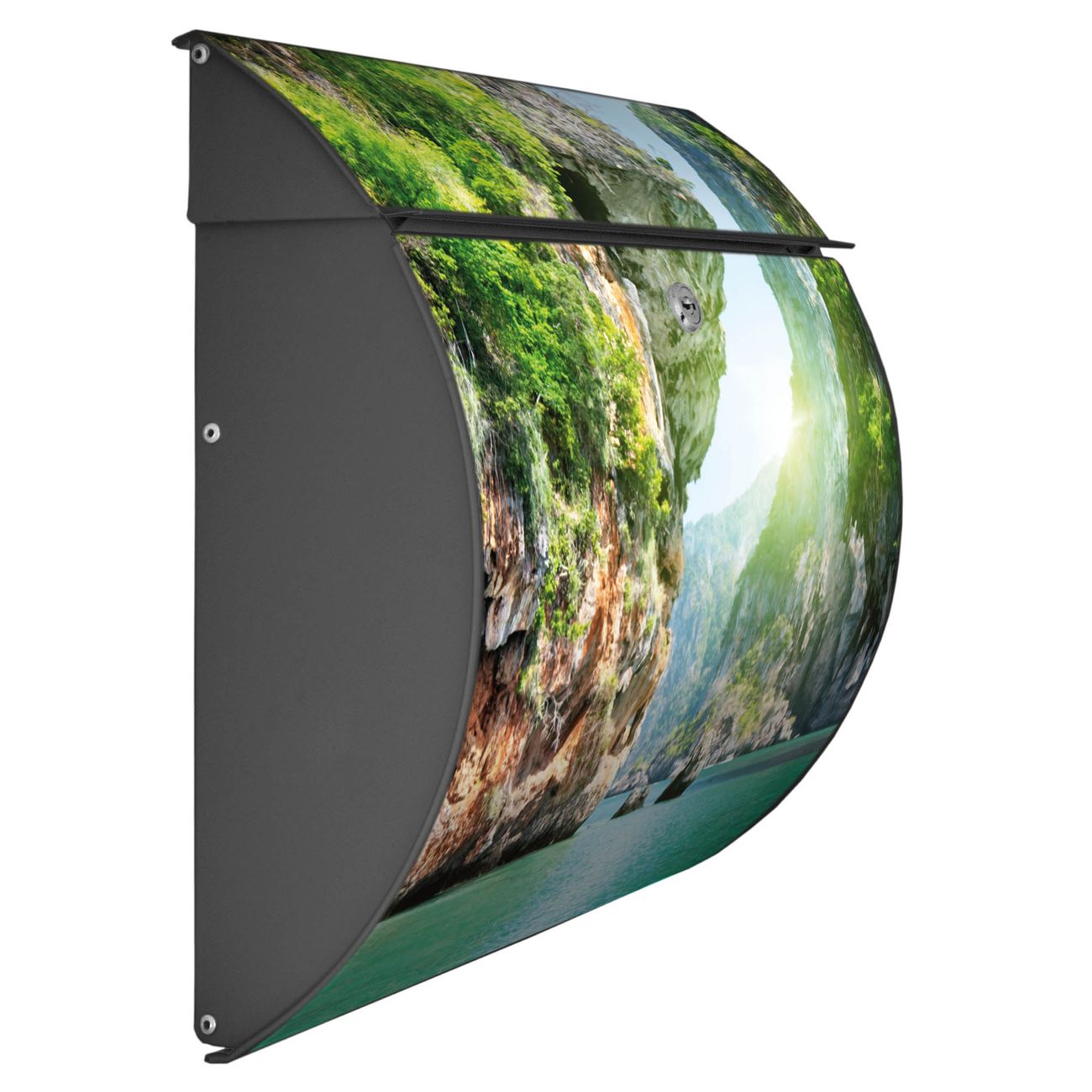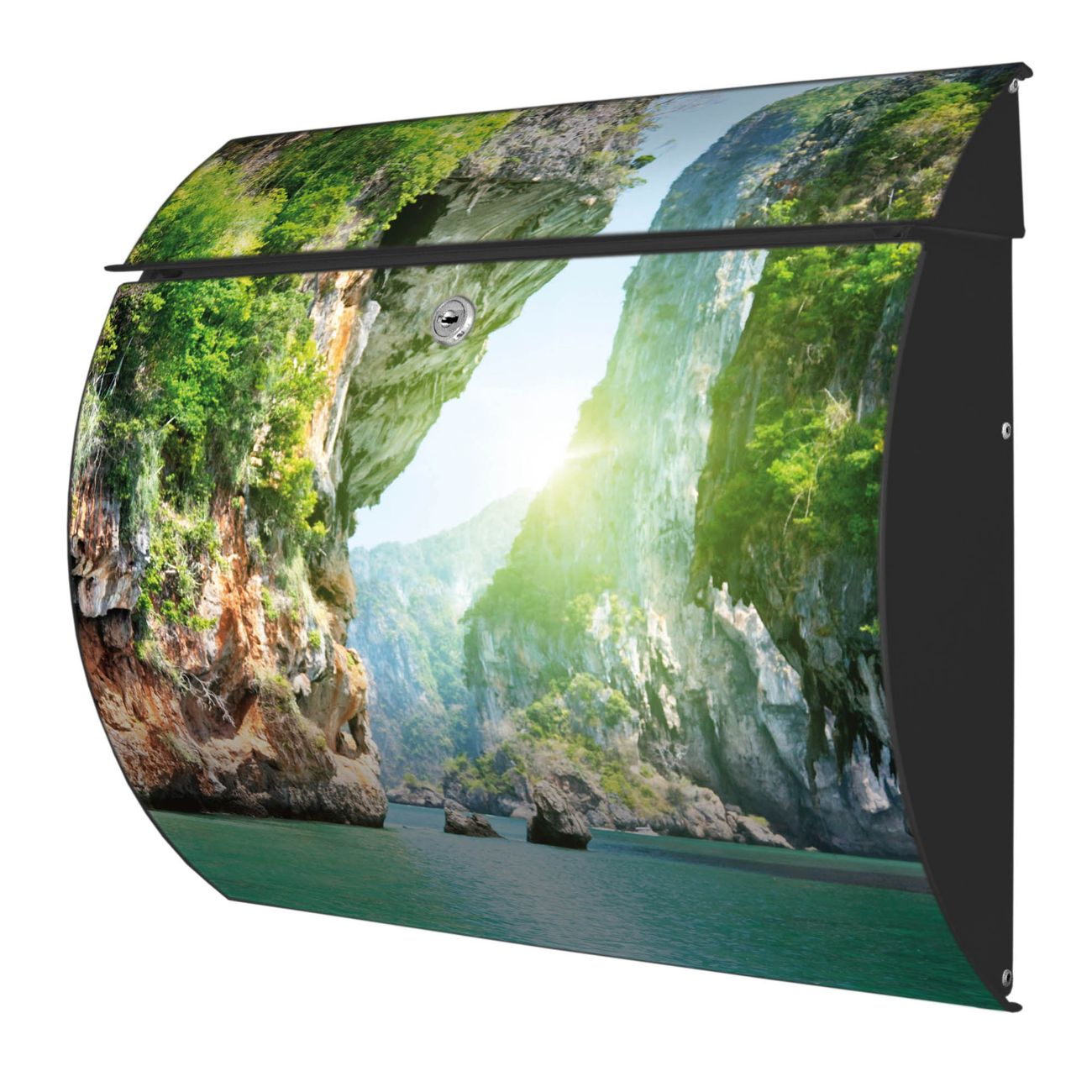 FUNKTION: DESIGN: Das Burg Wächter Modell Toscana mit Motiv Versteckte Bucht hat ein sehr ansprechendes und zeitloses Design und ist besonderes wetterfest. Heben Sie Sich von der tristen grauen Masse ab, ohne auf Funktionalität zu verzichten. Wir bieten Ihnen ebenfalls Namensschilder, bereits beschriftet oder frei zu beschriften, und verschiedene selbst gestaltete Bitte-Keine-Werbung-Aufkleber. DETAILS: Der Postkasten besteht aus vollflächig verzinktem Stahl welcher in Anthrazit oder Weiß lackiert wurde oder aus Edelstahl (je nach gewählter Variante). Das Motiv besteht aus einer wetter- und UV-festen Folie, die mit einem Schutzlaminat überzogen ist, durch die Ihren Briefkasten zusätzlich vor Kratzern geschützt ist und auf den Briefkasten kaschiert wurde. Sie erhalten zu Ihrem neuen Design Briefkasten 2 Schlüssel sowie das passende Montagematerial. BANJADO: Ihr Briefkasten wird von Burg Wächter in Deutschland gefertigt und in unserer kleinen Manufaktur von Hand veredelt. Die Motivfolie ist lösungsmittelfrei und schutzlaminiert, dies sorgt für einen langen Halt. Wir legen großen Wert auf die Verbindung von Funktionalität und Design. Sie erhalten besondere Handarbeit aus Sachsen und Made in Germany.
