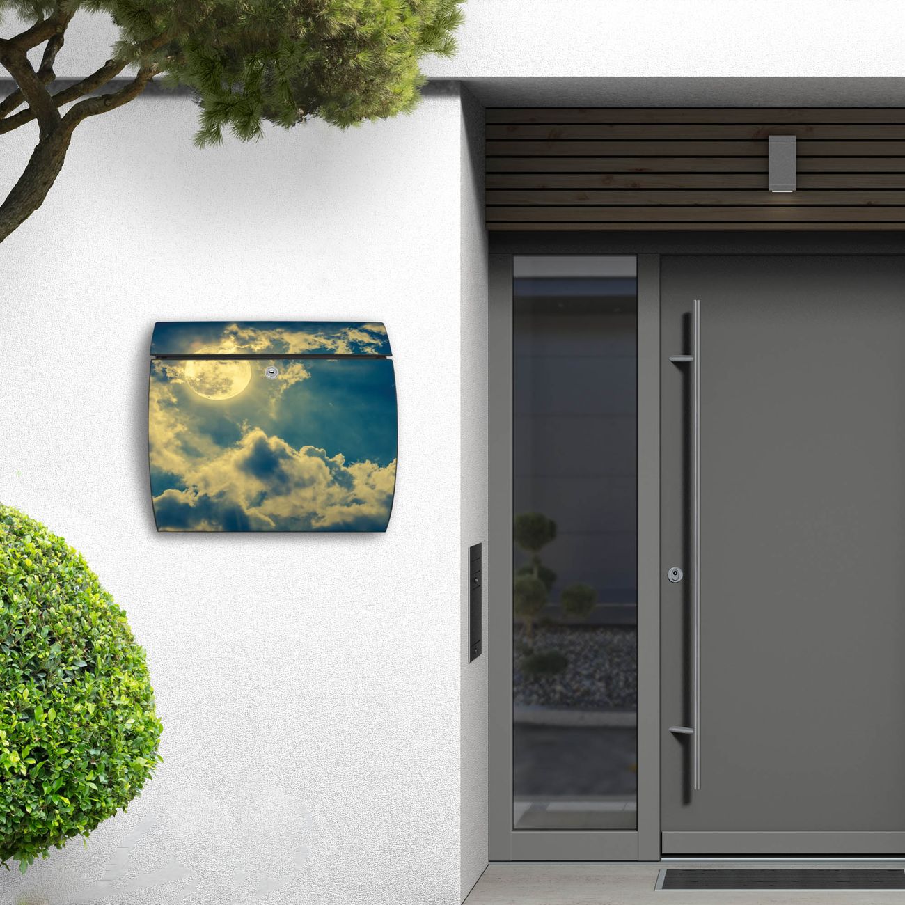 FUNKTION: DESIGN: Das Burg Wächter Modell Toscana mit Motiv Vollmond 2 hat ein sehr ansprechendes und zeitloses Design und ist besonderes wetterfest. Heben Sie Sich von der tristen grauen Masse ab, ohne auf Funktionalität zu verzichten. Wir bieten Ihnen ebenfalls Namensschilder, bereits beschriftet oder frei zu beschriften, und verschiedene selbst gestaltete Bitte-Keine-Werbung-Aufkleber. DETAILS: Der Postkasten besteht aus vollflächig verzinktem Stahl welcher in Anthrazit oder Weiß lackiert wurde oder aus Edelstahl (je nach gewählter Variante). Das Motiv besteht aus einer wetter- und UV-festen Folie, die mit einem Schutzlaminat überzogen ist, durch die Ihren Briefkasten zusätzlich vor Kratzern geschützt ist und auf den Briefkasten kaschiert wurde. Sie erhalten zu Ihrem neuen Design Briefkasten 2 Schlüssel sowie das passende Montagematerial. BANJADO: Ihr Briefkasten wird von Burg Wächter in Deutschland gefertigt und in unserer kleinen Manufaktur von Hand veredelt. Die Motivfolie ist lösungsmittelfrei und schutzlaminiert, dies sorgt für einen langen Halt. Wir legen großen Wert auf die Verbindung von Funktionalität und Design. Sie erhalten besondere Handarbeit aus Sachsen und Made in Germany.