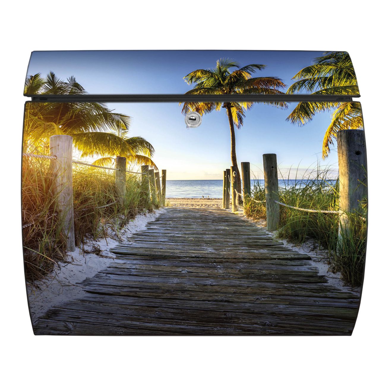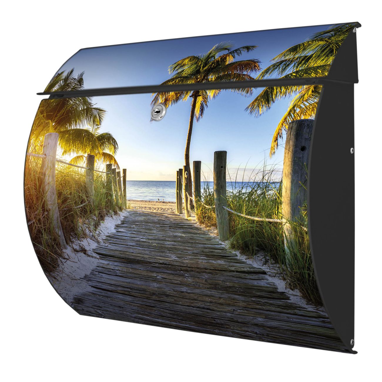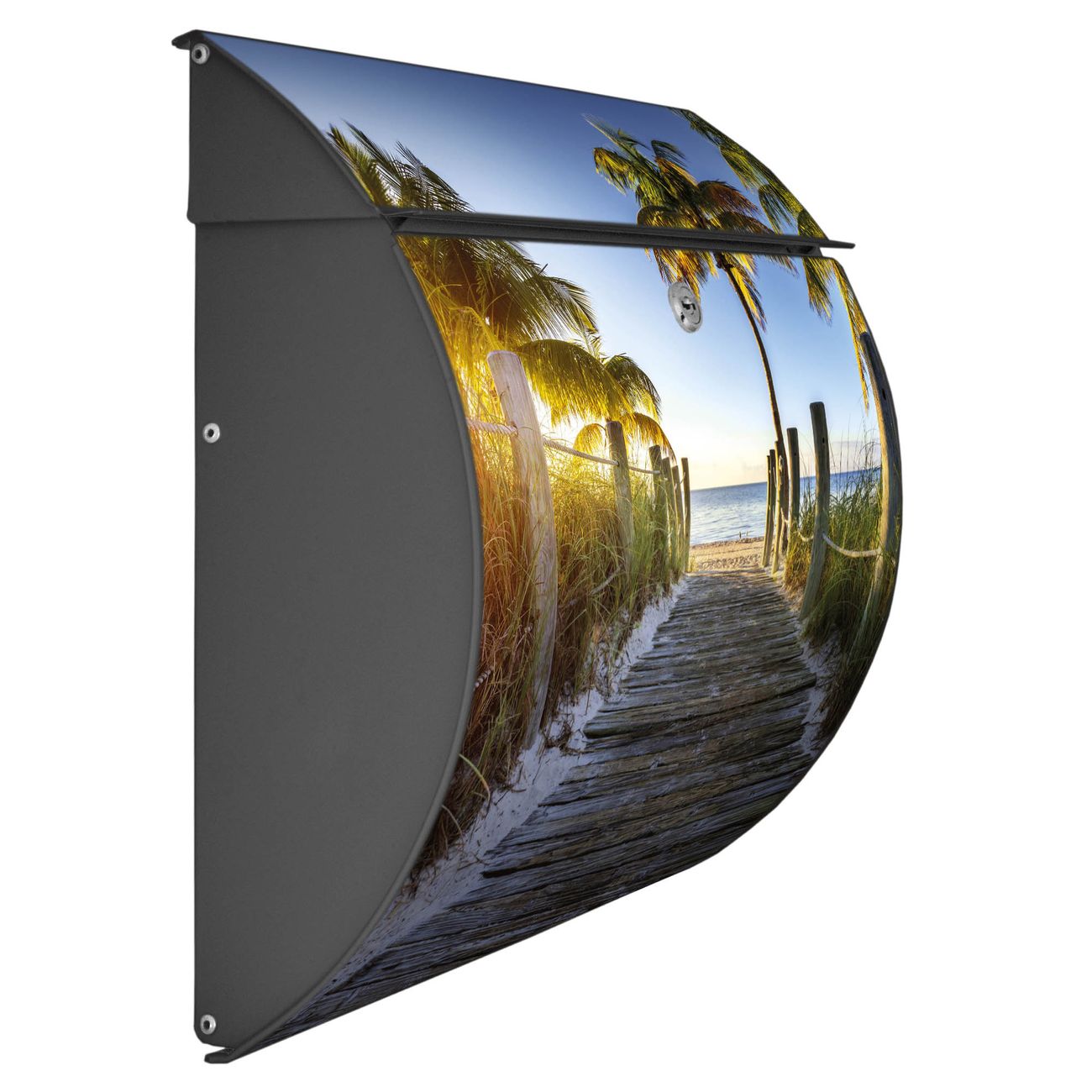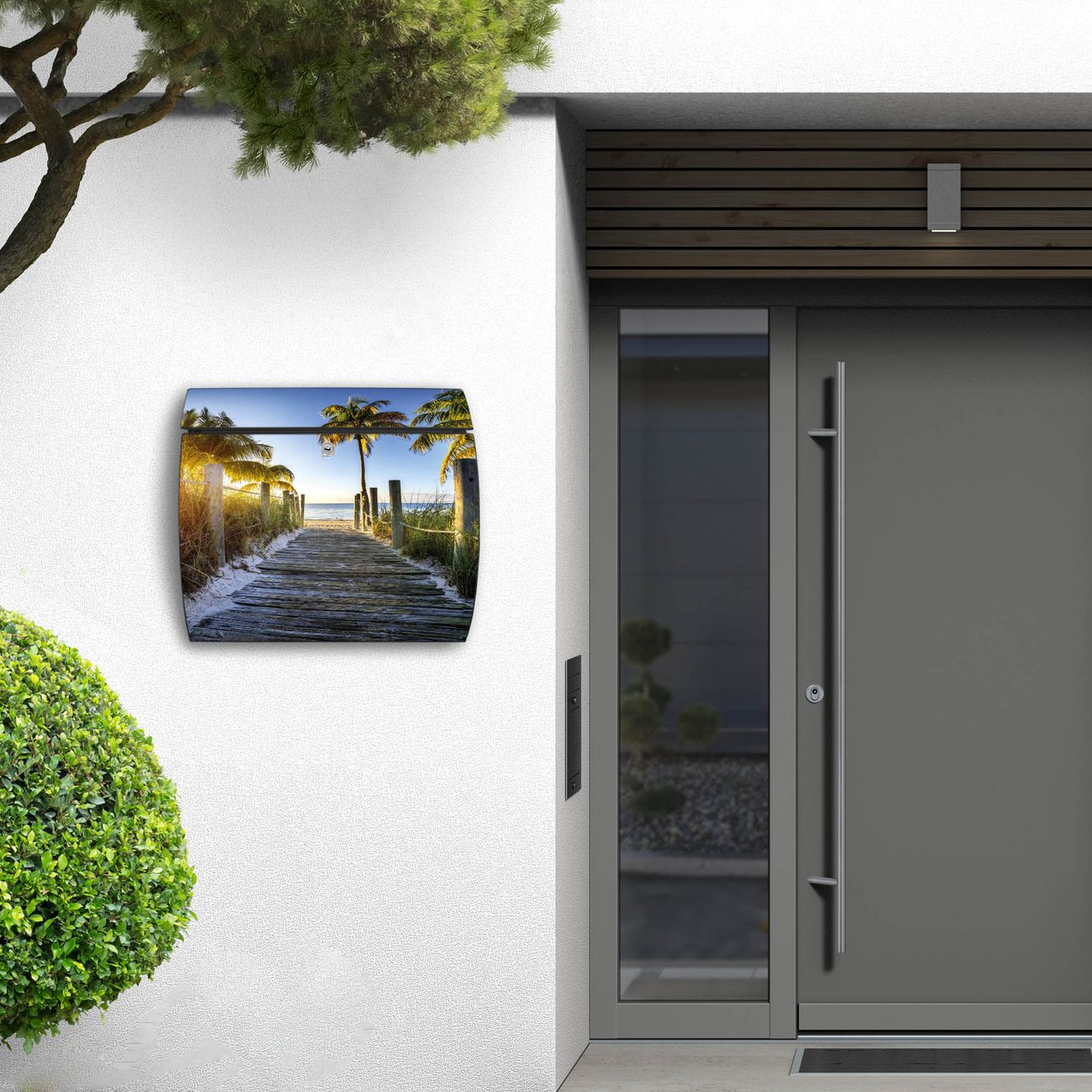 FUNKTION: DESIGN: Das Burg Wächter Modell Toscana mit Motiv Weg zum Strand hat ein sehr ansprechendes und zeitloses Design und ist besonderes wetterfest. Heben Sie Sich von der tristen grauen Masse ab, ohne auf Funktionalität zu verzichten. Wir bieten Ihnen ebenfalls Namensschilder, bereits beschriftet oder frei zu beschriften, und verschiedene selbst gestaltete Bitte-Keine-Werbung-Aufkleber. DETAILS: Der Postkasten besteht aus vollflächig verzinktem Stahl welcher in Anthrazit oder Weiß lackiert wurde oder aus Edelstahl (je nach gewählter Variante). Das Motiv besteht aus einer wetter- und UV-festen Folie, die mit einem Schutzlaminat überzogen ist, durch die Ihren Briefkasten zusätzlich vor Kratzern geschützt ist und auf den Briefkasten kaschiert wurde. Sie erhalten zu Ihrem neuen Design Briefkasten 2 Schlüssel sowie das passende Montagematerial. BANJADO: Ihr Briefkasten wird von Burg Wächter in Deutschland gefertigt und in unserer kleinen Manufaktur von Hand veredelt. Die Motivfolie ist lösungsmittelfrei und schutzlaminiert, dies sorgt für einen langen Halt. Wir legen großen Wert auf die Verbindung von Funktionalität und Design. Sie erhalten besondere Handarbeit aus Sachsen und Made in Germany.