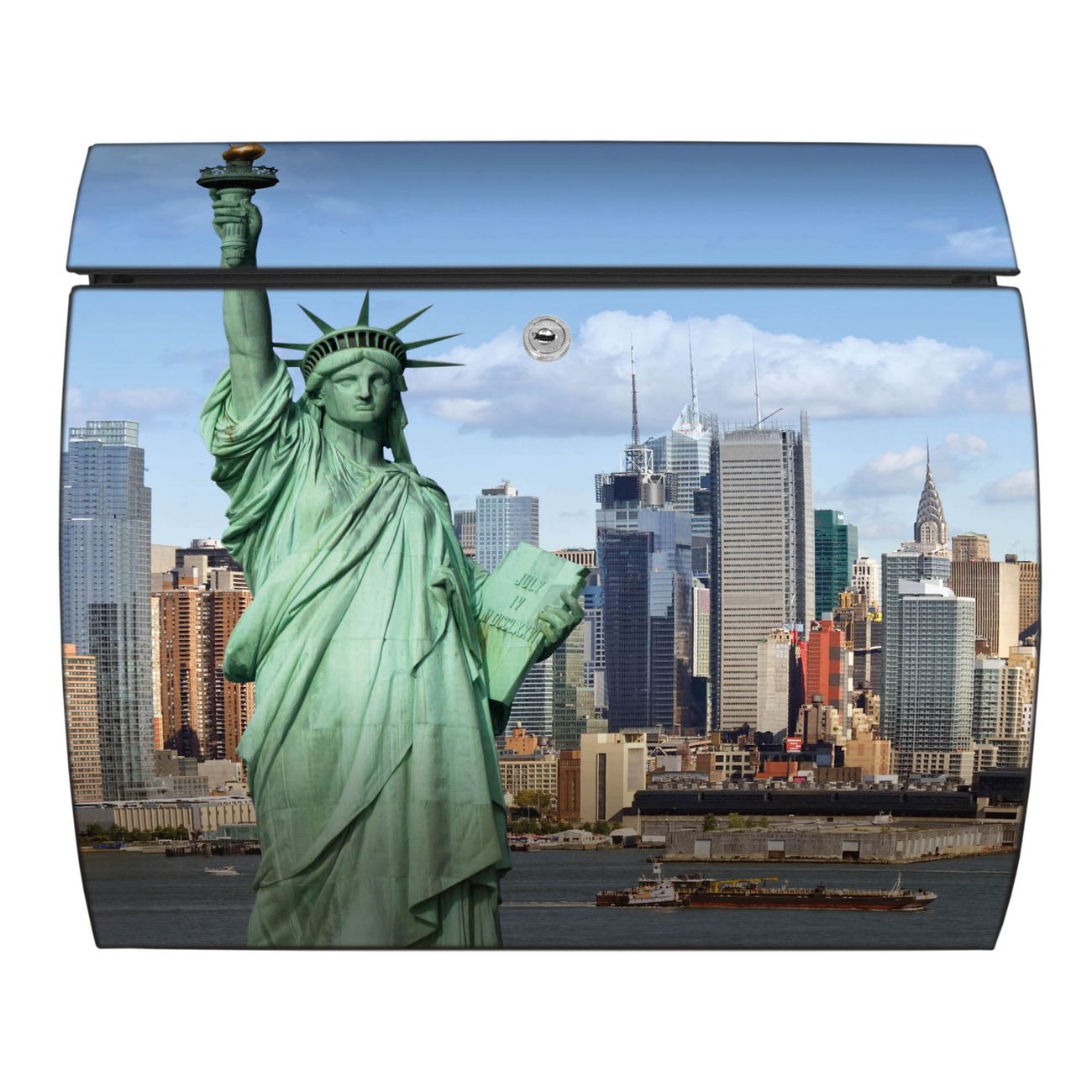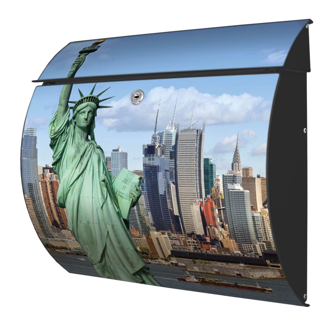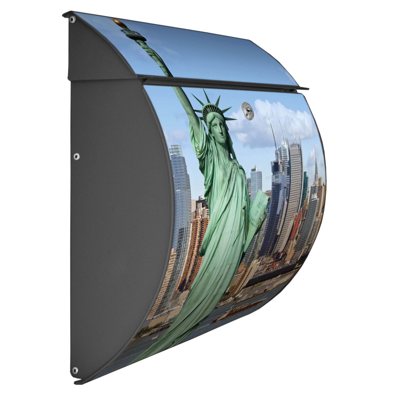 Der geschwungene Burg Wächter Briefkasten Toscana mit Motiv Welcome To NY bietet Ihnen mit seinem großen Fassungsvermögen genügend Platz auch für große A4 Sendungen. Auf Wunsch können Sie bei uns den passenden Standfuß bestellen und so aus dem Wandbriefkasten einen Standbriefkasten machen. Der integrierte Öffnungsstopp ermöglicht eine einfache Handhabung beim Entnehmen der Post.