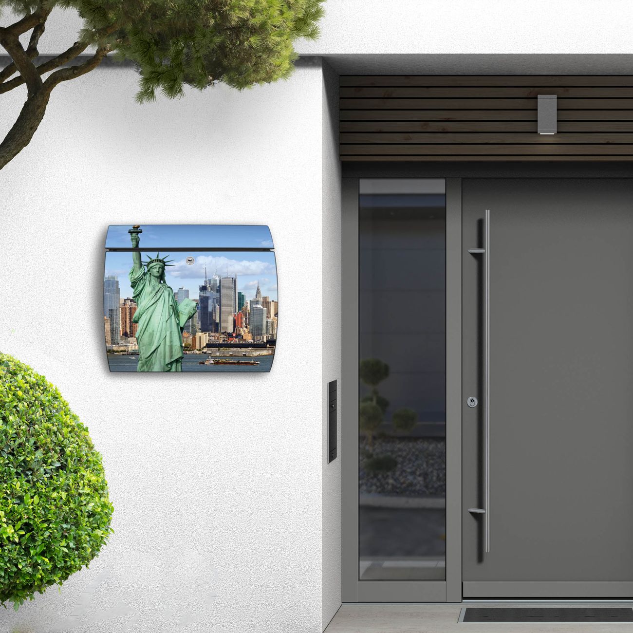 FUNKTION: DESIGN: Das Burg Wächter Modell Toscana mit Motiv Welcome To NY hat ein sehr ansprechendes und zeitloses Design und ist besonderes wetterfest. Heben Sie Sich von der tristen grauen Masse ab, ohne auf Funktionalität zu verzichten. Wir bieten Ihnen ebenfalls Namensschilder, bereits beschriftet oder frei zu beschriften, und verschiedene selbst gestaltete Bitte-Keine-Werbung-Aufkleber. DETAILS: Der Postkasten besteht aus vollflächig verzinktem Stahl welcher in Anthrazit oder Weiß lackiert wurde oder aus Edelstahl (je nach gewählter Variante). Das Motiv besteht aus einer wetter- und UV-festen Folie, die mit einem Schutzlaminat überzogen ist, durch die Ihren Briefkasten zusätzlich vor Kratzern geschützt ist und auf den Briefkasten kaschiert wurde. Sie erhalten zu Ihrem neuen Design Briefkasten 2 Schlüssel sowie das passende Montagematerial. BANJADO: Ihr Briefkasten wird von Burg Wächter in Deutschland gefertigt und in unserer kleinen Manufaktur von Hand veredelt. Die Motivfolie ist lösungsmittelfrei und schutzlaminiert, dies sorgt für einen langen Halt. Wir legen großen Wert auf die Verbindung von Funktionalität und Design. Sie erhalten besondere Handarbeit aus Sachsen und Made in Germany.