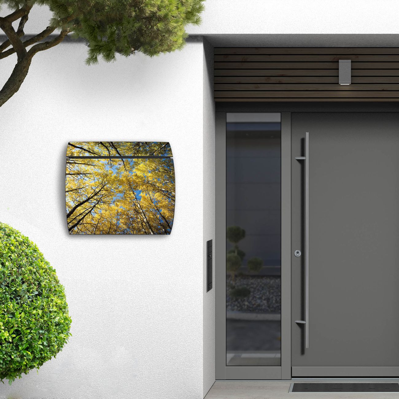 FUNKTION: DESIGN: Das Burg Wächter Modell Toscana mit Motiv Wipfel hat ein sehr ansprechendes und zeitloses Design und ist besonderes wetterfest. Heben Sie Sich von der tristen grauen Masse ab, ohne auf Funktionalität zu verzichten. Wir bieten Ihnen ebenfalls Namensschilder, bereits beschriftet oder frei zu beschriften, und verschiedene selbst gestaltete Bitte-Keine-Werbung-Aufkleber. DETAILS: Der Postkasten besteht aus vollflächig verzinktem Stahl welcher in Anthrazit oder Weiß lackiert wurde oder aus Edelstahl (je nach gewählter Variante). Das Motiv besteht aus einer wetter- und UV-festen Folie, die mit einem Schutzlaminat überzogen ist, durch die Ihren Briefkasten zusätzlich vor Kratzern geschützt ist und auf den Briefkasten kaschiert wurde. Sie erhalten zu Ihrem neuen Design Briefkasten 2 Schlüssel sowie das passende Montagematerial. BANJADO: Ihr Briefkasten wird von Burg Wächter in Deutschland gefertigt und in unserer kleinen Manufaktur von Hand veredelt. Die Motivfolie ist lösungsmittelfrei und schutzlaminiert, dies sorgt für einen langen Halt. Wir legen großen Wert auf die Verbindung von Funktionalität und Design. Sie erhalten besondere Handarbeit aus Sachsen und Made in Germany.