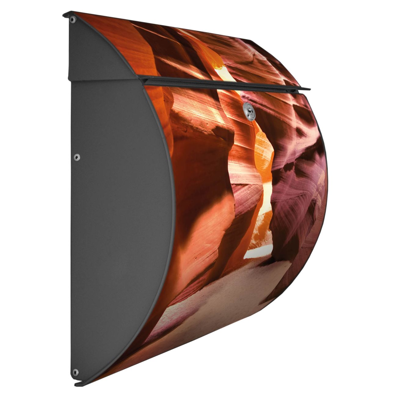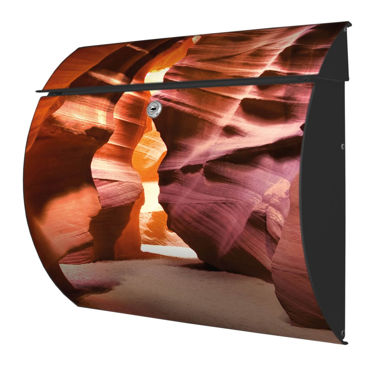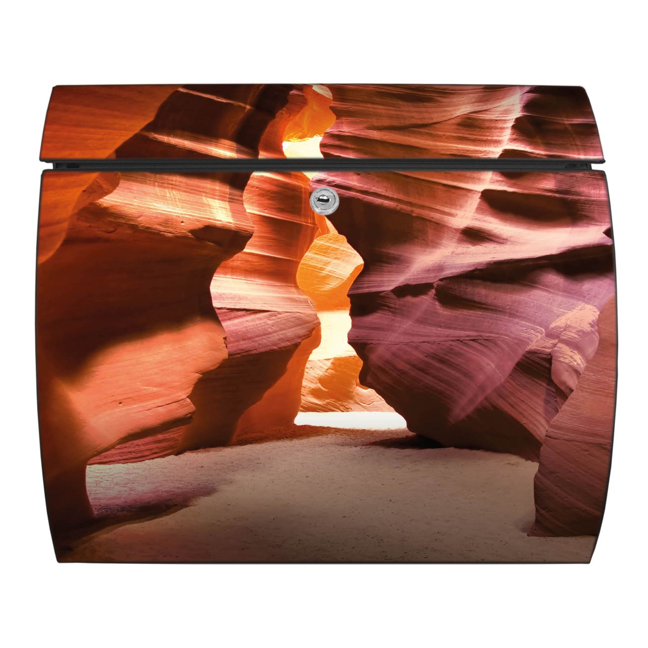 Der geschwungene Burg Wächter Briefkasten Toscana mit Motiv Antelope Canyon bietet Ihnen mit seinem großen Fassungsvermögen genügend Platz auch für große A4 Sendungen. Auf Wunsch können Sie bei uns den passenden Standfuß bestellen und so aus dem Wandbriefkasten einen Standbriefkasten machen. Der integrierte Öffnungsstopp ermöglicht eine einfache Handhabung beim Entnehmen der Post.