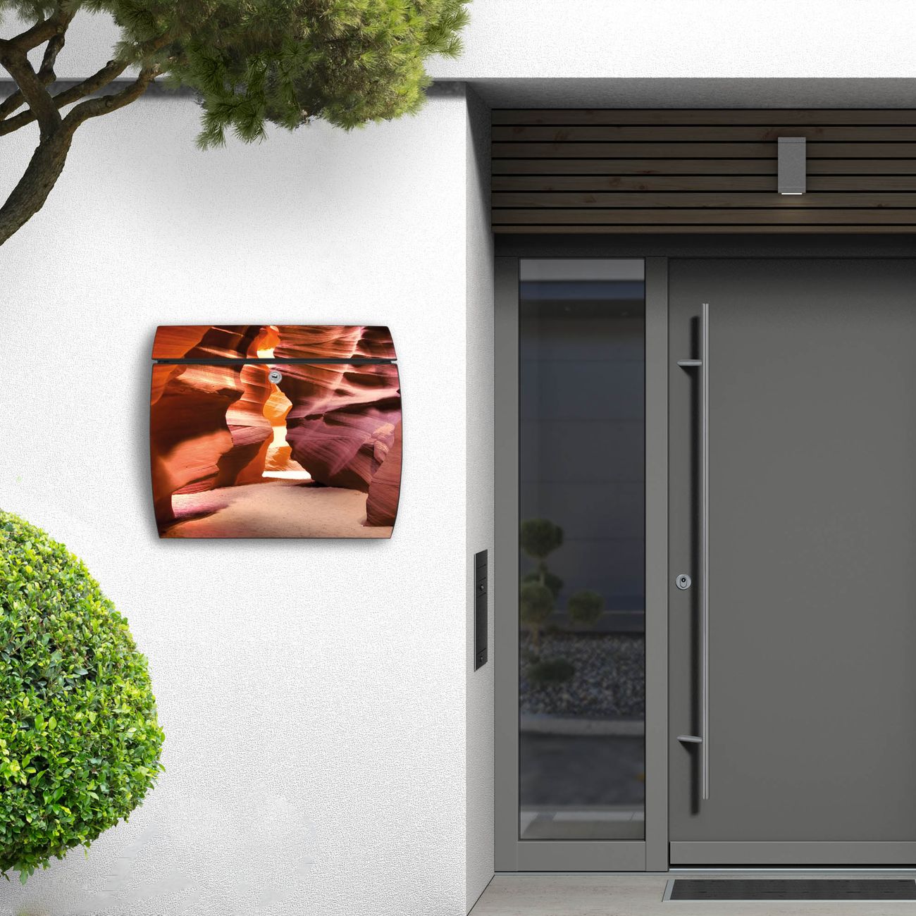 FUNKTION: DESIGN: Das Burg Wächter Modell Toscana mit Motiv Antelope Canyon hat ein sehr ansprechendes und zeitloses Design und ist besonderes wetterfest. Heben Sie Sich von der tristen grauen Masse ab, ohne auf Funktionalität zu verzichten. Wir bieten Ihnen ebenfalls Namensschilder, bereits beschriftet oder frei zu beschriften, und verschiedene selbst gestaltete Bitte-Keine-Werbung-Aufkleber. DETAILS: Der Postkasten besteht aus vollflächig verzinktem Stahl welcher in Anthrazit oder Weiß lackiert wurde oder aus Edelstahl (je nach gewählter Variante). Das Motiv besteht aus einer wetter- und UV-festen Folie, die mit einem Schutzlaminat überzogen ist, durch die Ihren Briefkasten zusätzlich vor Kratzern geschützt ist und auf den Briefkasten kaschiert wurde. Sie erhalten zu Ihrem neuen Design Briefkasten 2 Schlüssel sowie das passende Montagematerial. BANJADO: Ihr Briefkasten wird von Burg Wächter in Deutschland gefertigt und in unserer kleinen Manufaktur von Hand veredelt. Die Motivfolie ist lösungsmittelfrei und schutzlaminiert, dies sorgt für einen langen Halt. Wir legen großen Wert auf die Verbindung von Funktionalität und Design. Sie erhalten besondere Handarbeit aus Sachsen und Made in Germany.
