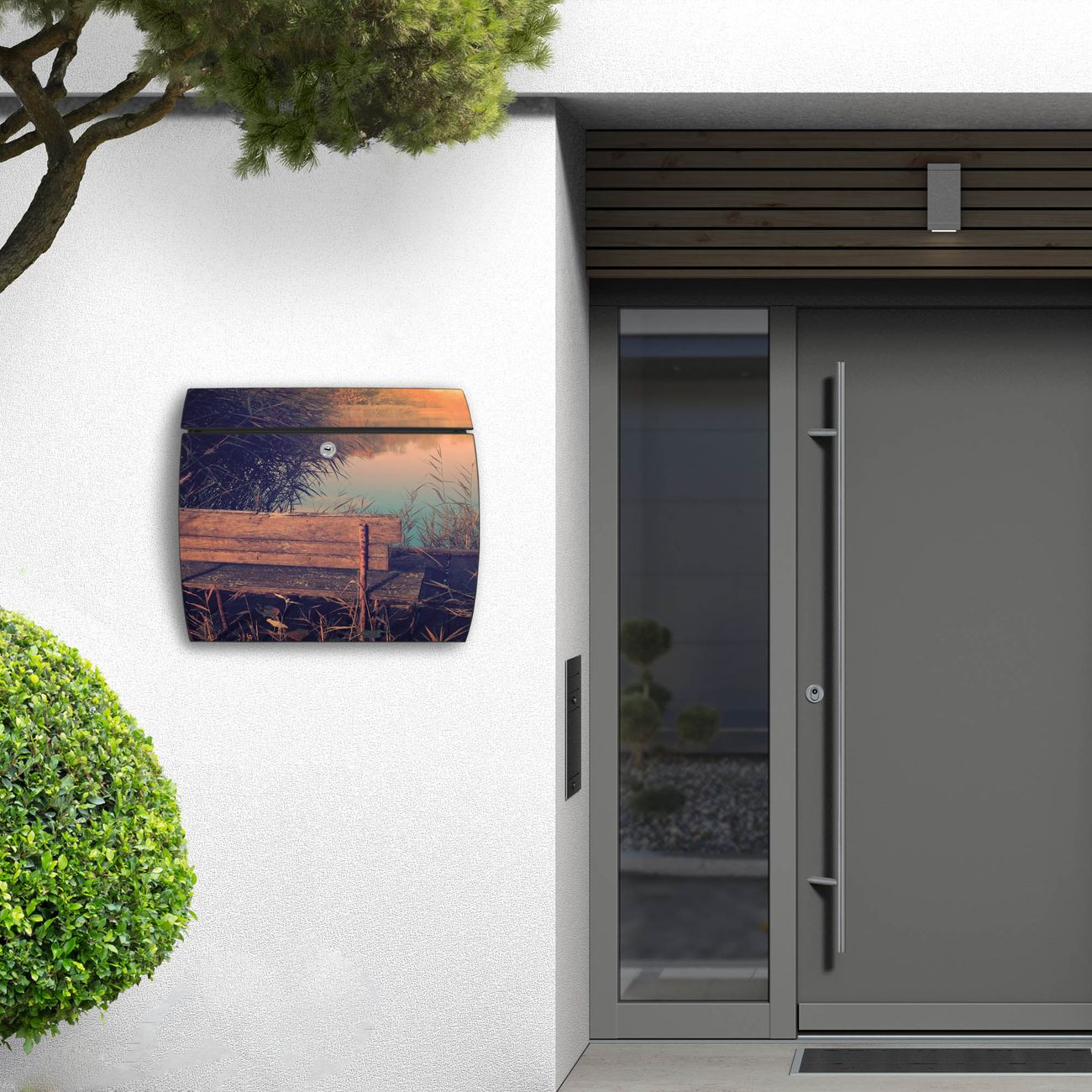 FUNKTION: DESIGN: Das Burg Wächter Modell Toscana mit Motiv Bank Am See hat ein sehr ansprechendes und zeitloses Design und ist besonderes wetterfest. Heben Sie Sich von der tristen grauen Masse ab, ohne auf Funktionalität zu verzichten. Wir bieten Ihnen ebenfalls Namensschilder, bereits beschriftet oder frei zu beschriften, und verschiedene selbst gestaltete Bitte-Keine-Werbung-Aufkleber. DETAILS: Der Postkasten besteht aus vollflächig verzinktem Stahl welcher in Anthrazit oder Weiß lackiert wurde oder aus Edelstahl (je nach gewählter Variante). Das Motiv besteht aus einer wetter- und UV-festen Folie, die mit einem Schutzlaminat überzogen ist, durch die Ihren Briefkasten zusätzlich vor Kratzern geschützt ist und auf den Briefkasten kaschiert wurde. Sie erhalten zu Ihrem neuen Design Briefkasten 2 Schlüssel sowie das passende Montagematerial. BANJADO: Ihr Briefkasten wird von Burg Wächter in Deutschland gefertigt und in unserer kleinen Manufaktur von Hand veredelt. Die Motivfolie ist lösungsmittelfrei und schutzlaminiert, dies sorgt für einen langen Halt. Wir legen großen Wert auf die Verbindung von Funktionalität und Design. Sie erhalten besondere Handarbeit aus Sachsen und Made in Germany.