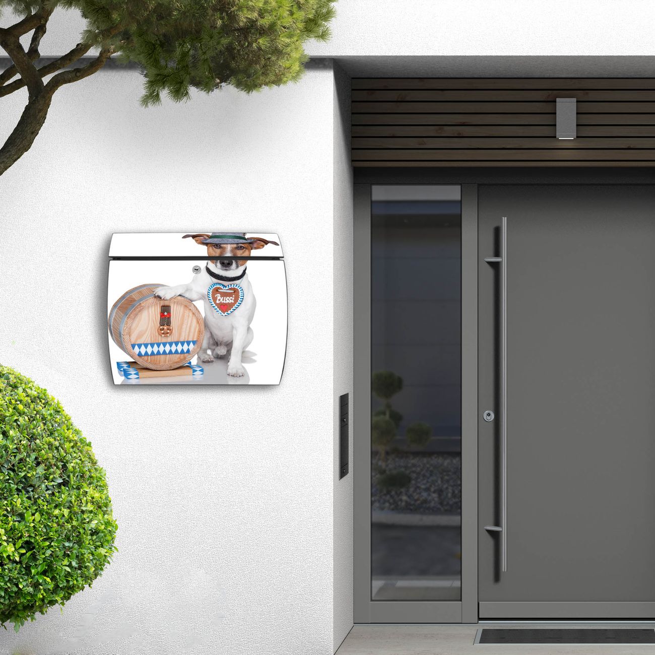 FUNKTION: DESIGN: Das Burg Wächter Modell Toscana mit Motiv Bayer Jack Russel hat ein sehr ansprechendes und zeitloses Design und ist besonderes wetterfest. Heben Sie Sich von der tristen grauen Masse ab, ohne auf Funktionalität zu verzichten. Wir bieten Ihnen ebenfalls Namensschilder, bereits beschriftet oder frei zu beschriften, und verschiedene selbst gestaltete Bitte-Keine-Werbung-Aufkleber. DETAILS: Der Postkasten besteht aus vollflächig verzinktem Stahl welcher in Anthrazit oder Weiß lackiert wurde oder aus Edelstahl (je nach gewählter Variante). Das Motiv besteht aus einer wetter- und UV-festen Folie, die mit einem Schutzlaminat überzogen ist, durch die Ihren Briefkasten zusätzlich vor Kratzern geschützt ist und auf den Briefkasten kaschiert wurde. Sie erhalten zu Ihrem neuen Design Briefkasten 2 Schlüssel sowie das passende Montagematerial. BANJADO: Ihr Briefkasten wird von Burg Wächter in Deutschland gefertigt und in unserer kleinen Manufaktur von Hand veredelt. Die Motivfolie ist lösungsmittelfrei und schutzlaminiert, dies sorgt für einen langen Halt. Wir legen großen Wert auf die Verbindung von Funktionalität und Design. Sie erhalten besondere Handarbeit aus Sachsen und Made in Germany.