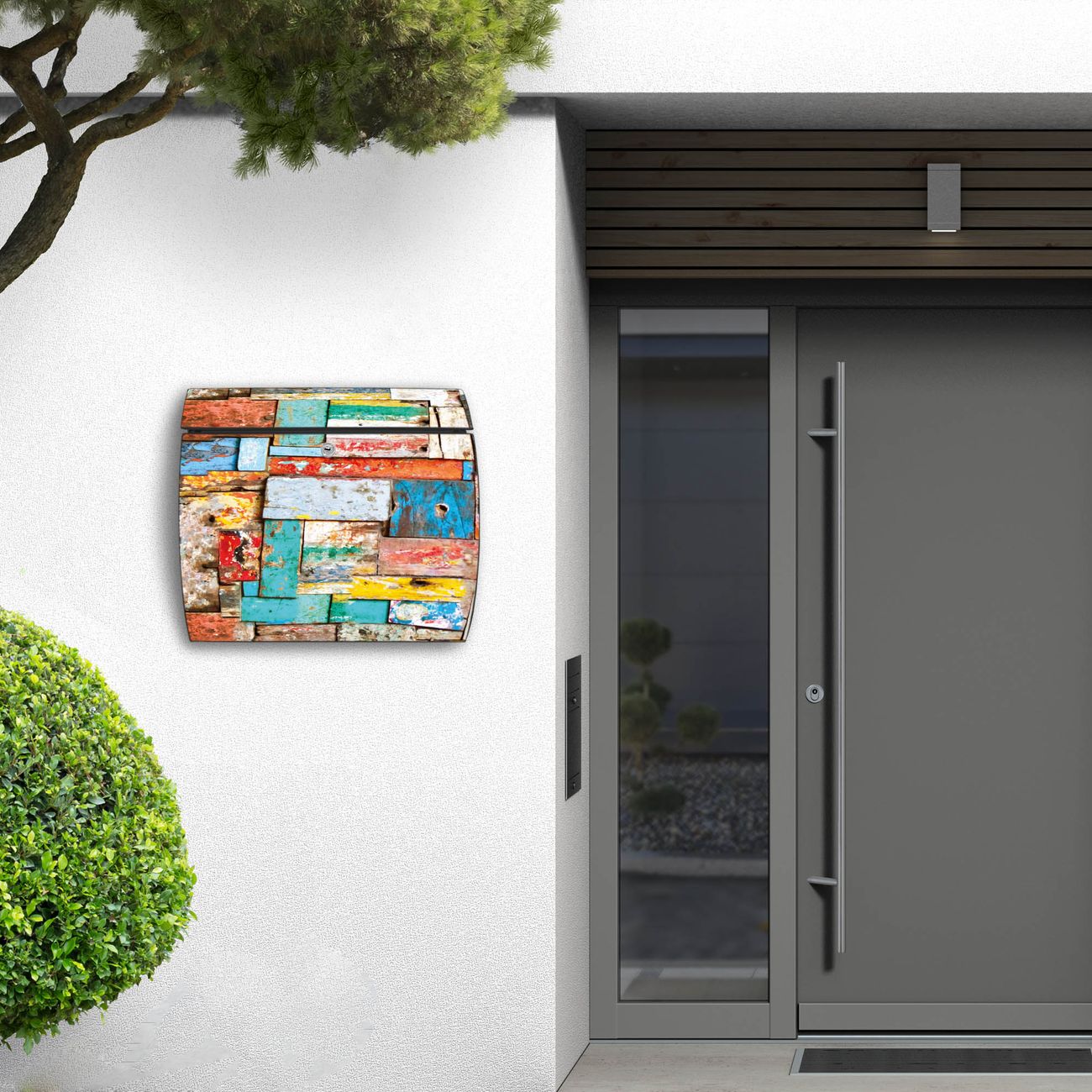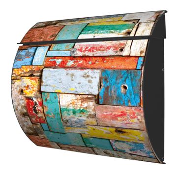 FUNKTION: DESIGN: Das Burg Wächter Modell Toscana mit Motiv Bunte Holzschindeln hat ein sehr ansprechendes und zeitloses Design und ist besonderes wetterfest. Heben Sie Sich von der tristen grauen Masse ab, ohne auf Funktionalität zu verzichten. Wir bieten Ihnen ebenfalls Namensschilder, bereits beschriftet oder frei zu beschriften, und verschiedene selbst gestaltete Bitte-Keine-Werbung-Aufkleber. DETAILS: Der Postkasten besteht aus vollflächig verzinktem Stahl welcher in Anthrazit oder Weiß lackiert wurde oder aus Edelstahl (je nach gewählter Variante). Das Motiv besteht aus einer wetter- und UV-festen Folie, die mit einem Schutzlaminat überzogen ist, durch die Ihren Briefkasten zusätzlich vor Kratzern geschützt ist und auf den Briefkasten kaschiert wurde. Sie erhalten zu Ihrem neuen Design Briefkasten 2 Schlüssel sowie das passende Montagematerial. BANJADO: Ihr Briefkasten wird von Burg Wächter in Deutschland gefertigt und in unserer kleinen Manufaktur von Hand veredelt. Die Motivfolie ist lösungsmittelfrei und schutzlaminiert, dies sorgt für einen langen Halt. Wir legen großen Wert auf die Verbindung von Funktionalität und Design. Sie erhalten besondere Handarbeit aus Sachsen und Made in Germany.