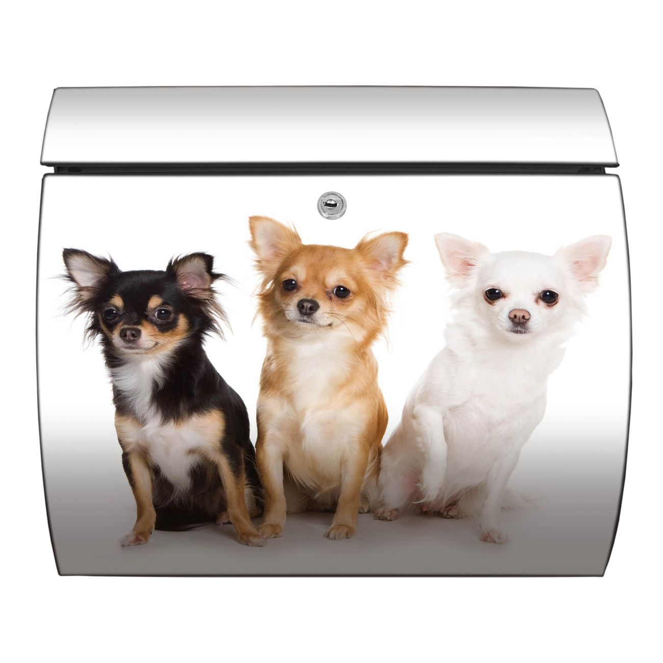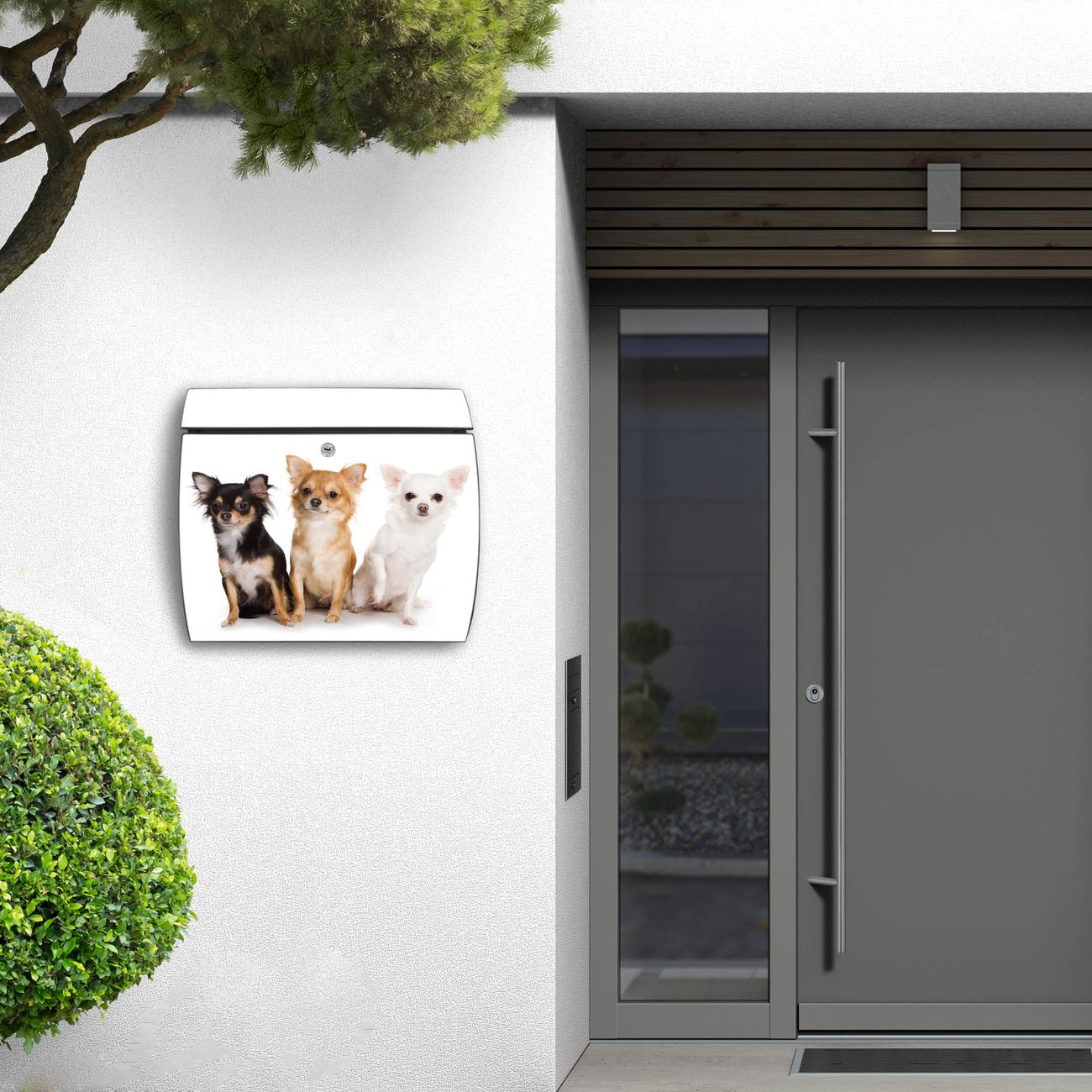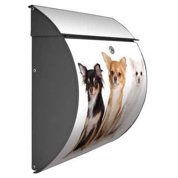 FUNKTION: DESIGN: Das Burg Wächter Modell Toscana mit Motiv Chihuahua hat ein sehr ansprechendes und zeitloses Design und ist besonderes wetterfest. Heben Sie Sich von der tristen grauen Masse ab, ohne auf Funktionalität zu verzichten. Wir bieten Ihnen ebenfalls Namensschilder, bereits beschriftet oder frei zu beschriften, und verschiedene selbst gestaltete Bitte-Keine-Werbung-Aufkleber. DETAILS: Der Postkasten besteht aus vollflächig verzinktem Stahl welcher in Anthrazit oder Weiß lackiert wurde oder aus Edelstahl (je nach gewählter Variante). Das Motiv besteht aus einer wetter- und UV-festen Folie, die mit einem Schutzlaminat überzogen ist, durch die Ihren Briefkasten zusätzlich vor Kratzern geschützt ist und auf den Briefkasten kaschiert wurde. Sie erhalten zu Ihrem neuen Design Briefkasten 2 Schlüssel sowie das passende Montagematerial. BANJADO: Ihr Briefkasten wird von Burg Wächter in Deutschland gefertigt und in unserer kleinen Manufaktur von Hand veredelt. Die Motivfolie ist lösungsmittelfrei und schutzlaminiert, dies sorgt für einen langen Halt. Wir legen großen Wert auf die Verbindung von Funktionalität und Design. Sie erhalten besondere Handarbeit aus Sachsen und Made in Germany.