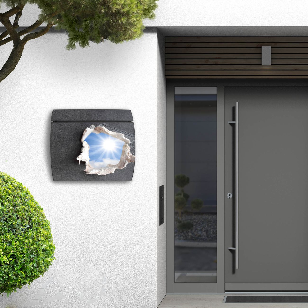 FUNKTION: DESIGN: Das Burg Wächter Modell Toscana mit Motiv Durchblick hat ein sehr ansprechendes und zeitloses Design und ist besonderes wetterfest. Heben Sie Sich von der tristen grauen Masse ab, ohne auf Funktionalität zu verzichten. Wir bieten Ihnen ebenfalls Namensschilder, bereits beschriftet oder frei zu beschriften, und verschiedene selbst gestaltete Bitte-Keine-Werbung-Aufkleber. DETAILS: Der Postkasten besteht aus vollflächig verzinktem Stahl welcher in Anthrazit oder Weiß lackiert wurde oder aus Edelstahl (je nach gewählter Variante). Das Motiv besteht aus einer wetter- und UV-festen Folie, die mit einem Schutzlaminat überzogen ist, durch die Ihren Briefkasten zusätzlich vor Kratzern geschützt ist und auf den Briefkasten kaschiert wurde. Sie erhalten zu Ihrem neuen Design Briefkasten 2 Schlüssel sowie das passende Montagematerial. BANJADO: Ihr Briefkasten wird von Burg Wächter in Deutschland gefertigt und in unserer kleinen Manufaktur von Hand veredelt. Die Motivfolie ist lösungsmittelfrei und schutzlaminiert, dies sorgt für einen langen Halt. Wir legen großen Wert auf die Verbindung von Funktionalität und Design. Sie erhalten besondere Handarbeit aus Sachsen und Made in Germany.
