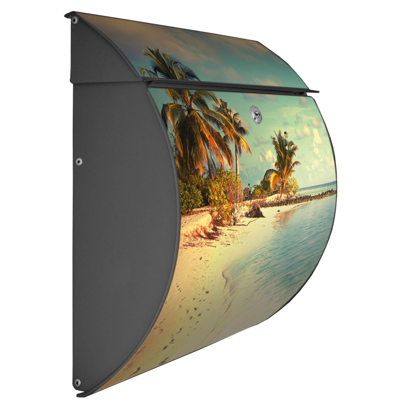 FUNKTION: DESIGN: Das Burg Wächter Modell Toscana mit Motiv Einsame Insel hat ein sehr ansprechendes und zeitloses Design und ist besonderes wetterfest. Heben Sie Sich von der tristen grauen Masse ab, ohne auf Funktionalität zu verzichten. Wir bieten Ihnen ebenfalls Namensschilder, bereits beschriftet oder frei zu beschriften, und verschiedene selbst gestaltete Bitte-Keine-Werbung-Aufkleber. DETAILS: Der Postkasten besteht aus vollflächig verzinktem Stahl welcher in Anthrazit oder Weiß lackiert wurde oder aus Edelstahl (je nach gewählter Variante). Das Motiv besteht aus einer wetter- und UV-festen Folie, die mit einem Schutzlaminat überzogen ist, durch die Ihren Briefkasten zusätzlich vor Kratzern geschützt ist und auf den Briefkasten kaschiert wurde. Sie erhalten zu Ihrem neuen Design Briefkasten 2 Schlüssel sowie das passende Montagematerial. BANJADO: Ihr Briefkasten wird von Burg Wächter in Deutschland gefertigt und in unserer kleinen Manufaktur von Hand veredelt. Die Motivfolie ist lösungsmittelfrei und schutzlaminiert, dies sorgt für einen langen Halt. Wir legen großen Wert auf die Verbindung von Funktionalität und Design. Sie erhalten besondere Handarbeit aus Sachsen und Made in Germany.
