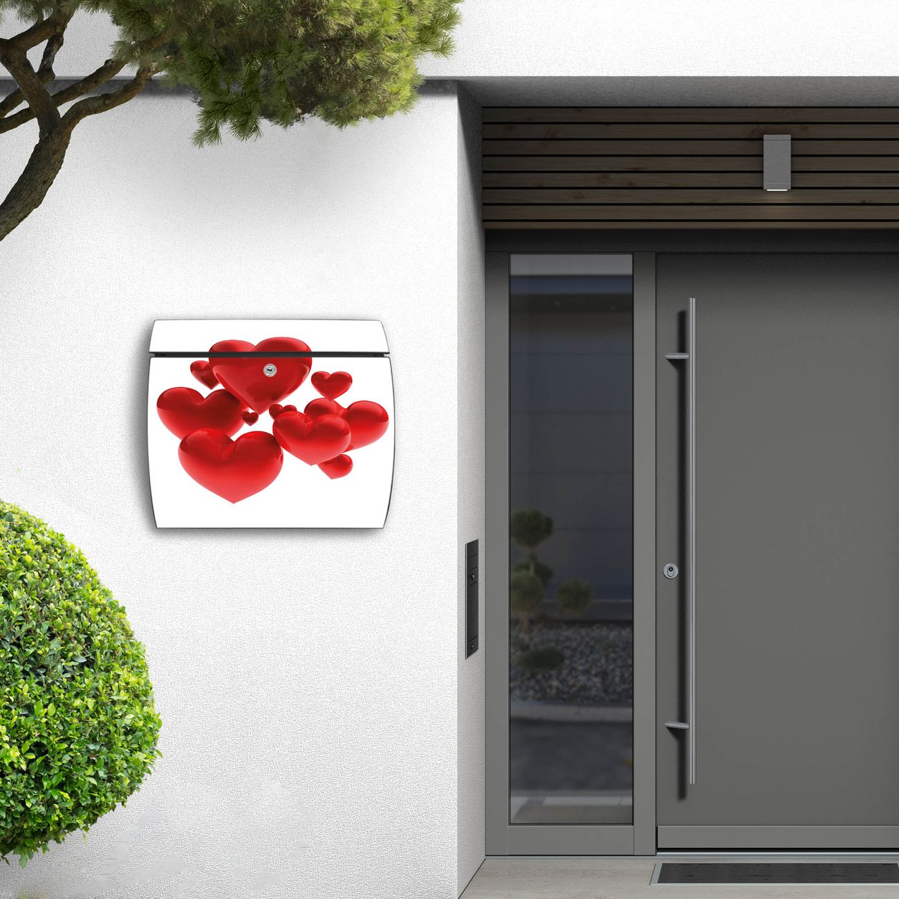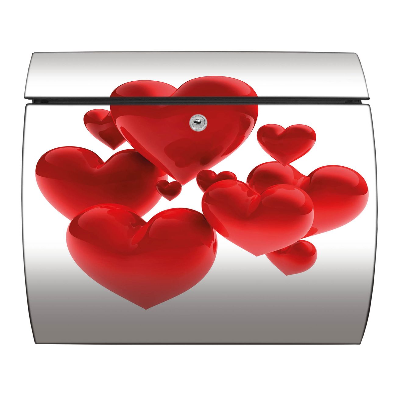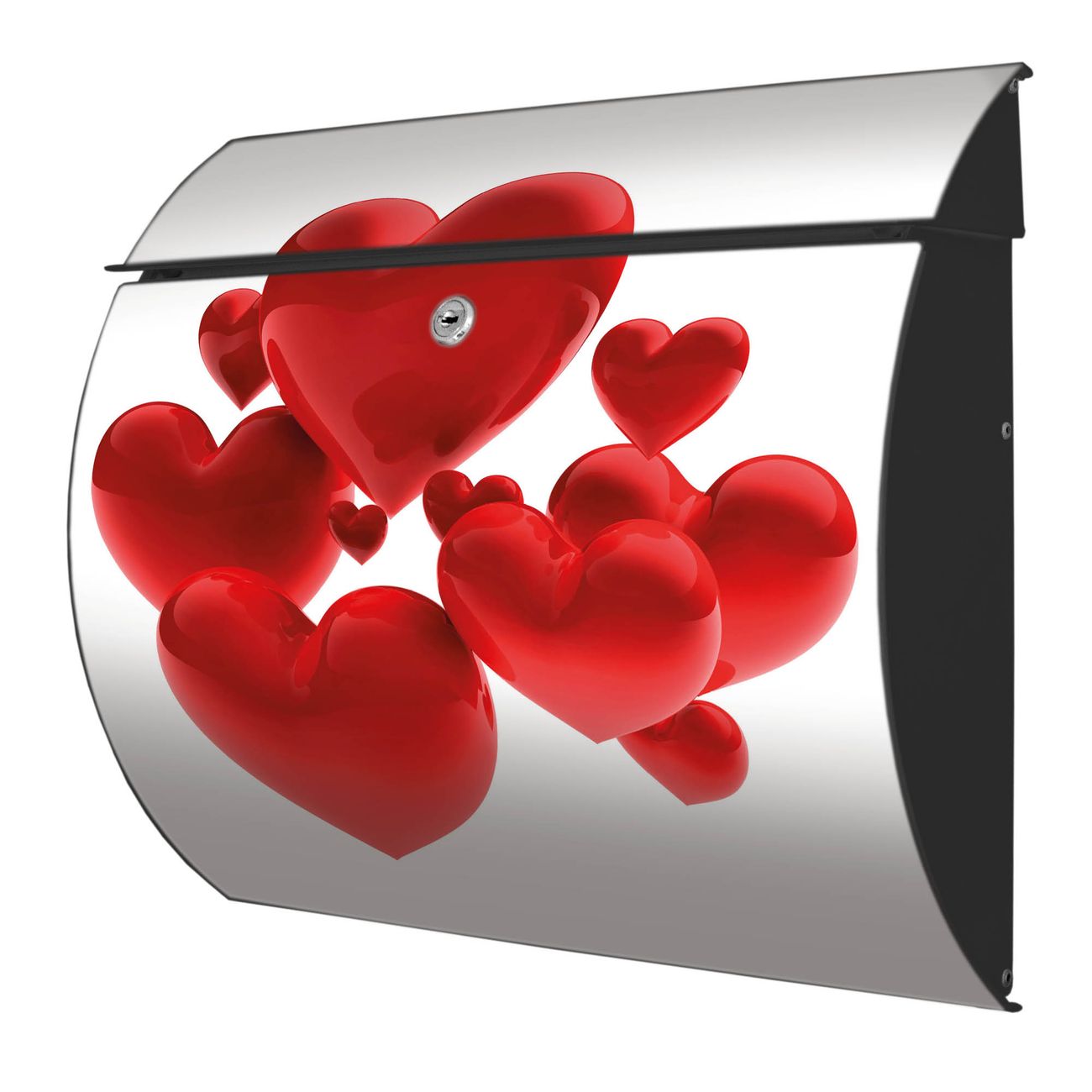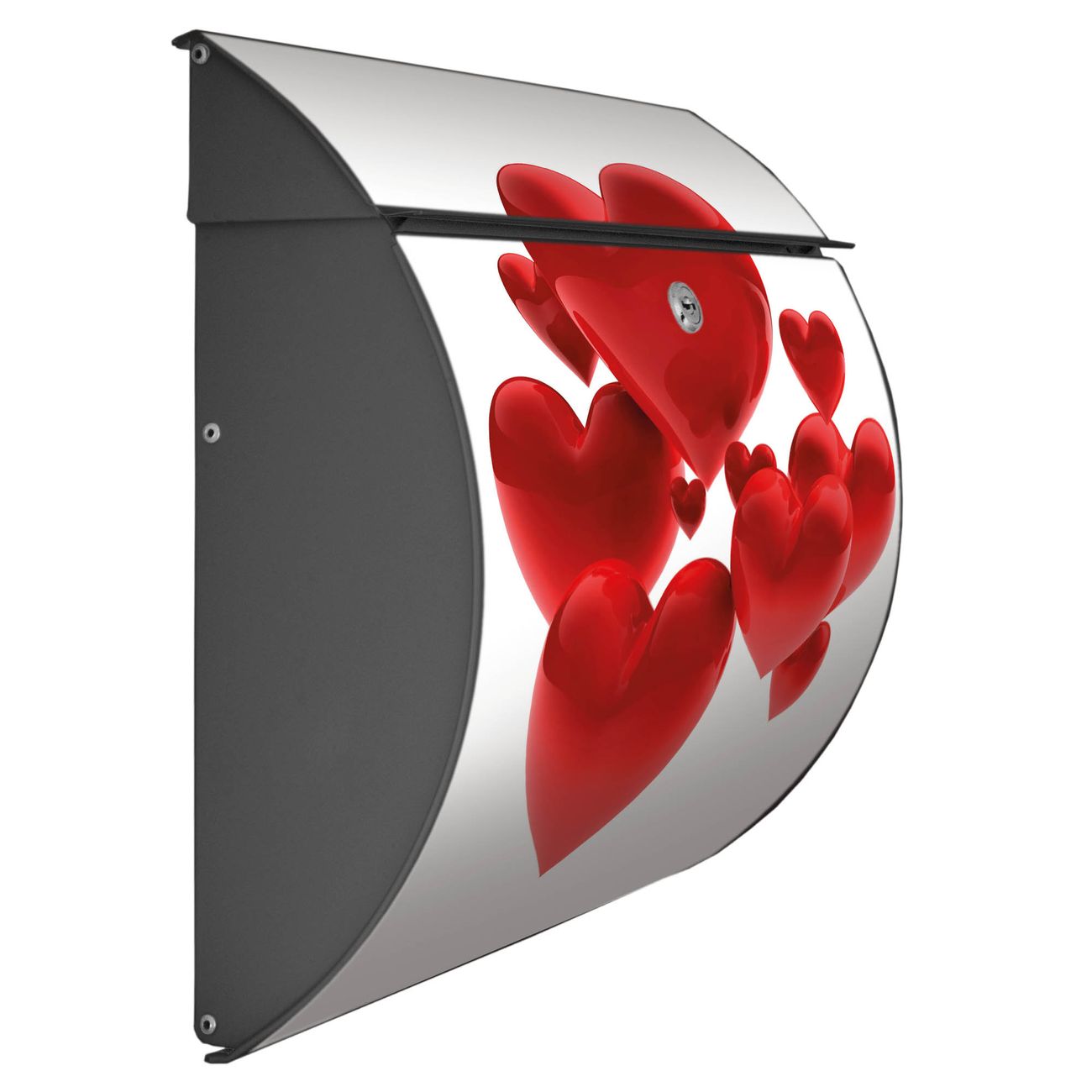 FUNKTION: DESIGN: Das Burg Wächter Modell Toscana mit Motiv Fliegende Herzen hat ein sehr ansprechendes und zeitloses Design und ist besonderes wetterfest. Heben Sie Sich von der tristen grauen Masse ab, ohne auf Funktionalität zu verzichten. Wir bieten Ihnen ebenfalls Namensschilder, bereits beschriftet oder frei zu beschriften, und verschiedene selbst gestaltete Bitte-Keine-Werbung-Aufkleber. DETAILS: Der Postkasten besteht aus vollflächig verzinktem Stahl welcher in Anthrazit oder Weiß lackiert wurde oder aus Edelstahl (je nach gewählter Variante). Das Motiv besteht aus einer wetter- und UV-festen Folie, die mit einem Schutzlaminat überzogen ist, durch die Ihren Briefkasten zusätzlich vor Kratzern geschützt ist und auf den Briefkasten kaschiert wurde. Sie erhalten zu Ihrem neuen Design Briefkasten 2 Schlüssel sowie das passende Montagematerial. BANJADO: Ihr Briefkasten wird von Burg Wächter in Deutschland gefertigt und in unserer kleinen Manufaktur von Hand veredelt. Die Motivfolie ist lösungsmittelfrei und schutzlaminiert, dies sorgt für einen langen Halt. Wir legen großen Wert auf die Verbindung von Funktionalität und Design. Sie erhalten besondere Handarbeit aus Sachsen und Made in Germany.