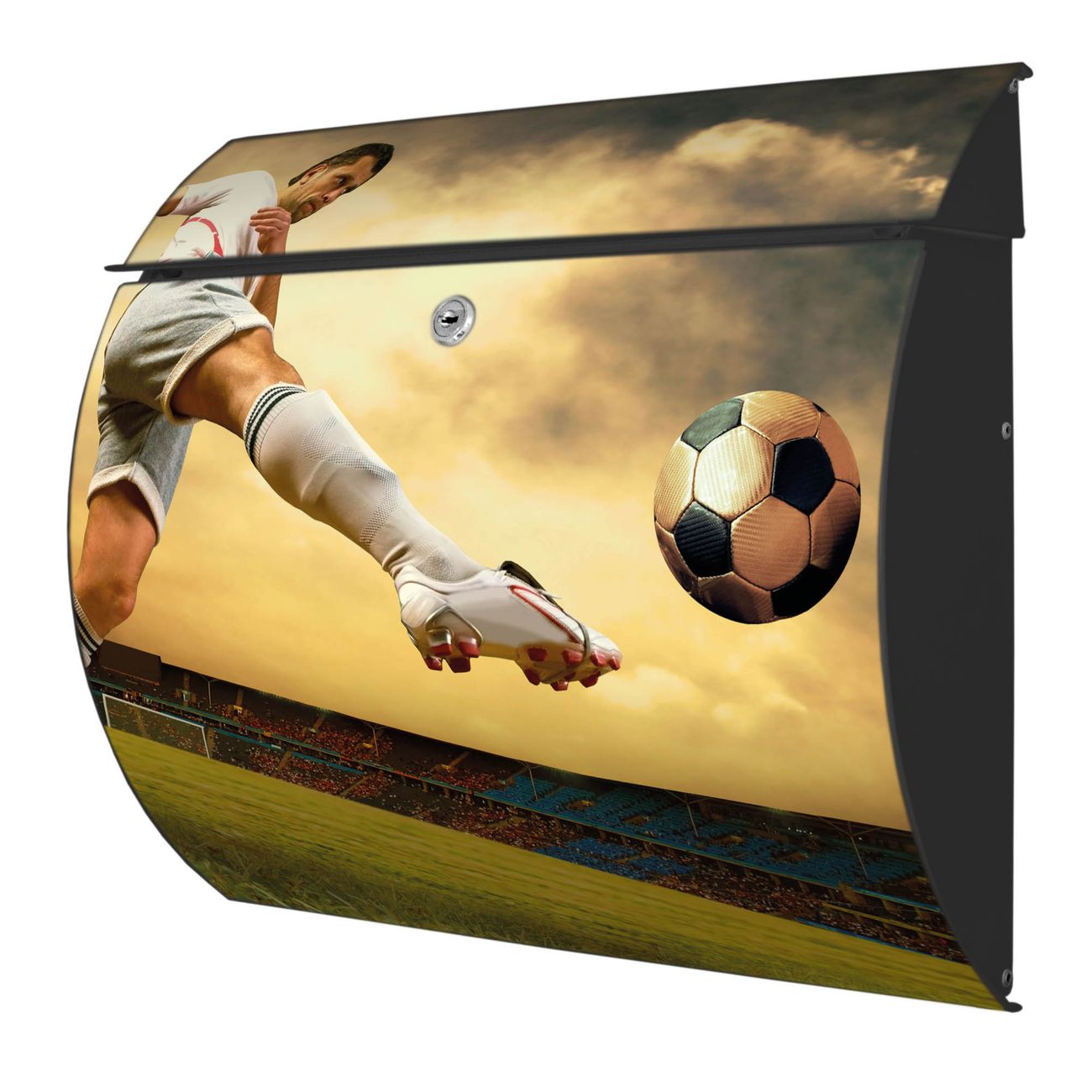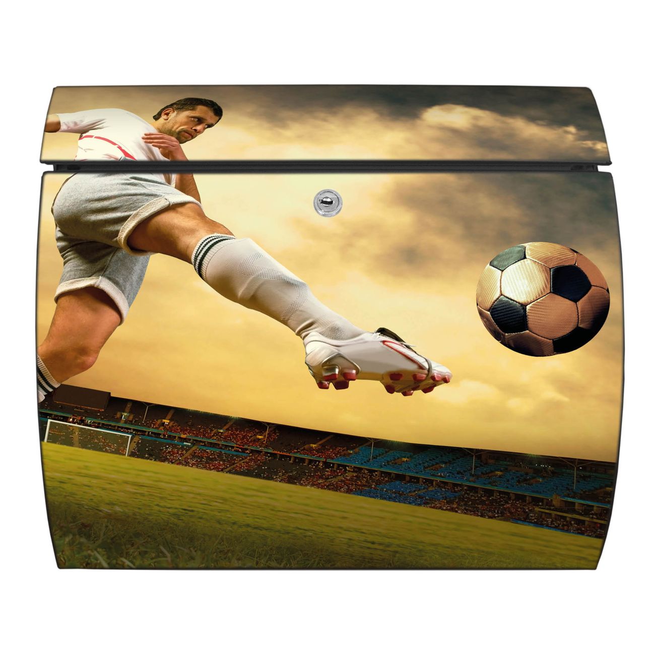 Der geschwungene Burg Wächter Briefkasten Toscana mit Motiv Football bietet Ihnen mit seinem großen Fassungsvermögen genügend Platz auch für große A4 Sendungen. Auf Wunsch können Sie bei uns den passenden Standfuß bestellen und so aus dem Wandbriefkasten einen Standbriefkasten machen. Der integrierte Öffnungsstopp ermöglicht eine einfache Handhabung beim Entnehmen der Post.