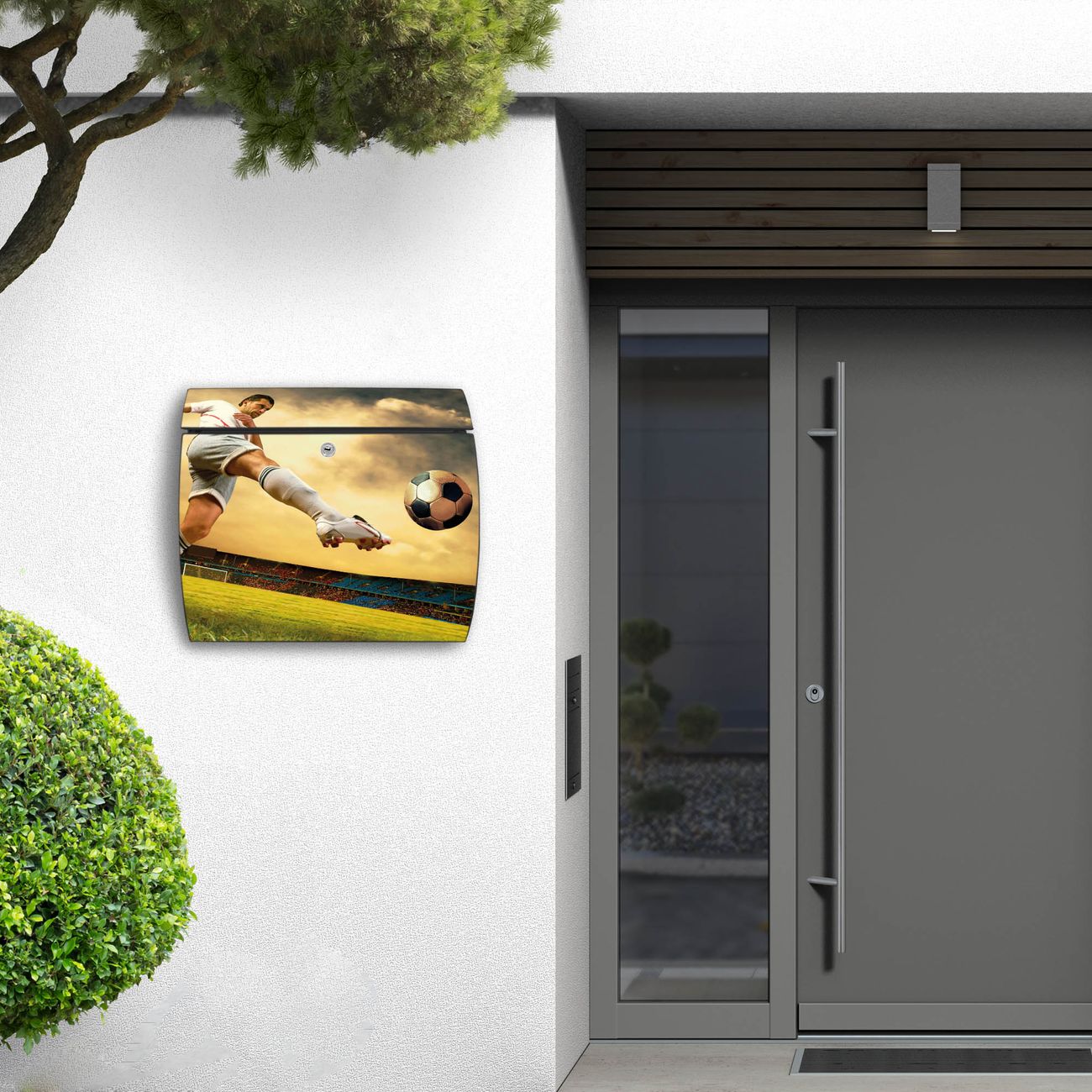 FUNKTION: DESIGN: Das Burg Wächter Modell Toscana mit Motiv Football hat ein sehr ansprechendes und zeitloses Design und ist besonderes wetterfest. Heben Sie Sich von der tristen grauen Masse ab, ohne auf Funktionalität zu verzichten. Wir bieten Ihnen ebenfalls Namensschilder, bereits beschriftet oder frei zu beschriften, und verschiedene selbst gestaltete Bitte-Keine-Werbung-Aufkleber. DETAILS: Der Postkasten besteht aus vollflächig verzinktem Stahl welcher in Anthrazit oder Weiß lackiert wurde oder aus Edelstahl (je nach gewählter Variante). Das Motiv besteht aus einer wetter- und UV-festen Folie, die mit einem Schutzlaminat überzogen ist, durch die Ihren Briefkasten zusätzlich vor Kratzern geschützt ist und auf den Briefkasten kaschiert wurde. Sie erhalten zu Ihrem neuen Design Briefkasten 2 Schlüssel sowie das passende Montagematerial. BANJADO: Ihr Briefkasten wird von Burg Wächter in Deutschland gefertigt und in unserer kleinen Manufaktur von Hand veredelt. Die Motivfolie ist lösungsmittelfrei und schutzlaminiert, dies sorgt für einen langen Halt. Wir legen großen Wert auf die Verbindung von Funktionalität und Design. Sie erhalten besondere Handarbeit aus Sachsen und Made in Germany.