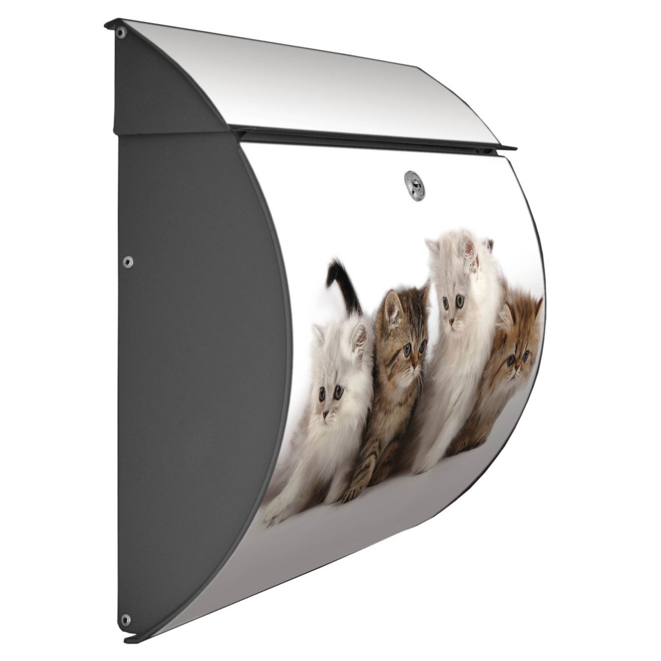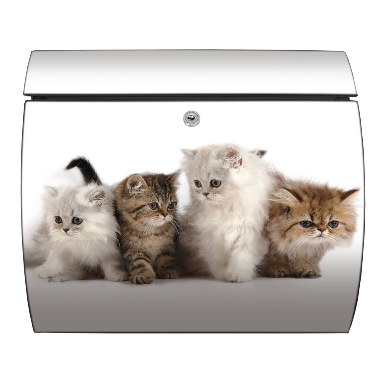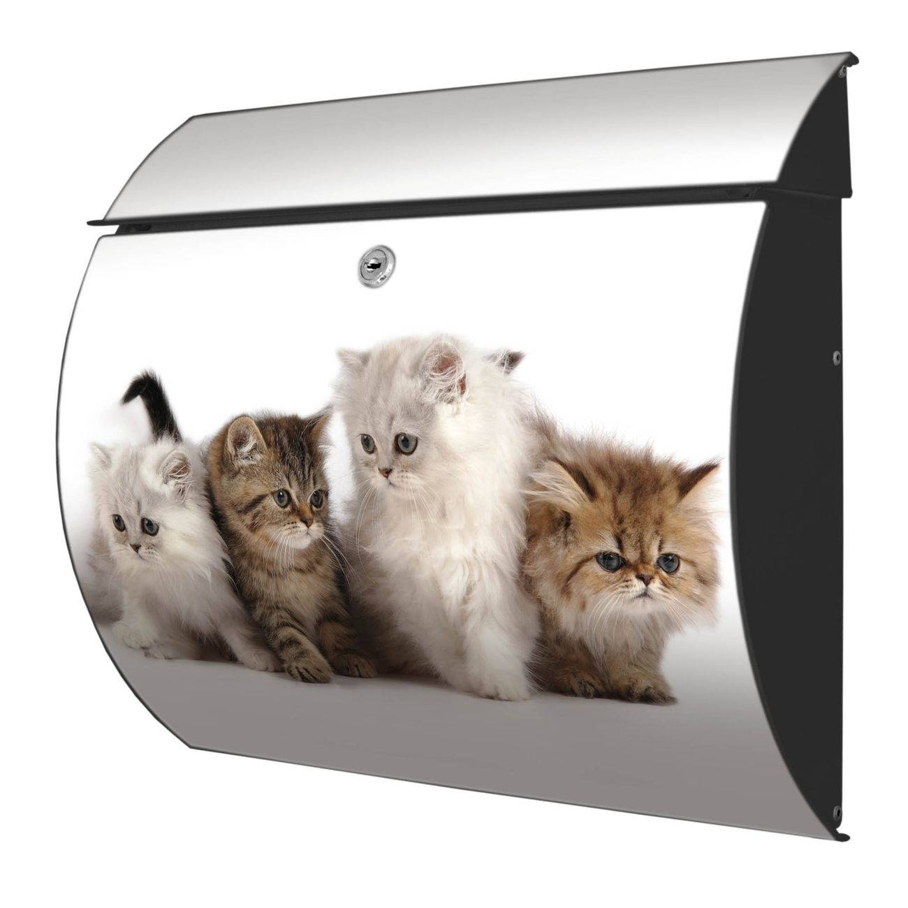 FUNKTION: DESIGN: Das Burg Wächter Modell Toscana mit Motiv Kaetzchen hat ein sehr ansprechendes und zeitloses Design und ist besonderes wetterfest. Heben Sie Sich von der tristen grauen Masse ab, ohne auf Funktionalität zu verzichten. Wir bieten Ihnen ebenfalls Namensschilder, bereits beschriftet oder frei zu beschriften, und verschiedene selbst gestaltete Bitte-Keine-Werbung-Aufkleber. DETAILS: Der Postkasten besteht aus vollflächig verzinktem Stahl welcher in Anthrazit oder Weiß lackiert wurde oder aus Edelstahl (je nach gewählter Variante). Das Motiv besteht aus einer wetter- und UV-festen Folie, die mit einem Schutzlaminat überzogen ist, durch die Ihren Briefkasten zusätzlich vor Kratzern geschützt ist und auf den Briefkasten kaschiert wurde. Sie erhalten zu Ihrem neuen Design Briefkasten 2 Schlüssel sowie das passende Montagematerial. BANJADO: Ihr Briefkasten wird von Burg Wächter in Deutschland gefertigt und in unserer kleinen Manufaktur von Hand veredelt. Die Motivfolie ist lösungsmittelfrei und schutzlaminiert, dies sorgt für einen langen Halt. Wir legen großen Wert auf die Verbindung von Funktionalität und Design. Sie erhalten besondere Handarbeit aus Sachsen und Made in Germany.