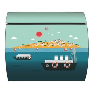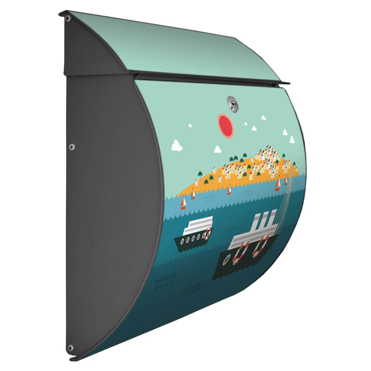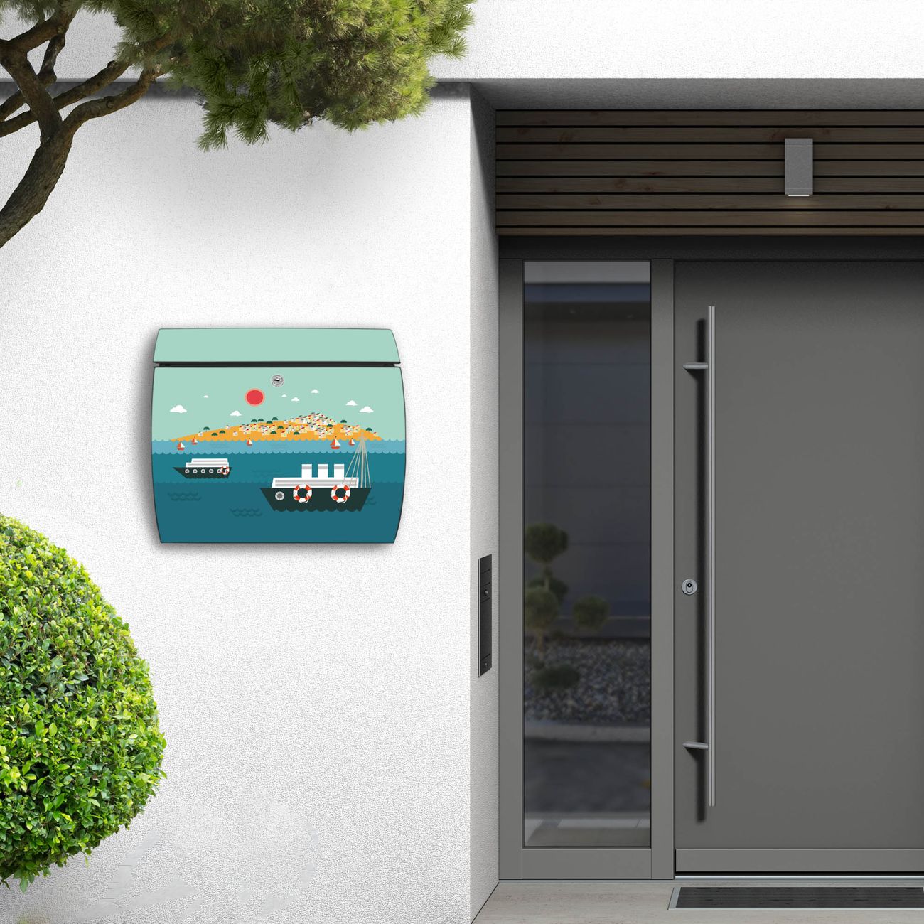 FUNKTION: DESIGN: Das Burg Wächter Modell Toscana mit Motiv Land in Sicht hat ein sehr ansprechendes und zeitloses Design und ist besonderes wetterfest. Heben Sie Sich von der tristen grauen Masse ab, ohne auf Funktionalität zu verzichten. Wir bieten Ihnen ebenfalls Namensschilder, bereits beschriftet oder frei zu beschriften, und verschiedene selbst gestaltete Bitte-Keine-Werbung-Aufkleber. DETAILS: Der Postkasten besteht aus vollflächig verzinktem Stahl welcher in Anthrazit oder Weiß lackiert wurde oder aus Edelstahl (je nach gewählter Variante). Das Motiv besteht aus einer wetter- und UV-festen Folie, die mit einem Schutzlaminat überzogen ist, durch die Ihren Briefkasten zusätzlich vor Kratzern geschützt ist und auf den Briefkasten kaschiert wurde. Sie erhalten zu Ihrem neuen Design Briefkasten 2 Schlüssel sowie das passende Montagematerial. BANJADO: Ihr Briefkasten wird von Burg Wächter in Deutschland gefertigt und in unserer kleinen Manufaktur von Hand veredelt. Die Motivfolie ist lösungsmittelfrei und schutzlaminiert, dies sorgt für einen langen Halt. Wir legen großen Wert auf die Verbindung von Funktionalität und Design. Sie erhalten besondere Handarbeit aus Sachsen und Made in Germany.