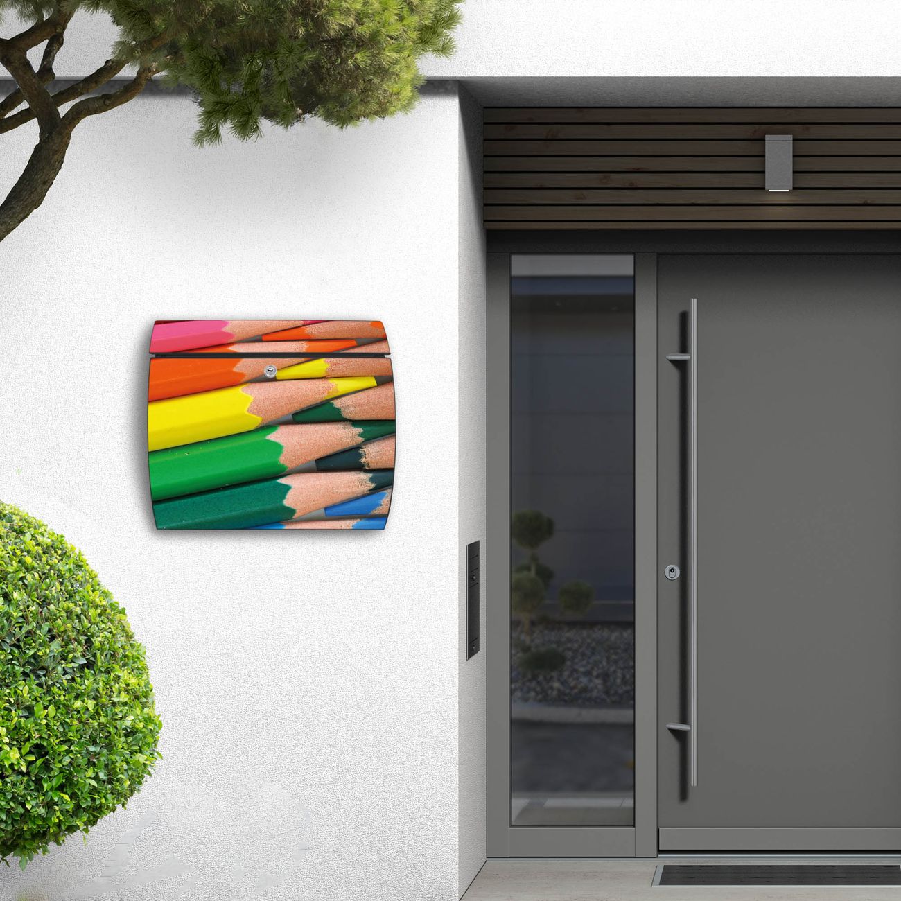 Der geschwungene Burg Wächter Briefkasten Toscana mit Motiv Malstifte bietet Ihnen mit seinem großen Fassungsvermögen genügend Platz auch für große A4 Sendungen. Auf Wunsch können Sie bei uns den passenden Standfuß bestellen und so aus dem Wandbriefkasten einen Standbriefkasten machen. Der integrierte Öffnungsstopp ermöglicht eine einfache Handhabung beim Entnehmen der Post.