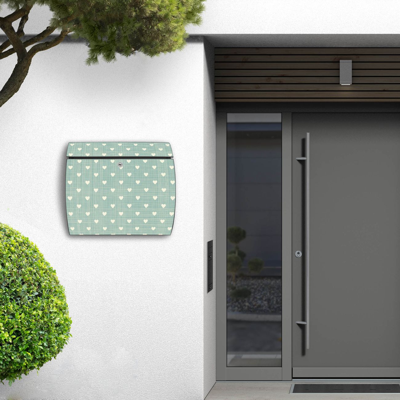 FUNKTION: DESIGN: Das Burg Wächter Modell Toscana mit Motiv Muster Herzen hat ein sehr ansprechendes und zeitloses Design und ist besonderes wetterfest. Heben Sie Sich von der tristen grauen Masse ab, ohne auf Funktionalität zu verzichten. Wir bieten Ihnen ebenfalls Namensschilder, bereits beschriftet oder frei zu beschriften, und verschiedene selbst gestaltete Bitte-Keine-Werbung-Aufkleber. DETAILS: Der Postkasten besteht aus vollflächig verzinktem Stahl welcher in Anthrazit oder Weiß lackiert wurde oder aus Edelstahl (je nach gewählter Variante). Das Motiv besteht aus einer wetter- und UV-festen Folie, die mit einem Schutzlaminat überzogen ist, durch die Ihren Briefkasten zusätzlich vor Kratzern geschützt ist und auf den Briefkasten kaschiert wurde. Sie erhalten zu Ihrem neuen Design Briefkasten 2 Schlüssel sowie das passende Montagematerial. BANJADO: Ihr Briefkasten wird von Burg Wächter in Deutschland gefertigt und in unserer kleinen Manufaktur von Hand veredelt. Die Motivfolie ist lösungsmittelfrei und schutzlaminiert, dies sorgt für einen langen Halt. Wir legen großen Wert auf die Verbindung von Funktionalität und Design. Sie erhalten besondere Handarbeit aus Sachsen und Made in Germany.