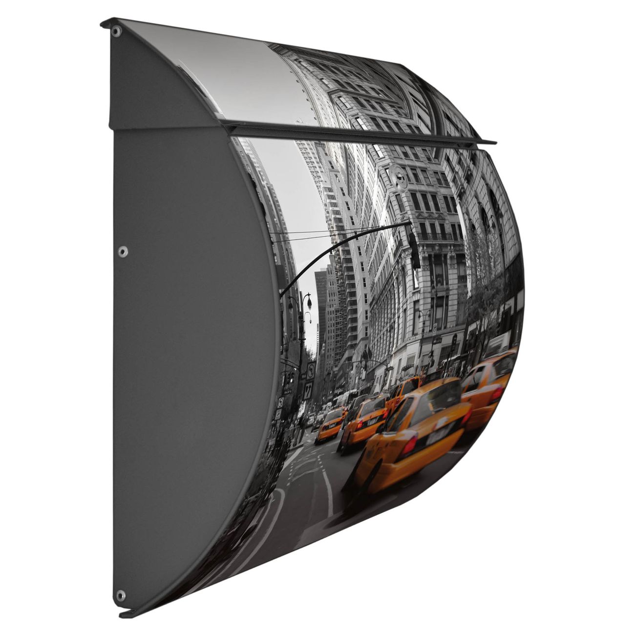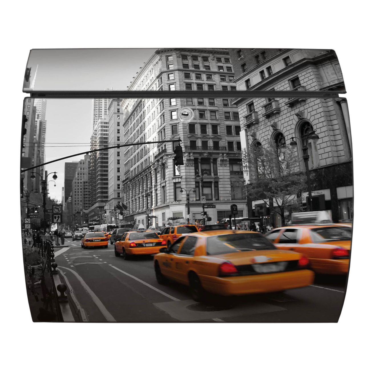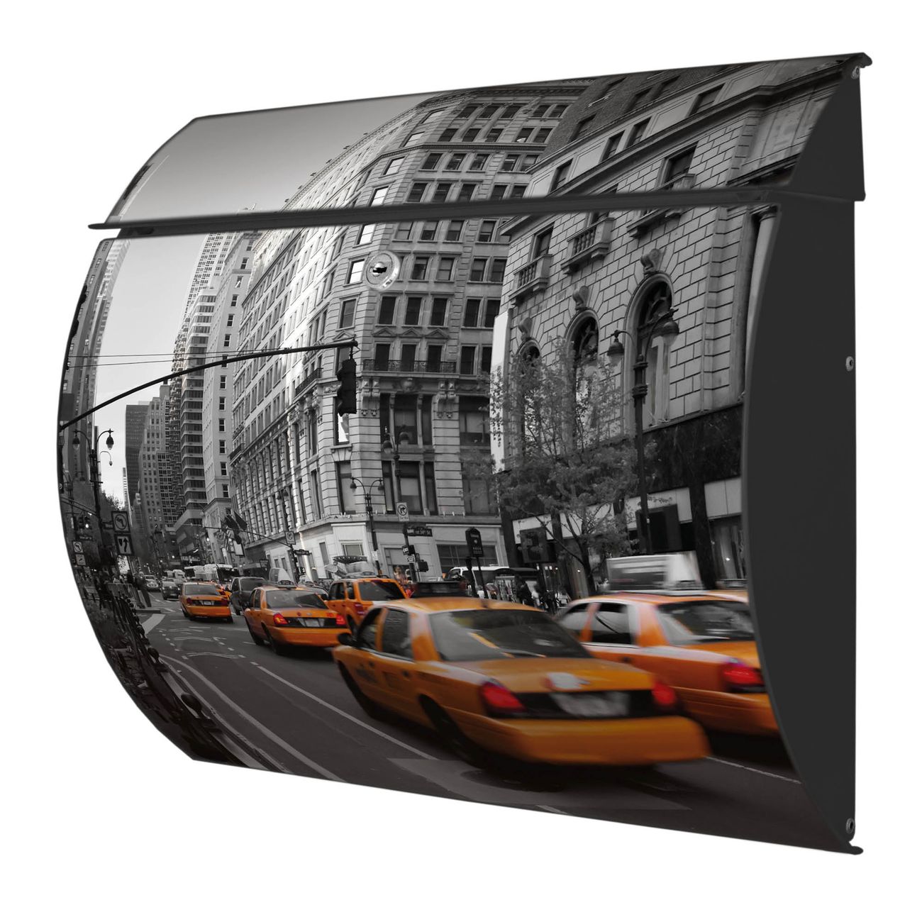 Der geschwungene Burg Wächter Briefkasten Toscana mit Motiv New York Taxi bietet Ihnen mit seinem großen Fassungsvermögen genügend Platz auch für große A4 Sendungen. Auf Wunsch können Sie bei uns den passenden Standfuß bestellen und so aus dem Wandbriefkasten einen Standbriefkasten machen. Der integrierte Öffnungsstopp ermöglicht eine einfache Handhabung beim Entnehmen der Post.