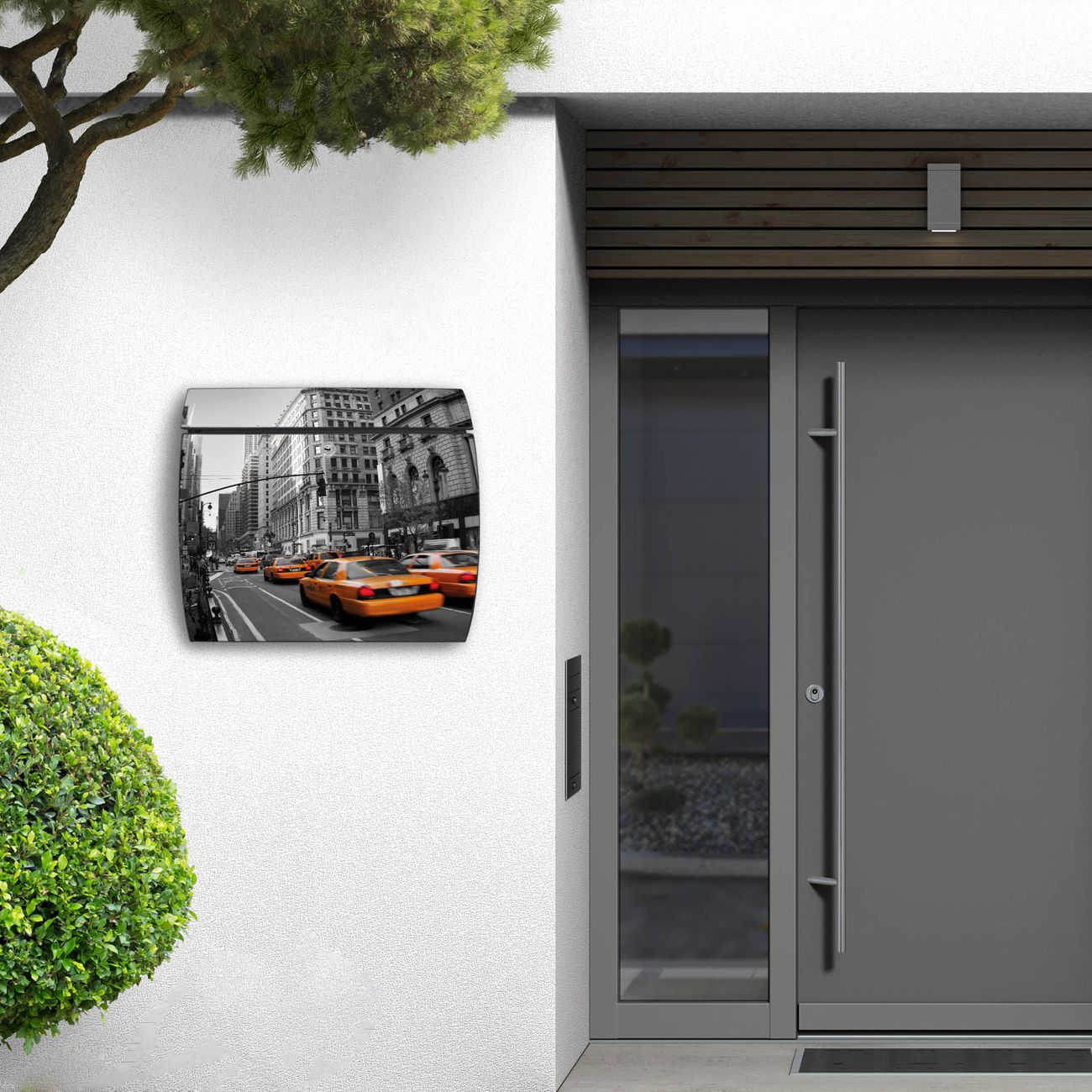 FUNKTION: DESIGN: Das Burg Wächter Modell Toscana mit Motiv New York Taxi hat ein sehr ansprechendes und zeitloses Design und ist besonderes wetterfest. Heben Sie Sich von der tristen grauen Masse ab, ohne auf Funktionalität zu verzichten. Wir bieten Ihnen ebenfalls Namensschilder, bereits beschriftet oder frei zu beschriften, und verschiedene selbst gestaltete Bitte-Keine-Werbung-Aufkleber. DETAILS: Der Postkasten besteht aus vollflächig verzinktem Stahl welcher in Anthrazit oder Weiß lackiert wurde oder aus Edelstahl (je nach gewählter Variante). Das Motiv besteht aus einer wetter- und UV-festen Folie, die mit einem Schutzlaminat überzogen ist, durch die Ihren Briefkasten zusätzlich vor Kratzern geschützt ist und auf den Briefkasten kaschiert wurde. Sie erhalten zu Ihrem neuen Design Briefkasten 2 Schlüssel sowie das passende Montagematerial. BANJADO: Ihr Briefkasten wird von Burg Wächter in Deutschland gefertigt und in unserer kleinen Manufaktur von Hand veredelt. Die Motivfolie ist lösungsmittelfrei und schutzlaminiert, dies sorgt für einen langen Halt. Wir legen großen Wert auf die Verbindung von Funktionalität und Design. Sie erhalten besondere Handarbeit aus Sachsen und Made in Germany.