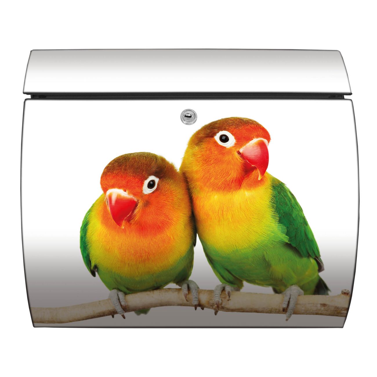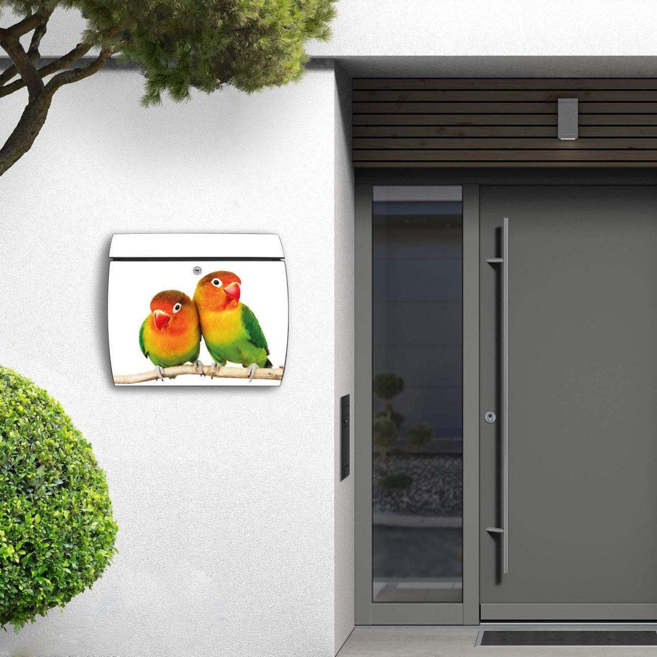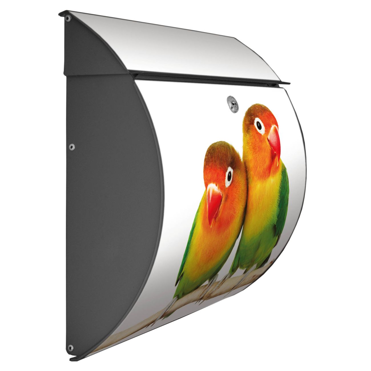 FUNKTION: DESIGN: Das Burg Wächter Modell Toscana mit Motiv Papageien hat ein sehr ansprechendes und zeitloses Design und ist besonderes wetterfest. Heben Sie Sich von der tristen grauen Masse ab, ohne auf Funktionalität zu verzichten. Wir bieten Ihnen ebenfalls Namensschilder, bereits beschriftet oder frei zu beschriften, und verschiedene selbst gestaltete Bitte-Keine-Werbung-Aufkleber. DETAILS: Der Postkasten besteht aus vollflächig verzinktem Stahl welcher in Anthrazit oder Weiß lackiert wurde oder aus Edelstahl (je nach gewählter Variante). Das Motiv besteht aus einer wetter- und UV-festen Folie, die mit einem Schutzlaminat überzogen ist, durch die Ihren Briefkasten zusätzlich vor Kratzern geschützt ist und auf den Briefkasten kaschiert wurde. Sie erhalten zu Ihrem neuen Design Briefkasten 2 Schlüssel sowie das passende Montagematerial. BANJADO: Ihr Briefkasten wird von Burg Wächter in Deutschland gefertigt und in unserer kleinen Manufaktur von Hand veredelt. Die Motivfolie ist lösungsmittelfrei und schutzlaminiert, dies sorgt für einen langen Halt. Wir legen großen Wert auf die Verbindung von Funktionalität und Design. Sie erhalten besondere Handarbeit aus Sachsen und Made in Germany.