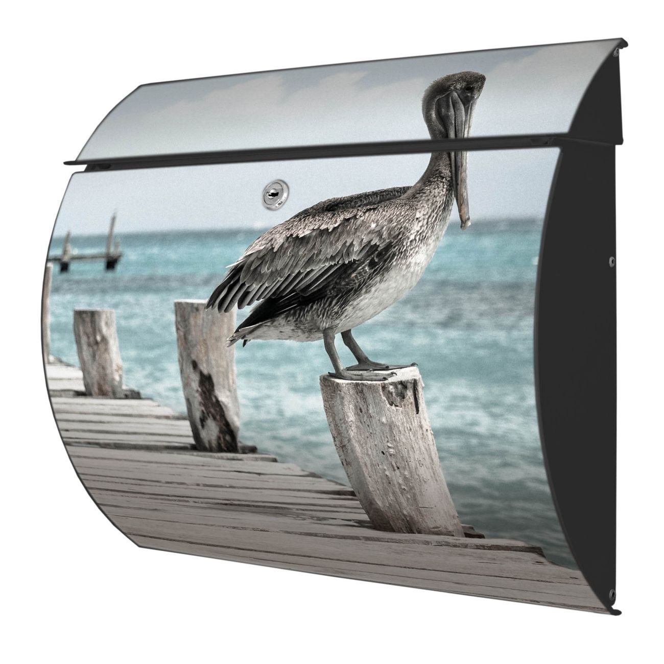Der geschwungene Burg Wächter Briefkasten Toscana mit Motiv Pelikane bietet Ihnen mit seinem großen Fassungsvermögen genügend Platz auch für große A4 Sendungen. Auf Wunsch können Sie bei uns den passenden Standfuß bestellen und so aus dem Wandbriefkasten einen Standbriefkasten machen. Der integrierte Öffnungsstopp ermöglicht eine einfache Handhabung beim Entnehmen der Post.