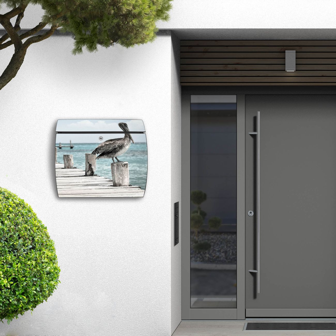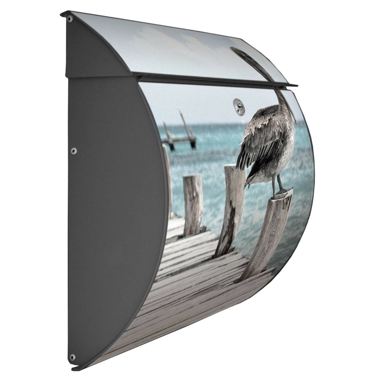 FUNKTION: DESIGN: Das Burg Wächter Modell Toscana mit Motiv Pelikane hat ein sehr ansprechendes und zeitloses Design und ist besonderes wetterfest. Heben Sie Sich von der tristen grauen Masse ab, ohne auf Funktionalität zu verzichten. Wir bieten Ihnen ebenfalls Namensschilder, bereits beschriftet oder frei zu beschriften, und verschiedene selbst gestaltete Bitte-Keine-Werbung-Aufkleber. DETAILS: Der Postkasten besteht aus vollflächig verzinktem Stahl welcher in Anthrazit oder Weiß lackiert wurde oder aus Edelstahl (je nach gewählter Variante). Das Motiv besteht aus einer wetter- und UV-festen Folie, die mit einem Schutzlaminat überzogen ist, durch die Ihren Briefkasten zusätzlich vor Kratzern geschützt ist und auf den Briefkasten kaschiert wurde. Sie erhalten zu Ihrem neuen Design Briefkasten 2 Schlüssel sowie das passende Montagematerial. BANJADO: Ihr Briefkasten wird von Burg Wächter in Deutschland gefertigt und in unserer kleinen Manufaktur von Hand veredelt. Die Motivfolie ist lösungsmittelfrei und schutzlaminiert, dies sorgt für einen langen Halt. Wir legen großen Wert auf die Verbindung von Funktionalität und Design. Sie erhalten besondere Handarbeit aus Sachsen und Made in Germany.