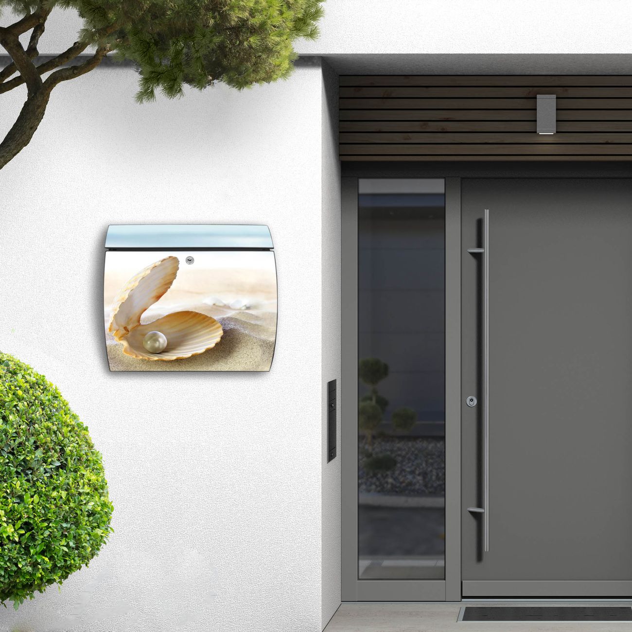 FUNKTION: DESIGN: Das Burg Wächter Modell Toscana mit Motiv Perlenmuschel hat ein sehr ansprechendes und zeitloses Design und ist besonderes wetterfest. Heben Sie Sich von der tristen grauen Masse ab, ohne auf Funktionalität zu verzichten. Wir bieten Ihnen ebenfalls Namensschilder, bereits beschriftet oder frei zu beschriften, und verschiedene selbst gestaltete Bitte-Keine-Werbung-Aufkleber. DETAILS: Der Postkasten besteht aus vollflächig verzinktem Stahl welcher in Anthrazit oder Weiß lackiert wurde oder aus Edelstahl (je nach gewählter Variante). Das Motiv besteht aus einer wetter- und UV-festen Folie, die mit einem Schutzlaminat überzogen ist, durch die Ihren Briefkasten zusätzlich vor Kratzern geschützt ist und auf den Briefkasten kaschiert wurde. Sie erhalten zu Ihrem neuen Design Briefkasten 2 Schlüssel sowie das passende Montagematerial. BANJADO: Ihr Briefkasten wird von Burg Wächter in Deutschland gefertigt und in unserer kleinen Manufaktur von Hand veredelt. Die Motivfolie ist lösungsmittelfrei und schutzlaminiert, dies sorgt für einen langen Halt. Wir legen großen Wert auf die Verbindung von Funktionalität und Design. Sie erhalten besondere Handarbeit aus Sachsen und Made in Germany.
