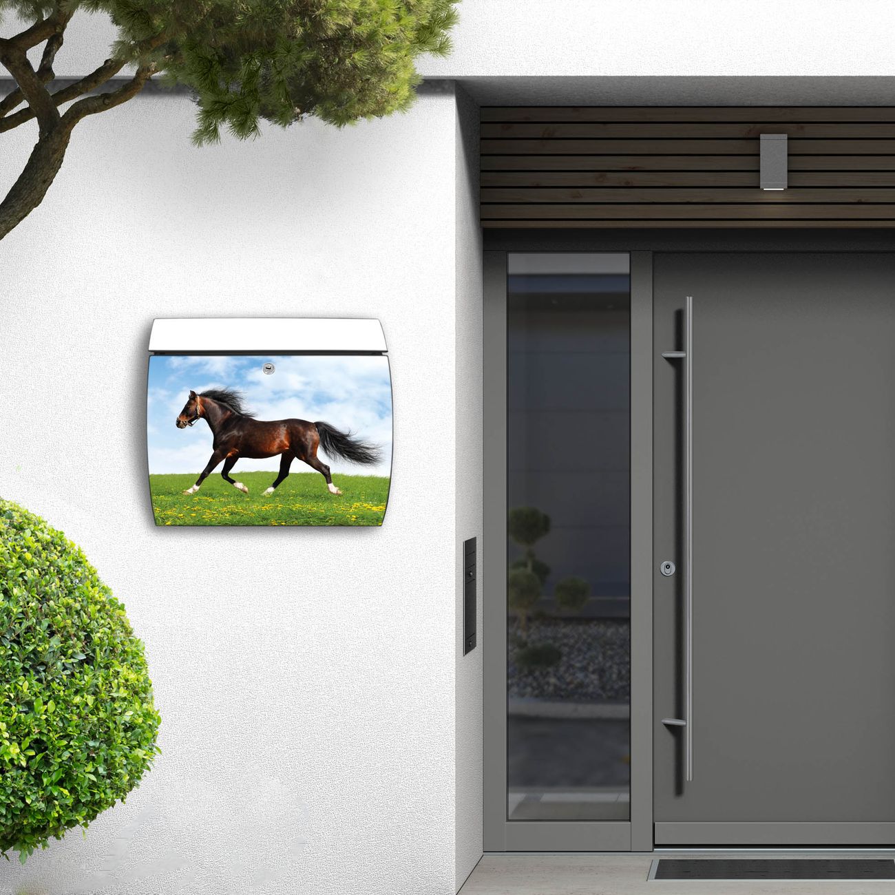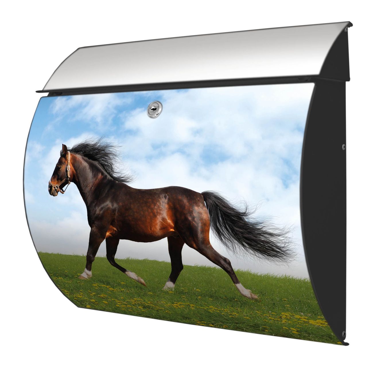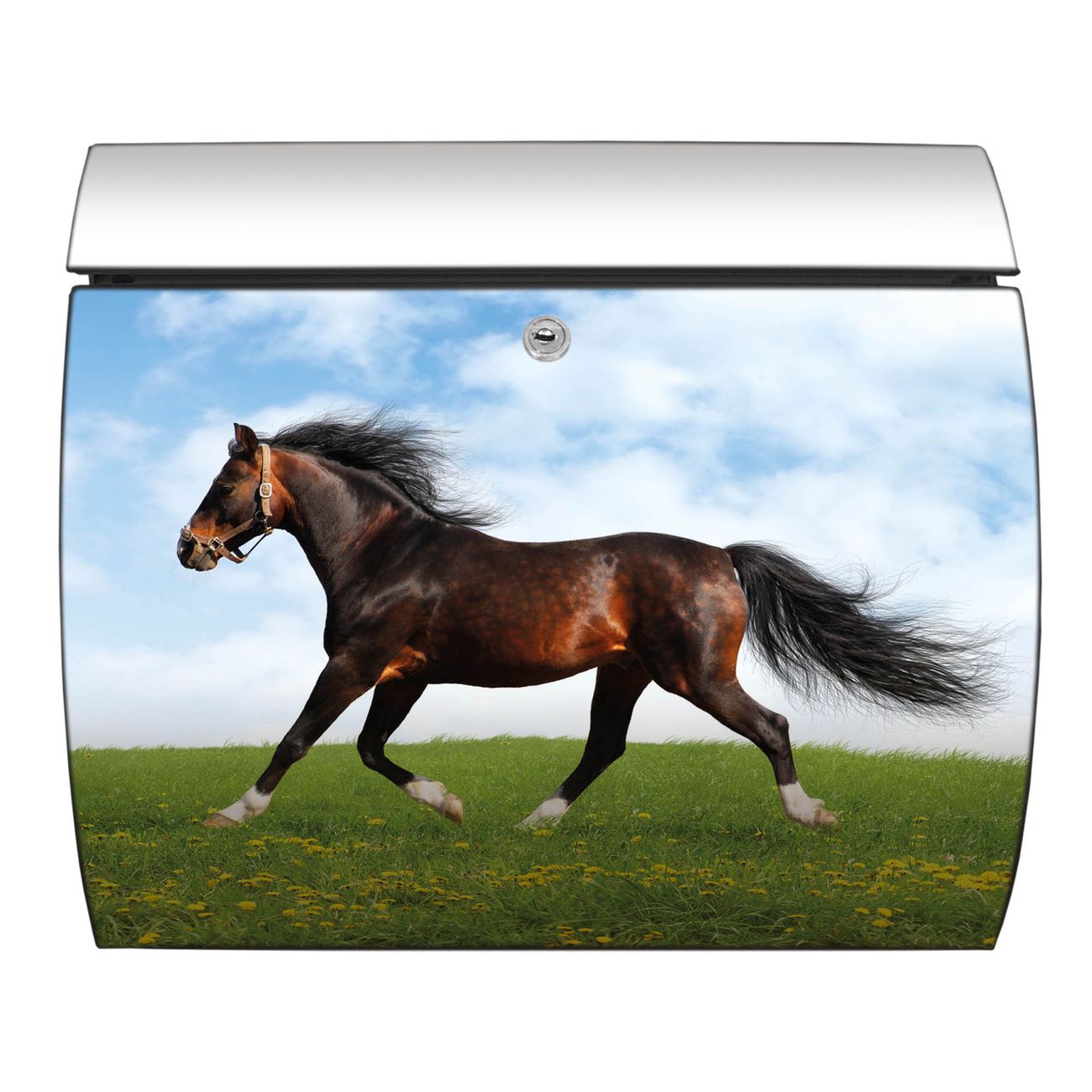 FUNKTION: DESIGN: Das Burg Wächter Modell Toscana mit Motiv Pferd hat ein sehr ansprechendes und zeitloses Design und ist besonderes wetterfest. Heben Sie Sich von der tristen grauen Masse ab, ohne auf Funktionalität zu verzichten. Wir bieten Ihnen ebenfalls Namensschilder, bereits beschriftet oder frei zu beschriften, und verschiedene selbst gestaltete Bitte-Keine-Werbung-Aufkleber. DETAILS: Der Postkasten besteht aus vollflächig verzinktem Stahl welcher in Anthrazit oder Weiß lackiert wurde oder aus Edelstahl (je nach gewählter Variante). Das Motiv besteht aus einer wetter- und UV-festen Folie, die mit einem Schutzlaminat überzogen ist, durch die Ihren Briefkasten zusätzlich vor Kratzern geschützt ist und auf den Briefkasten kaschiert wurde. Sie erhalten zu Ihrem neuen Design Briefkasten 2 Schlüssel sowie das passende Montagematerial. BANJADO: Ihr Briefkasten wird von Burg Wächter in Deutschland gefertigt und in unserer kleinen Manufaktur von Hand veredelt. Die Motivfolie ist lösungsmittelfrei und schutzlaminiert, dies sorgt für einen langen Halt. Wir legen großen Wert auf die Verbindung von Funktionalität und Design. Sie erhalten besondere Handarbeit aus Sachsen und Made in Germany.