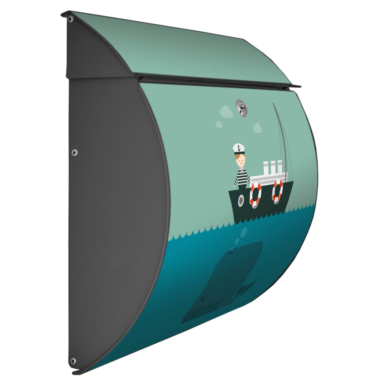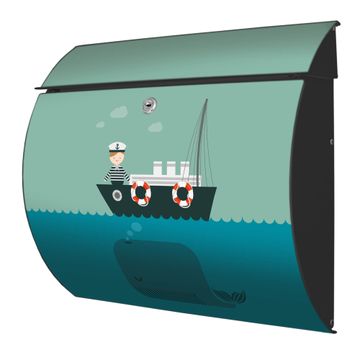 Der geschwungene Burg Wächter Briefkasten Toscana mit Motiv Rettet die Wale bietet Ihnen mit seinem großen Fassungsvermögen genügend Platz auch für große A4 Sendungen. Auf Wunsch können Sie bei uns den passenden Standfuß bestellen und so aus dem Wandbriefkasten einen Standbriefkasten machen. Der integrierte Öffnungsstopp ermöglicht eine einfache Handhabung beim Entnehmen der Post.