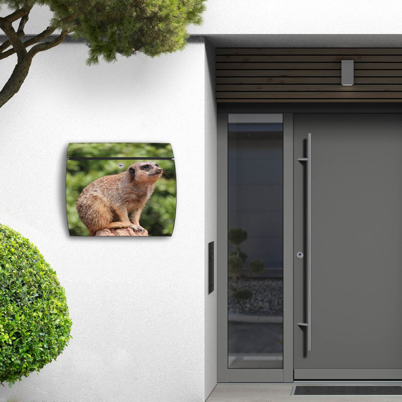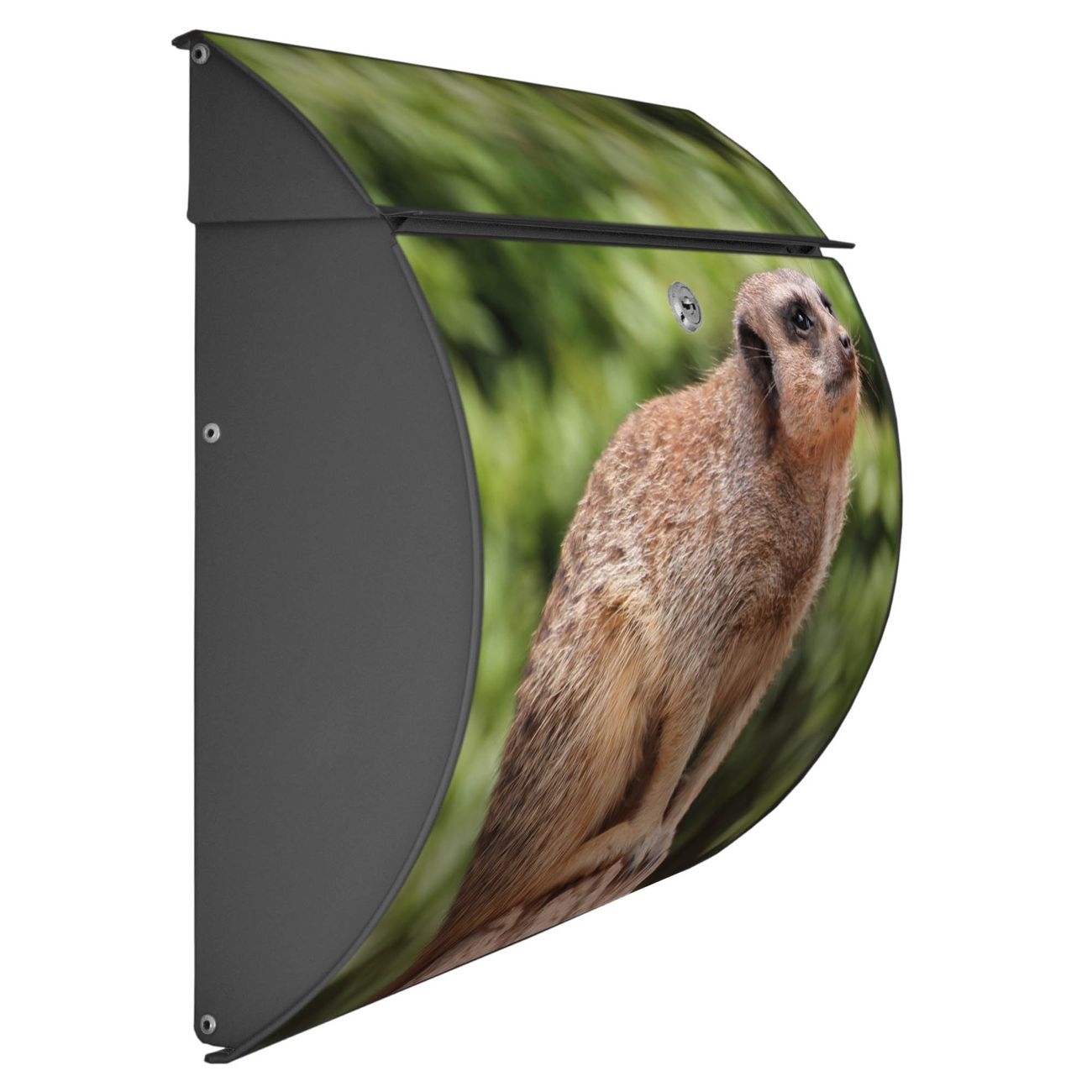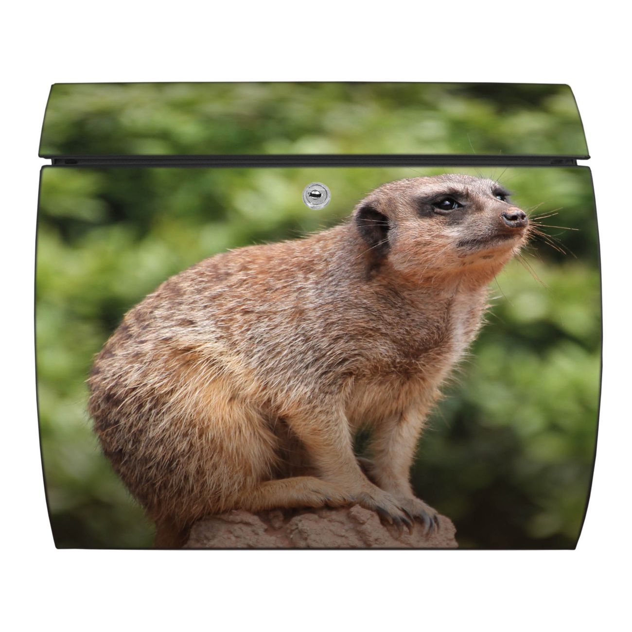 FUNKTION: DESIGN: Das Burg Wächter Modell Toscana mit Motiv Sitzendes Erdmännchen hat ein sehr ansprechendes und zeitloses Design und ist besonderes wetterfest. Heben Sie Sich von der tristen grauen Masse ab, ohne auf Funktionalität zu verzichten. Wir bieten Ihnen ebenfalls Namensschilder, bereits beschriftet oder frei zu beschriften, und verschiedene selbst gestaltete Bitte-Keine-Werbung-Aufkleber. DETAILS: Der Postkasten besteht aus vollflächig verzinktem Stahl welcher in Anthrazit oder Weiß lackiert wurde oder aus Edelstahl (je nach gewählter Variante). Das Motiv besteht aus einer wetter- und UV-festen Folie, die mit einem Schutzlaminat überzogen ist, durch die Ihren Briefkasten zusätzlich vor Kratzern geschützt ist und auf den Briefkasten kaschiert wurde. Sie erhalten zu Ihrem neuen Design Briefkasten 2 Schlüssel sowie das passende Montagematerial. BANJADO: Ihr Briefkasten wird von Burg Wächter in Deutschland gefertigt und in unserer kleinen Manufaktur von Hand veredelt. Die Motivfolie ist lösungsmittelfrei und schutzlaminiert, dies sorgt für einen langen Halt. Wir legen großen Wert auf die Verbindung von Funktionalität und Design. Sie erhalten besondere Handarbeit aus Sachsen und Made in Germany.