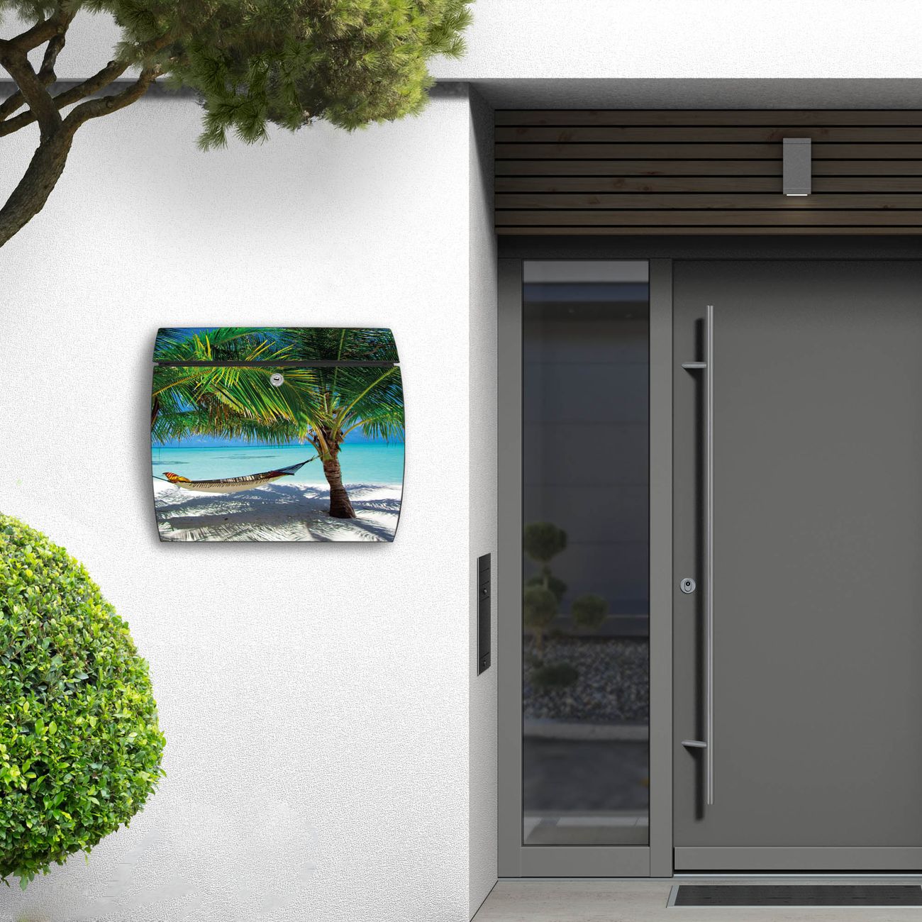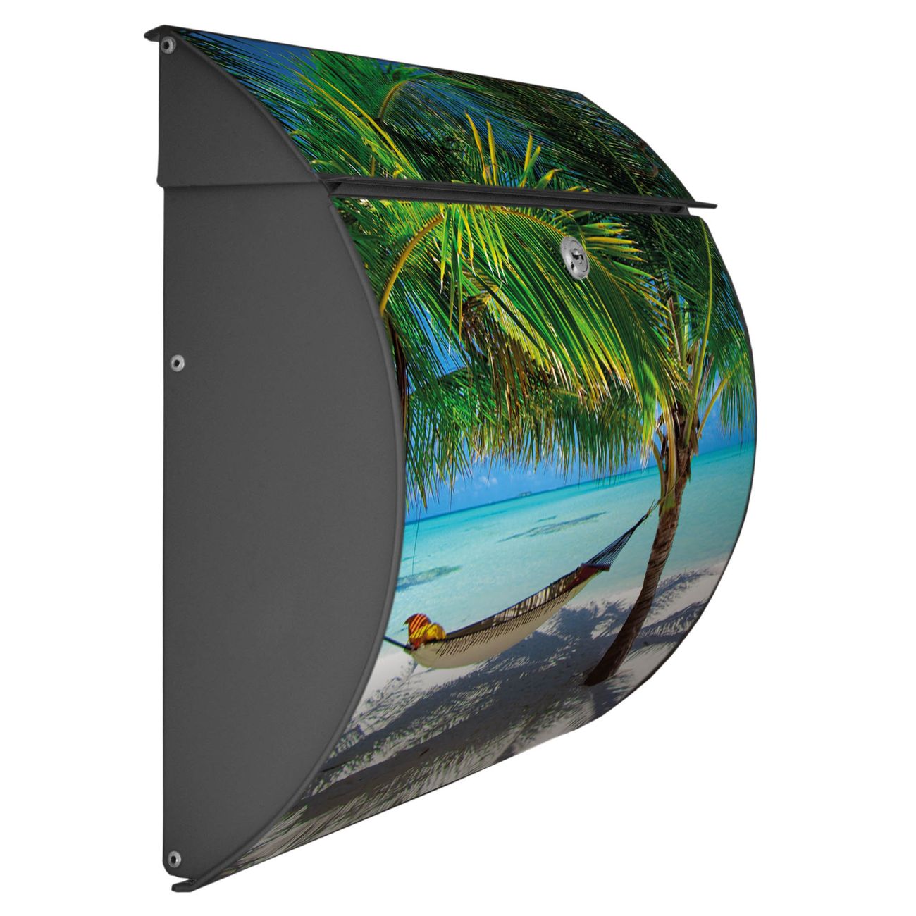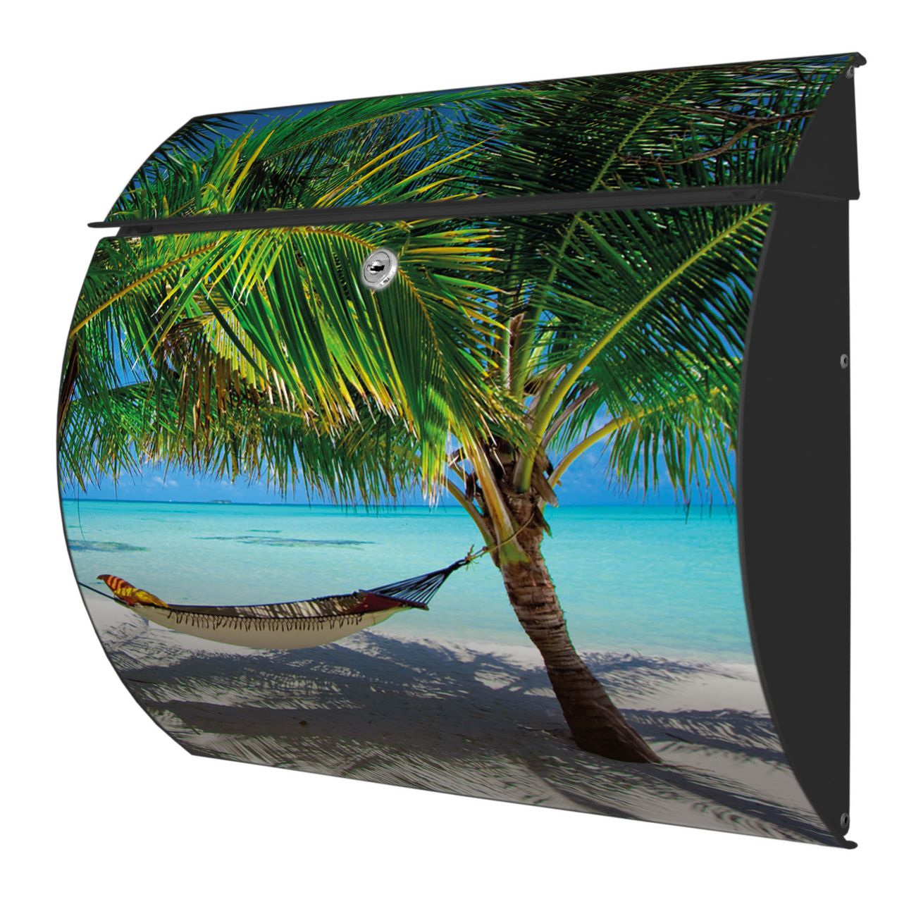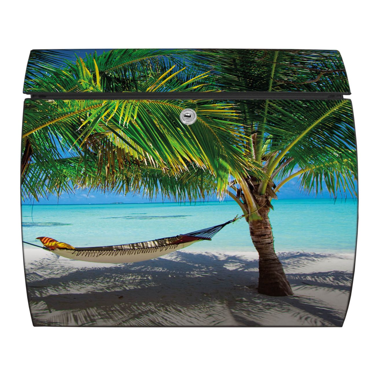 FUNKTION: DESIGN: Das Burg Wächter Modell Toscana mit Motiv Strand hat ein sehr ansprechendes und zeitloses Design und ist besonderes wetterfest. Heben Sie Sich von der tristen grauen Masse ab, ohne auf Funktionalität zu verzichten. Wir bieten Ihnen ebenfalls Namensschilder, bereits beschriftet oder frei zu beschriften, und verschiedene selbst gestaltete Bitte-Keine-Werbung-Aufkleber. DETAILS: Der Postkasten besteht aus vollflächig verzinktem Stahl welcher in Anthrazit oder Weiß lackiert wurde oder aus Edelstahl (je nach gewählter Variante). Das Motiv besteht aus einer wetter- und UV-festen Folie, die mit einem Schutzlaminat überzogen ist, durch die Ihren Briefkasten zusätzlich vor Kratzern geschützt ist und auf den Briefkasten kaschiert wurde. Sie erhalten zu Ihrem neuen Design Briefkasten 2 Schlüssel sowie das passende Montagematerial. BANJADO: Ihr Briefkasten wird von Burg Wächter in Deutschland gefertigt und in unserer kleinen Manufaktur von Hand veredelt. Die Motivfolie ist lösungsmittelfrei und schutzlaminiert, dies sorgt für einen langen Halt. Wir legen großen Wert auf die Verbindung von Funktionalität und Design. Sie erhalten besondere Handarbeit aus Sachsen und Made in Germany.