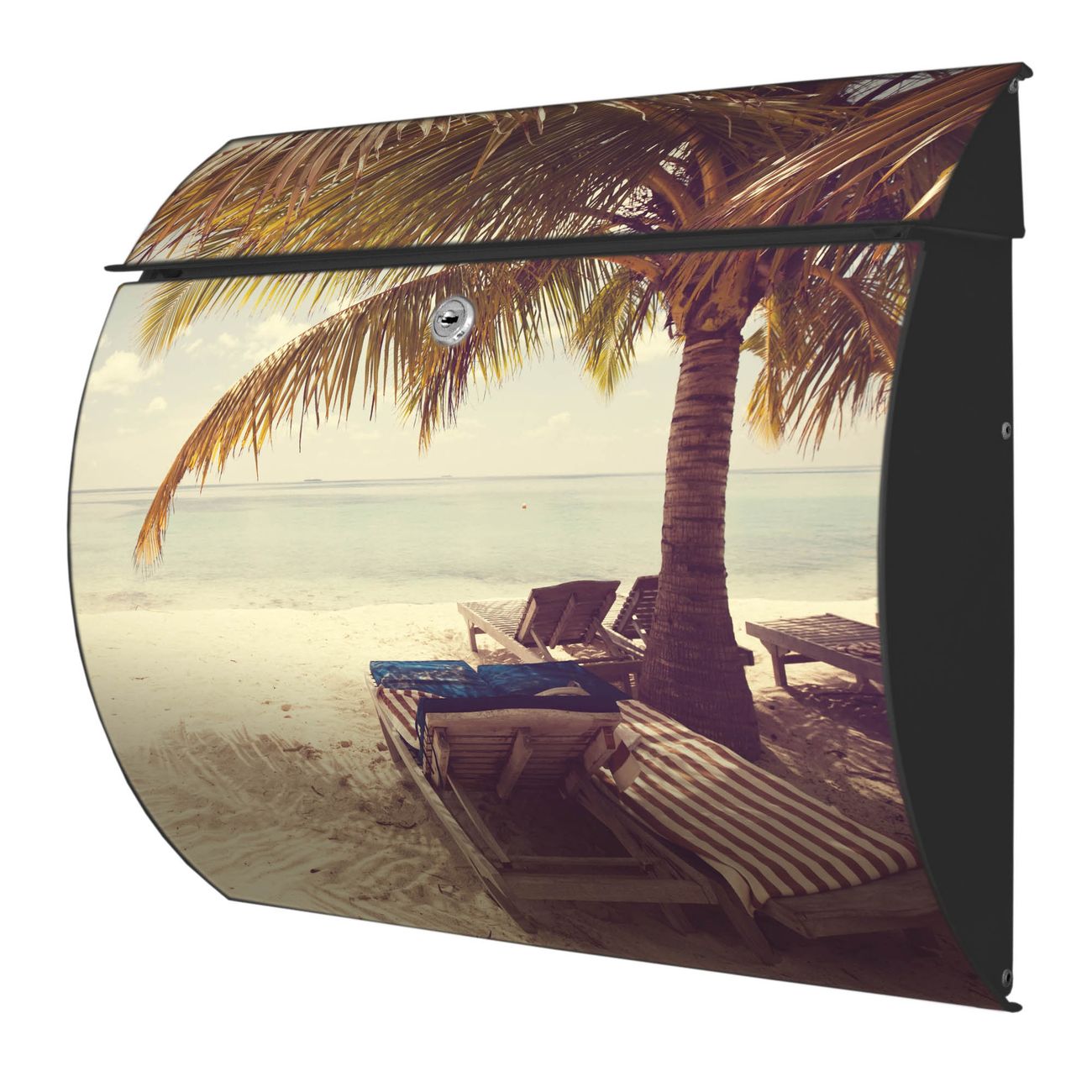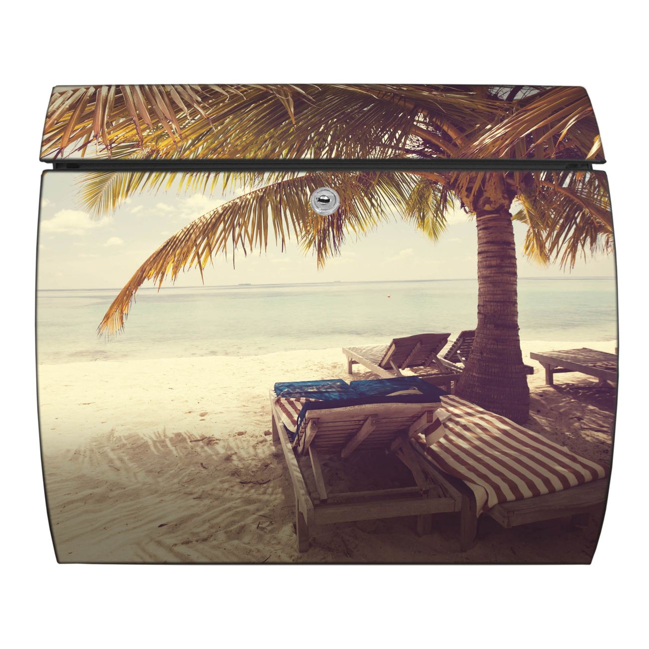 Der geschwungene Burg Wächter Briefkasten Toscana mit Motiv Südseestrand bietet Ihnen mit seinem großen Fassungsvermögen genügend Platz auch für große A4 Sendungen. Auf Wunsch können Sie bei uns den passenden Standfuß bestellen und so aus dem Wandbriefkasten einen Standbriefkasten machen. Der integrierte Öffnungsstopp ermöglicht eine einfache Handhabung beim Entnehmen der Post.